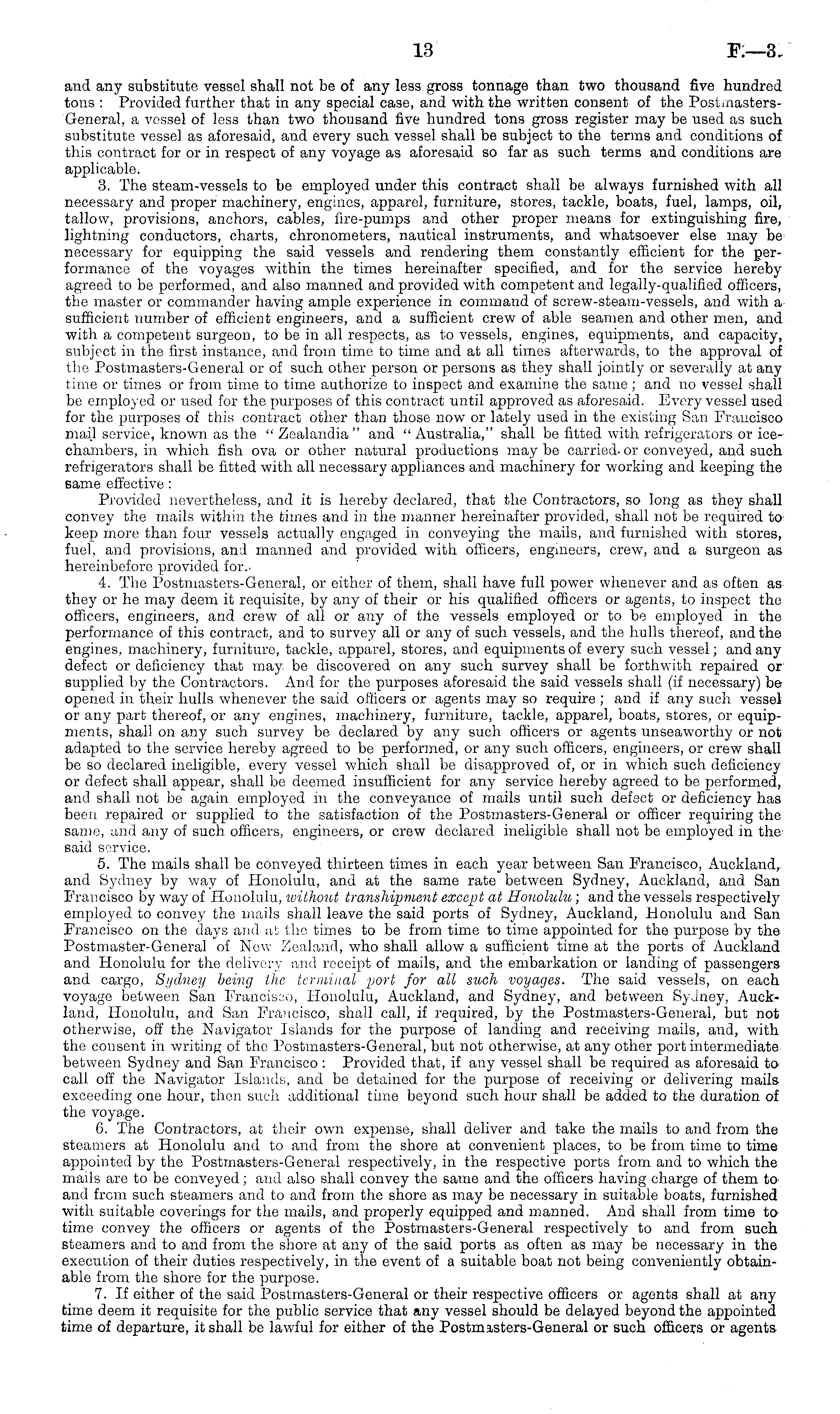 and any substitute vessel shall not be of any less gross tonnage than two thousand five hundred tons : Provided further that in any special case, and with the written consent of the PostrnasterßGeneral, a vessel of less than two thousand five hundred tons gross register may be used as such substitute vessel as aforesaid, and every such vessel shall be subject to the terms and conditions of this contract for or in respect of any voyage as aforesaid so far as such terms and conditions are applicable. 3. The steam-vessels to be employed under this contract shall be always furnished with all necessary and proper machinery, engines, apparel, furniture, stores, tackle, boats, fuel, lamps, oil, tallow, provisions, anchors, cables, lire-pumps and other proper means for extinguishing fire, lightning conductors, charts, chronometers, nautical instruments, and whatsoever else may be necessary for equipping the said vessels and rendering them constantly efficient for the performance of the voyages within the times hereinafter specified, and for the service hereby agreed to be performed, and also manned and provided with competent and legally-qualified officers, the master or commander having ample experience in command of screw-steam-vessels, and with a sufficient number of efficient engineers, and a sufficient crew of able seamen and other men, and with a competent surgeon, to be in all respects, as to vessels, engines, equipments, and capacity, subject in the first instance, and from time to time and at all times afterwards, to the approval of the Postmasters-General or of such other person or persons as they shall jointly or severally at any time or times or from time to time authorize to inspect and examine the same ; and no vessel shall be employed or used for the purposes of this contract until approved as aforesaid. Every vessel used for the purposes of this contract other than those now or lately used in the existing San Francisco mail service, known as the " Zealandia " and "Australia," shall be fitted with refrigerators or icechambers, in which fish ova or other natural productions may be carried- or conveyed, and such refrigerators shall be fitted with all necessary appliances and machinery for working and keeping the same effective : Provided nevertheless, and it is hereby declared, that the Contractors, so long as they shall convey the mails within the times and in the manner hereinafter provided, shall not be required to keep more than four vessels actually engaged in conveying the mails, and furnished with stores, fuel, and provisions, and manned and provided with officers, engineers, crew, and a surgeon as hereinbefore provided for.4. The Postmasters-General, or either of them, shall have full power whenever and as often as they or he may deem it requisite, by any of their or his qualified officers or agents, to inspect the officers, engineers, and crow of all or any of the vessels employed or to be employed in the performance of this contract, and to survey all or any of such vessels, and the hulls thereof, and the engines, machinery, furniture, tackle, apparel, stores, and equipments of every such vessel; and any defect or deficiency that may be discovered on any such survey shall be forthwith repaired or supplied by the Contractors. And for the purposes aforesaid the said vessels shall (if necessary) be opened in their hulls whenever the said officers or agents may so require ; and if any such vessel or any part thereof, or any engines, machinery, furniture, tackle, apparel, boats, stores, or equipments, shall on any such survey be declared by any such officers or agents unseaworthy or not adapted to the service hereby agreed to be performed, or any such officers, engineers, or crow shall be so declared ineligible,- every vessel which shall be disapproved of, or in which such deficiency or defect shall appear, shall be deemed insufficient for any service hereby agreed to be performed, and shall not be again employed in the conveyance of mails until such defect or deficiency has been repaired or supplied to the satisfaction of the Postmasters-General or officer requiring the same, and any of such officers, engineers, or crew declared ineligible shall not be employed in the said service. 5. The mails shall be conveyed thirteen times in each year between San Francisco, Auckland, and Sydney by way of Honolulu, and at the same rate between Sydney, Auckland, and San Francisco by way of Honolulu, without transhipment except at Honolulu ; and the vessels respectively employed to convey the mails shall leave the said ports of Sydney, Auckland, Honolulu and San Francisco on the days and at the times to be from time to time appointed for the purpose by the Postmaster-General of New Zealand, who shall allow a sufficient time at the ports of Auckland and Honolulu for the delivery and receipt of mails, and the embarkation or landing of passengers and cargo, Sydney being the terminal port for all such voyages. The said vessels, on each voyage between San Francisco, Honolulu, Auckland, and Sydney, and between Sydney, Auckland, Honolulu, and San Francisco, shall call, if required, by the Postmasters-General, but not otherwise, off the Navigator Islands for the purpose of landing and receiving mails, and, with the consent in writing of the Postmasters-General, but not otherwise, at any other port intermediate between Sydney and San Francisco : Provided that, if any vessel shall be required as aforesaid to call off the Navigator Islands, and be detained for the purpose of receiving or delivering mails exceeding one hour, then such additional time beyond such hour shall be added to the duration of the voyage. G. The Contractors, at their own expense, shall deliver and take the mails to and from the steamers at Honolulu and to and from the shore at convenient places, to be from time to time appointed by the Postmasters-General respectively, in the respective ports from and to which the mails are to b
