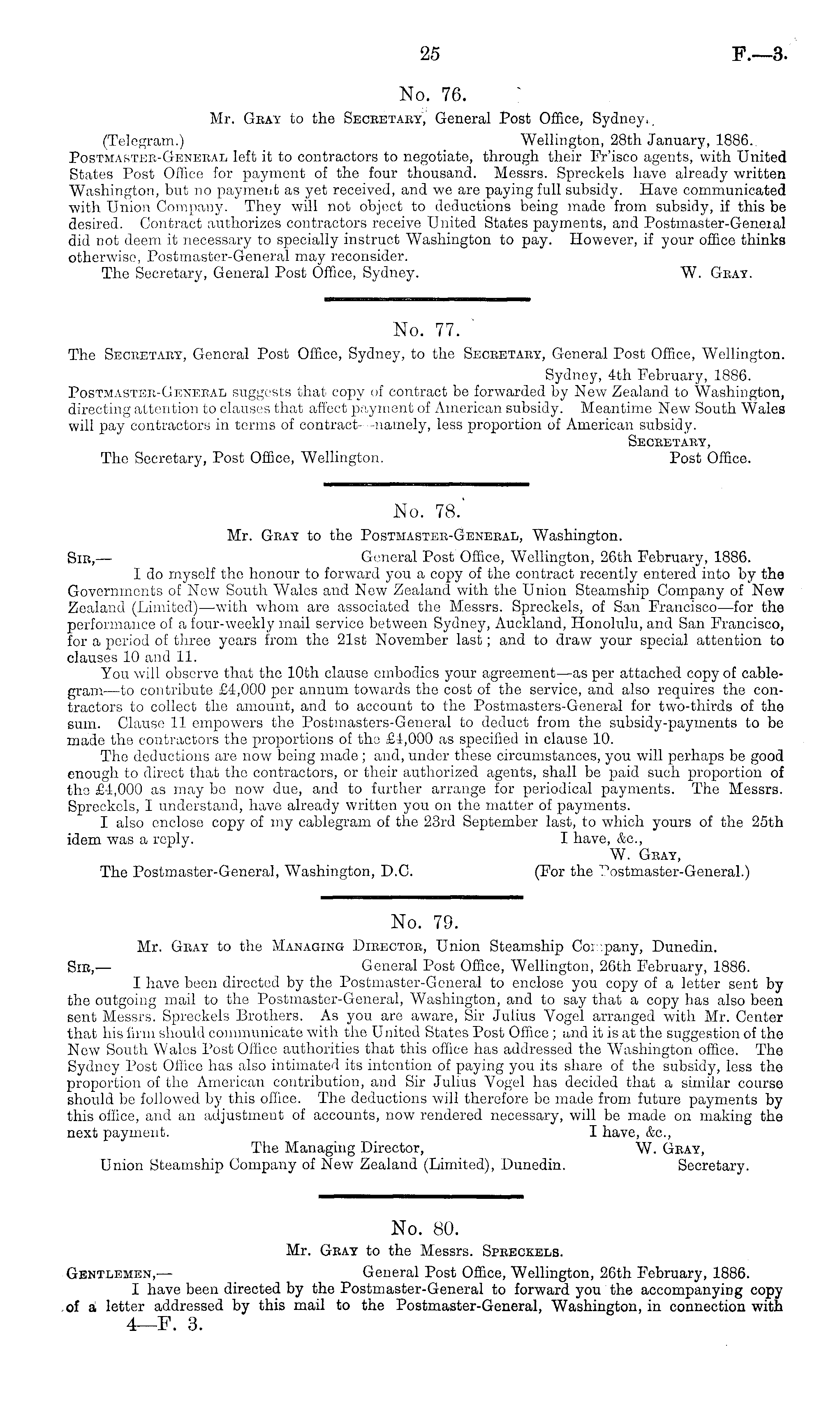No. 80. Mr. Gray to the Messrs. Spreckels. Gentlemen,— General Post Office, Wellington, 26th February, 1886. I have been directed by the Postmaster-General to forward you the accompanying copy of a, letter addressed by this mail to the Postmaster-General, Washington, in connection with 4—F. 3.