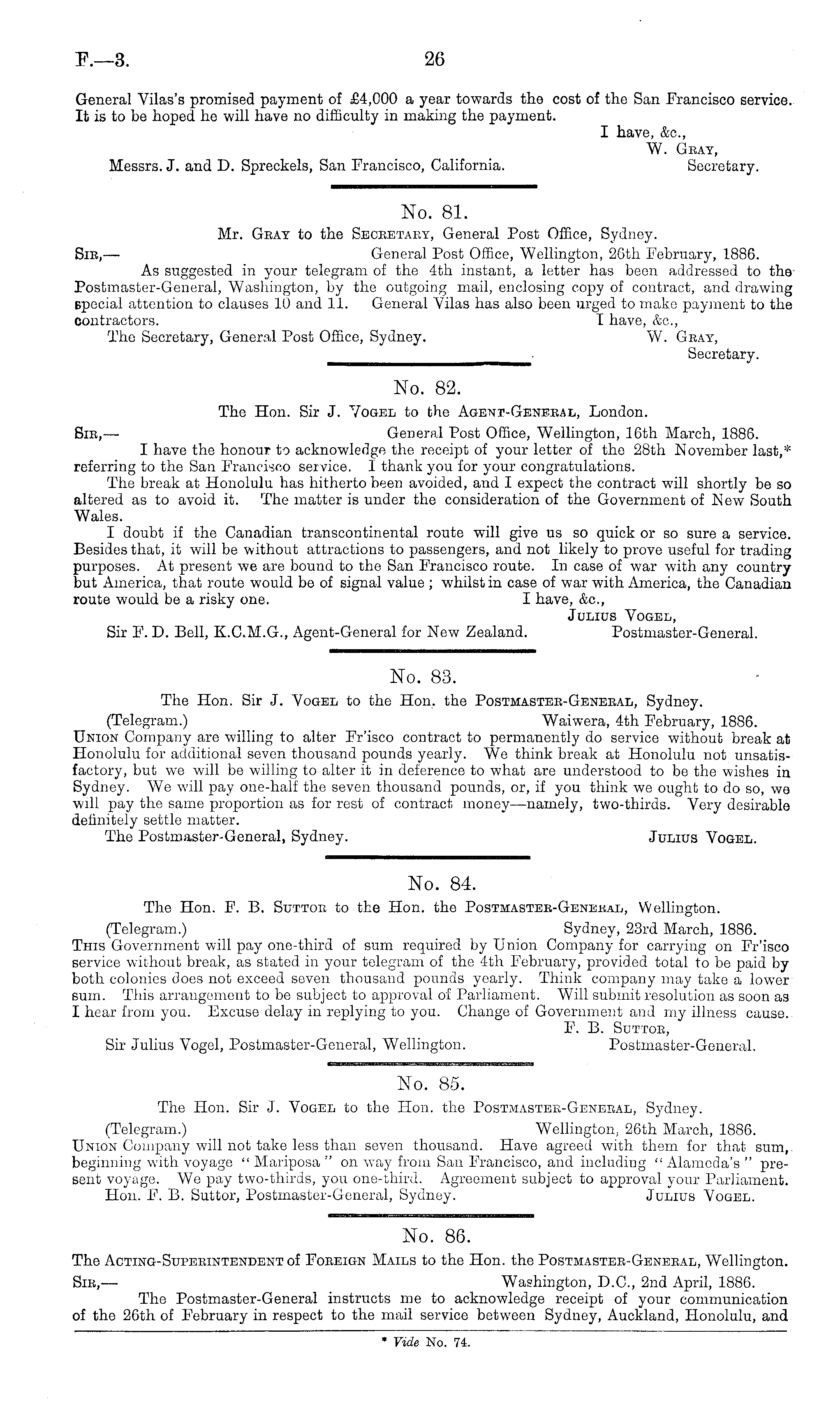 No. 82. The Hon. Sir J. Vogel to the Agent-General, London. Sib,— General Post Office, Wellington, 16th March, 1886. I have the honour to acknowledge the receipt of your letter of the 28th November last,* referring to the San Francisco service. 1 thank you for your congratulations. The break at Honolulu has hitherto been avoided, and I expect the contract will shortly be so altered as to avoid it. The matter is under the consideration of the Government of New South Wales. I doubt if the Canadian transcontinental route will give us so quick or so sure a service. Besides that, it will be without attractions to passengers, and not likely to prove useful for trading purposes. At present we are bound to the San Francisco route. In case of war with any country but America, that route would be of signal value ; whilst in case of war with America, the Canadian route would be a risky one. I have, &c, Julius Vogel, Sir F. D. Bell, K.C.M.G., Agent-General for New Zealand. Postmaster-General.