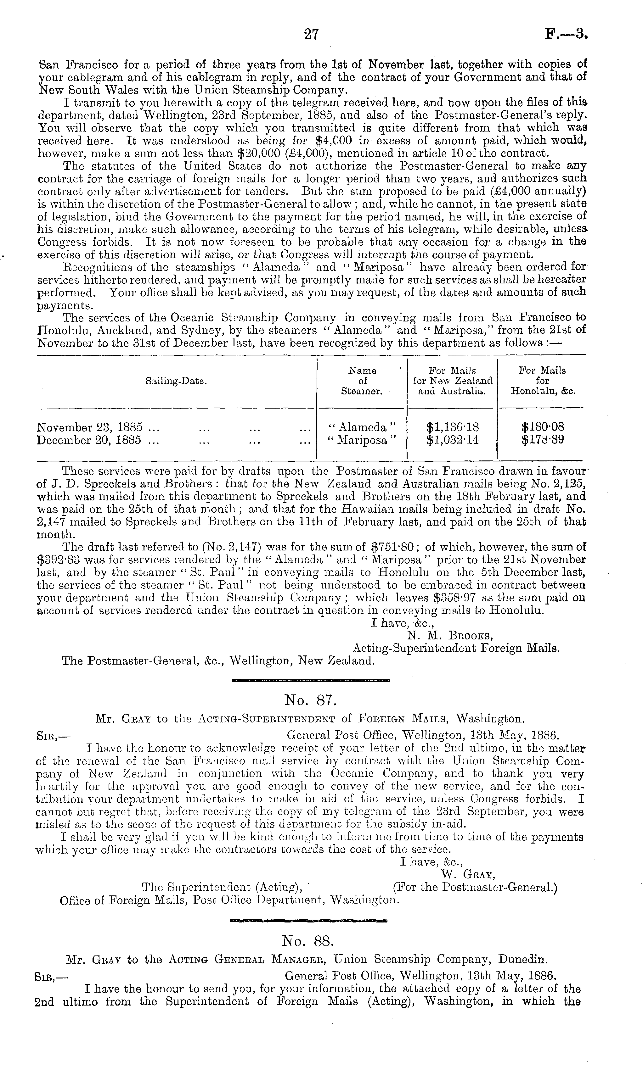 No. 87. Mr. Gbay to tlio Acting-Superintendent of Foeeign Mails, Washington. Sic, — General Post Office, Wellington, 13th May, 1886. I have the honour to acknowledge receipt of your letter of the 2nd ultimo, in the matter of the renewal of the San Francisco mail service by contract with the Union Steamship Company of New Zealand in conjunction with the Oceanic Company, and to thank you very hi artily for the approval you are good enough to convey of the now service, and for the contribution your department undertakes to make in aid of the service, unless Congress forbids. I cannot but regret that, before receiving the copy of my telegram of the 23rd September, you were misled as to the scope of the request of this department for the subsidy-in-aid. I shall bo very glad if you will be kind enough to inform me from time to time of the payments which your office may make the contractors towards the cost of the service. I have, &c, W. Geay, The Superintendent (Acting), (For the Postmaster-General.) Office of Foreign Mails, Post Office Department, Washington.