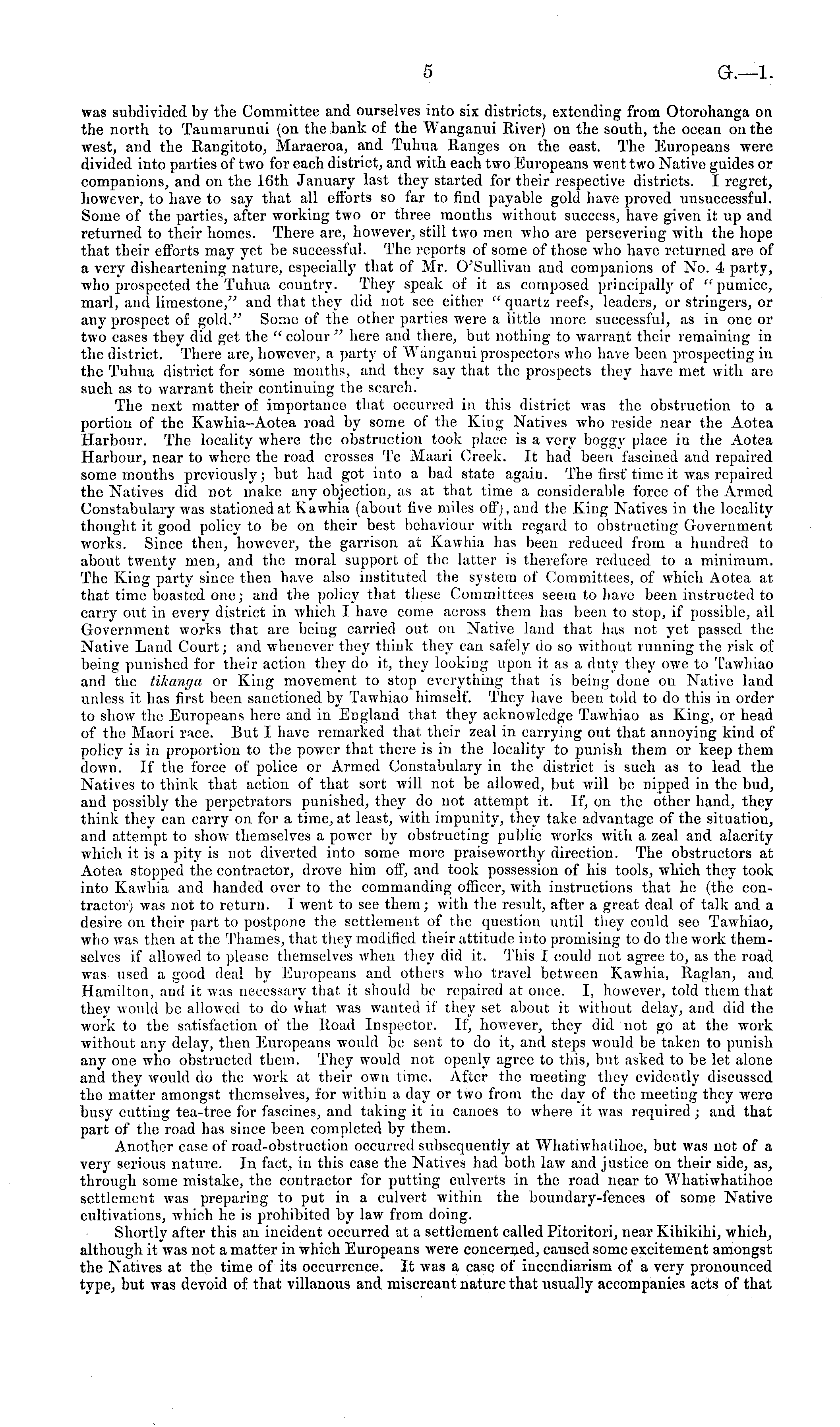 was subdivided by the Committee and ourselves into six districts, extending from Otorohanga on the north to Taumarunui (on the bank of the Wanganui River) on the south, the ocean on the west, and the Rangitoto, Maraeroa, and Tuhua Ranges on the east. The Europeans were divided into parties of two for each district, and with each two Europeans went two Native guides or companions, and on the 16th January last they started for their respective districts. I regret, however, to have to say that all efforts so far to find payable gold have proved unsuccessful. Some of the parties, after working two or three months without success, have given it up and returned to their homes. There are, however, still two men who are persevering with the hope that their efforts may yet be successful. The reports of some of those who have returned are of a very disheartening nature, especially that of Mr. O'Sullivan and companions of No. 4 party, who prospected the Tuhua country. They speak of it as composed principally of "pumice, marl, and limestone," and that they did not see either " quartz reefs, leaders, or stringers, or any prospect of gold." Some of the other parties were a little more successful, as in one or two cases they did get the " colour " here and there, but nothing to warrant their remaining in the district. There are, however, a party of Wanganui prospectors who have been prospecting in the Tuhua district for some mouths, and they say that the prospects they have met with are such as to warrant their continuing the search. The next matter of importance that occurred in this district was the obstruction to a portion of the Kawhia-Aotea road by some of the King Natives who reside near the Aotea Harbour. The locality where the obstruction took place is a very boggy place in the Aotea Harbour, near to where the road crosses Te Maari Creek. It had been fascined and repaired some months previously; but had got into a bad state again. The first'time it was repaired the Natives did not make any objection, as at that time a considerable force of the Armed Constabulary was stationed at X awhia (about five miles off ), and the King Natives in the locality thought it good policy to be on their best behaviour with regard to obstructing Government works. Since then, however, the garrison at Kawhia has been reduced from a hundred to about twenty men, and the moral support of the latter is therefore reduced to a minimum. The King party since then have also instituted the system of Committees, of which Aotea at that time boasted one; and the policy that these Committees seem to have been instructed to carry out in every district in which I have come across them has been to stop, if possible, all Government works that are being carried out on Native land that has not yet passed the Native Land Court; and whenever they think they can safely do so without running the risk of being punished for their action they do it, they looking upon it as a duty they owe to Tawhiao and the tikanga or King movement to stop everything that is being done on Native land unless it has first been sanctioned by Tawhiao himself. They have been told to do this in order to show the Europeans here and in England that they acknowledge Tawhiao as King, or head of the Maori race. But I have remarked that their zeal in carrying out that annoying kind of policy is in proportion to the power that there is in the locality to punish them or keep them down. If the force of police or Armed Constabulary in the district is such as to lead the Natives to think that action of that sort will not be allowed, but will be nipped in the bud, and possibly the perpetrators punished, they do not attempt it. If, on the other hand, they think they can carry on for a time, at least, with impunity, they take advantage of the situation, and attempt to show themselves a power by obstructing public works with a zeal and alacrity which it is a pity is not diverted into some more praiseworthy direction. The obstructors at Aotea stopped the contractor, drove him off, and took possession of his tools, which they took into Kawhia and handed over to the commanding officer, with instructions that he (the contractor) was not to return. I went to see them; with the result, after a great deal of talk and a desire on their part to postpone the settlement of the question until they could see Tawhiao, who was then at the Thames, that they modified their attitude into promising to do the work themselves if allowed to please themselves when they did it. This I could not agree to, as the road was used a good deal by Europeans and others who travel between Kawhia, Raglan, and Hamilton, and it was necessary that it should be repaired at once. I, however, told them that they would be allowed to do what was wanted if they set about it without delay, and did the work to the satisfaction of the Road Inspector. If, however, they did not go at the work without any delay, then Europeans would be sent to do it, and steps would be taken to punish any one who obstructed them. They would not openly agree to this, but asked to be let alone and they would do the work at their own time. After the meeting they evidently discussed the matter amongst themselves, for within a day or two from the day of the meeting they were busy cutting tea-tree for fascines, and taking it in canoes to where it was required; and that part of the road has since been completed by them. Another case of road-obstruction occurred subsequently at Whatiwhatihoe, but was not of a very serious nature. In fact, in this case the Natives had both law and justice on their side, as, through some mistake, the contractor for putting culverts in the road near to Whatiwhatihoe settlement was preparing to put in a culvert within the boundary-fences of some Native cultivations, which he is prohibited by law from doing. Shortly after this an incident occurred at a settlement called Pitoritori, near Kihikihi, which, although it was not a