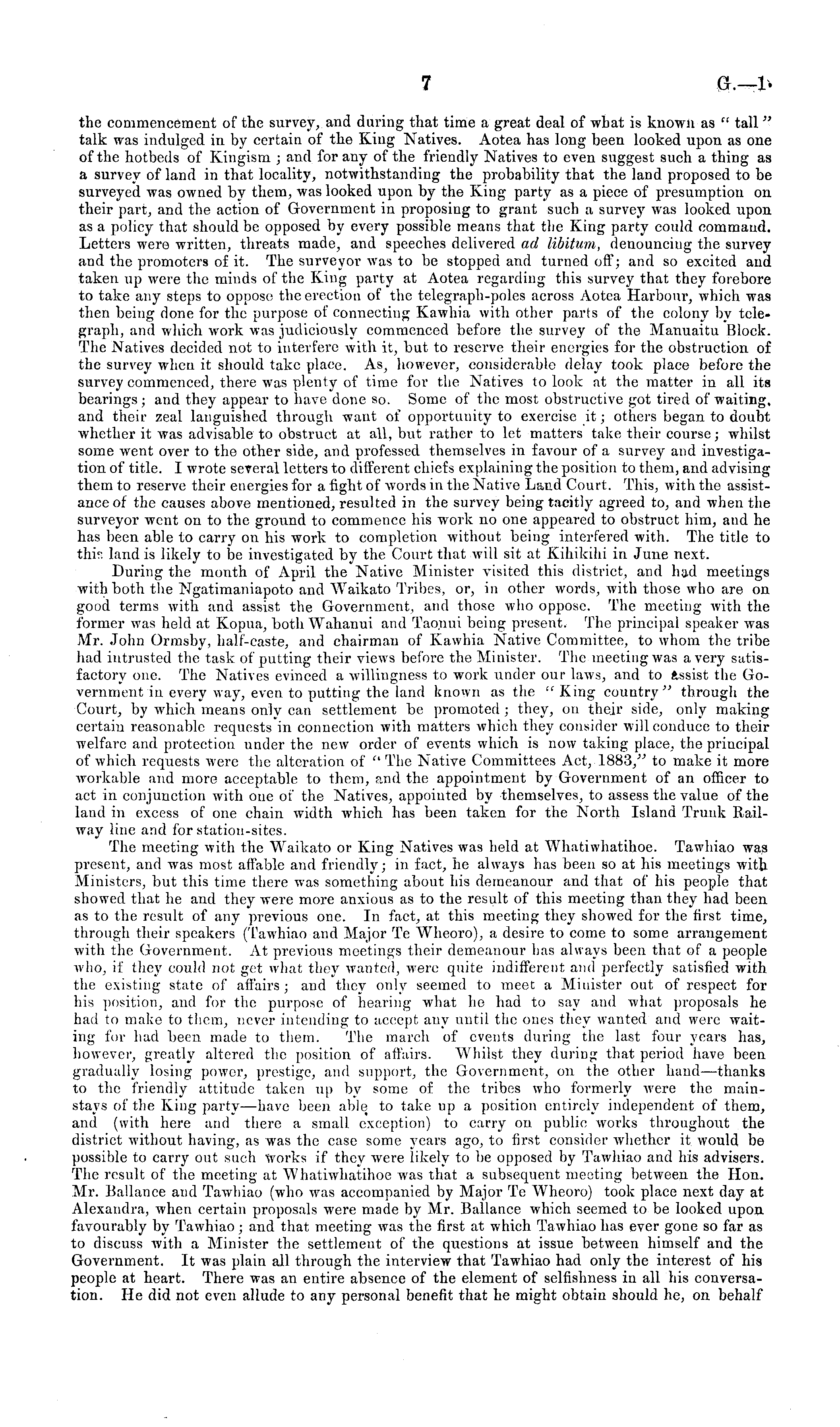 the commencement of the survey, and daring that time a great deal of what is known as " tall" talk was indulged in by certain of the King Natives. Aotea has long been looked upon as one of the hotbeds of Kingism ; and for any of the friendly Natives to even suggest such a thing as a survey of land in that locality, notwithstanding the probability that the land proposed to be surveyed was owned by them, was looked upon by the King party as a piece of presumption on their part, and the action of Government in proposing to grant such a survey was looked upon as a policy that should be opposed by every possible means that the King party could command. Letters were written, threats made, and speeches delivered ad libitum, denouncing the survey and the promoters of it. The surveyor was to be stopped and turned oft'; and so excited and taken up were the minds of the King party at Aotea regarding this survey that they forebore to take any steps to oppose the erection of the telegraph-poles across Aotea Harbour, which was then being done for the purpose of connecting Kawhia with other parts of the colony by telegraph, and which work was judiciously commenced before the survey of the Manuaitu Block. The Natives decided not to interfere with it, but to reserve their energies for the obstruction of the survey when it should take place. As, however, considerable delay took place before the survey commenced, there was plenty of time for the Natives to look at the matter in all its bearings; and they appear to have done so. Some of the most obstructive got tired of waiting, and their zeal languished through want of opportunity to exercise it; others began to doubt whether it was advisable to obstruct at all, but rather to let matters take their course; whilst some went over to the other side, and professed themselves in favour of a survey and investigation of title. I wrote several letters to different chiefs explaining the position to them, and advising them to reserve their energies for a fight of words in the Native Land Court. This, with the assistance of the causes above mentioned, resulted in the survey being tacitly agreed to, and when the surveyor went on to the ground to commence his work no one appeared to obstruct him, and he has been able to carry on his work to completion without being interfered with. The title to thir. land is likely to be investigated by the Court that will sit at Kihikihi in June next. During the month of April the Native Minister visited this district, and had meetings with both the Ngatimaniapoto and Waikato Tribes, or, in other words, with those who are on good terms with and assist the Government, and those who oppose. The meeting with the former was held at Kopua, both Wahanui and Tao.nui being present. The principal speaker was Mr. John Ormsby, half-caste, and chairman of Kawhia Native Committee, to whom the tribe had intrusted the task of putting their views before the Minister. The meeting was a very satisfactory one. The Natives evinced a willingness to work under our laws, and to assist the Government in every way, even to putting the land known as the "King country" through the Court, by which means only can settlement be promoted ; they, on their side, only making certain reasonable requests in connection with matters which they consider will conduce to their welfare and protection under the new order of events which is now taking place, the priucipal of which requests were the alteration of " The Native Committees Act, 1883," to make it more workable and more acceptable to them, and the appointment by Government of an officer to act in conjunction with one of the Natives, appointed by themselves, to assess the value of the land in excess of one chain width which has been taken for the North Island Trunk Railway line and for station-sites. The meeting with the Waikato or King Natives was held at Whatiwhatihoe. Tawhiao was present, and was most affable and friendly; in fact, he alwa3 rs has been so at his meetings with Ministers, but this time there was something about his demeanour and that of his people that showed that he and they were more anxious as to the result of this meeting than they had been as to the result of any previous one. In fact, at this meeting they showed for the first time, through their speakers (Tawhiao and Major Te Wheoro), a desire to come to some arrangement with the Government. At previous meetings their demeanour has always been that of a people who, if they could not get what they wanted, were quite indifferent and perfectly satisfied with the existing state of affairs ; and they only seemed to meet a Minister out of respect for his position, and for the purpose of hearing what he had to say and what proposals he had to make to them, never intending to accept any until the ones they wanted and were waiting for had been made to them. The inarch of events during the last four years has, however, greatly altered the position of affairs. Whilst they during that period have been gradually losing power, prestige, and support, the Government, on the other hand—thanks to the friendly attitude taken up by some of the tribes who formerly were the mainstays of the King party—have been able t to take up a position entirely independent of them, and (with here and there a small exception) to carry on public works throughout the district without having, as was the case some years ago, to first consider whether it would be possible to carry out such works if they were likely to be opposed by Tawhiao and his advisers. The result of the meeting at Whatiwhatihoe was that a subsequent meeting between the Hon. Mr. Ballance and Tawhiao (who was accompanied by Major To Wheoro) took place next day at Alexandra, when certain proposals were made by Mr. Ballance which seemed to be looked upon, favourably by Tawhiao; and that meeting was the first at which Tawhiao has ever gone so far as to discuss with a Minister the settlement of the questions at iss