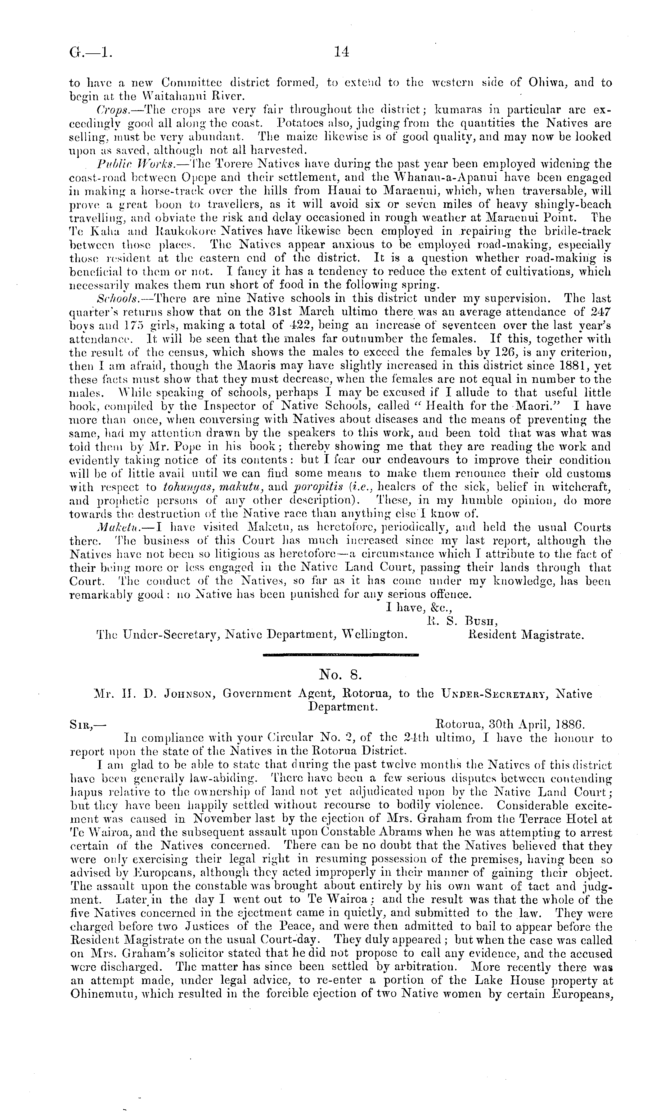 No. 8. Mr. 11. D. Johnson, Government Agent, liotorua, to the Under-Sechetary, Native Department. Sin,— Rptorua, 30th April, 1886. In compliance with your Circular No. "2, of the 24th ultimo, I have the honour to report upon the state of the Natives in the liotorua District. I am glad to be able to state that during the past twelve months the Natives of this district have been generally law-abiding. There have been a few serious disputes between contending hapus relative to the ownership of land not yet adjudicated upon by the Native Land Court; but they have been happily settled without recourse to bodily violence. Considerable excitement was caused in November last by the ejection of Mrs. Graham from the Terrace Hotel at Te Wairoa, and the subsequent assault upon Constable Abrams when he was attempting to arrest certain of the Natives concerned. There can be no doubt that the Natives believed that they were only exercising their legal right in resuming possession of the premises, having been so advised by Europeans, although they acted improperly in their manner of gaining their object. The assault upon the constable was brought about entirely by his own want of tact and judgment. Later, in the day I went out to Te Wairoa: and the result was that the whole of the five Natives concerned in the ejectment came in quietly, and submitted to the law. They were charged before two Justices of the Peace, and were then admitted to bail to appear before the Resident Magistrate on the usual Court-day. They duly appeared ; but when the case was called on Mrs. Graham's solicitor stated that he did not propose to call any evidence, and the accused wei-e discharged. The matter has since been settled by arbitration. More recently there was an attempt made, under legal advice, to re-enter a portion of the Lake House property at Ohincmutu, which resulted in the forcible ejection of two Native women by certain Europeans,