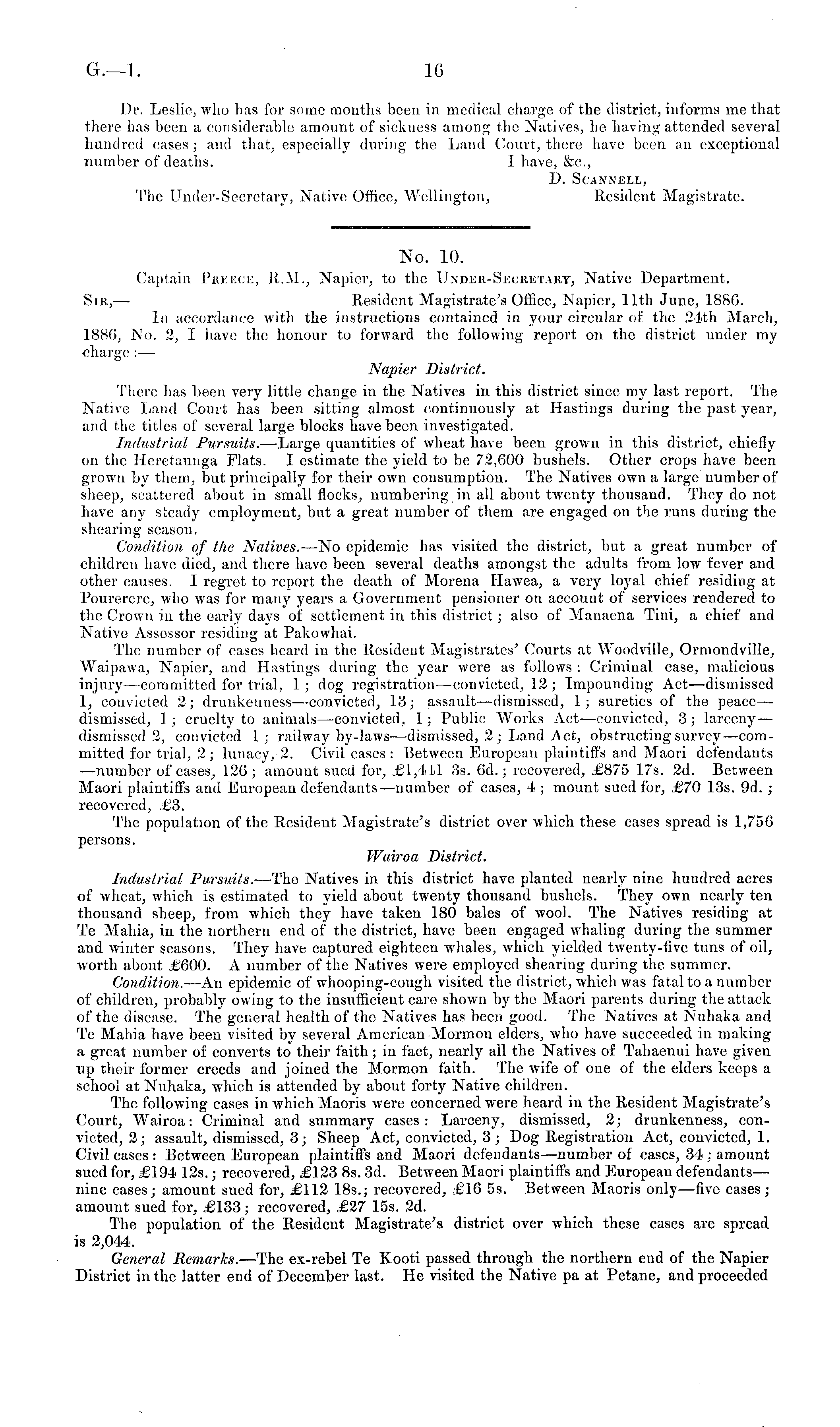 No. 10. Captain Pbekce, R.M., Napier, to the Under-Secretary, Native Department. Sir, — Resident Magistrate's Office, Napier, 11th June, 1880. In accordance with the instructions contained in your circular of the 24th March, 1880, No. 2, I have the honour to forward the following report on the district under my charge:— Napier District. There has been very little change in the Natives in this district since my last report. The Native Land Court has been sitting almost continuously at Hastings during the past year, and the titles of several large blocks have been investigated. Industrial Pursuits. —Large quantities of wheat have been grown in this district, chiefly on the Heretaunga Flats. I estimate the yield to be 72,600 bushels. Other crops have been grown by them, but principally for their own consumption. The Natives own a large number of sheep, scattered about in small flocks, numbering in all about twenty thousand. They do not have any steady employment, but a great number of them are engaged on the runs during the shearing season. Condition of the Natives. —No epidemic lias visited the district, but a great number of children have died, and there have been several deaths amongst the adults from low fever and other causes. I regret to report the death of Morena Hawea, a very loyal chief residing at Pourcrere, who was for many years a Government pensioner on account of services rendered to the Crown in the early days of settlement in this district; also of Mauaena Tini, a chief and Native Assessor residing at Pakowhai. The number of cases heard in the Resident Magistrates' Courts at Woodville, Ormondville, Waipawa, Napier, and Hastings during the year were as follows : Criminal case, malicious injury —committed for trial, 1; dog registration—convicted, 12; Impounding Act —dismissed 1, convicted 2; drunkenness —convicted, 13; assault —dismissed, 1; sureties of the peace— dismissed, 1; cruelty to animals —convicted. 1; Public Works Act —convicted, 3; larceny— dismissed 2, convicted 1; railway by-laws —dismissed, 2 ; Land Act, obstructing survey —committed for trial, 2 ; lunacy, 2. Civil cases : Between European plaintiffs and Maori defendants —number of cases, 126; amount sued for, £1,441 3s. 6d.; recovered, £875 17s. 2d. Between Maori plaintiffs and European defendants —number of eases, 4; mount sued for, £70 13s. 9d. ; recovered, £3. The population of the Resident Magistrate's district over which these cases spread is 1,750 persons. Wairoa District. Industrial Pursuits. —The Natives in this district have planted nearly nine hundred acres of wheat, which is estimated to yield about twenty thousand bushels. They own nearly ten thousand sheep, from which they have taken 180 bales of wool. The Natives residing at Te Mahia, in the northern end of the district, have been engaged whaling during the summer and winter seasons. They have captured eighteen whales, which yielded twenty-five tuns of oil, worth about £600. A number of the Natives were employed shearing during the summer. Condition. —An epidemic of whooping-cough visited the district, which was fatal to a number of children, probably owing to the insufficient caro shown by the Maori parents during the attack of the disease. The general health of the Natives has been good. The Natives at Nuhaka and Te Mahia have been visited by several American Mormon elders, who have succeeded in making a great number of converts to their faith; in fact, nearly all the Natives of Tahaenui have given up their former creeds and joined the Mormon faith. The wife of one of the elders keeps a school at Nuhaka, which is attended by about forty Native children. The following cases in which Maoris were concerned were heard in the Resident Magistrate's Court, Wairoa: Criminal and summary cases: Larceny, dismissed, 2; drunkenness, convicted, 2; assault, dismissed, 3; Sheep Act, convicted, 3; Dog Registration Act, convicted, 1. Civil cases : Between European plaintiffs and Maori defendants—number of cases, 34 ; amount sued for, £194 125.; recovered, .£123 Bs. 3d. Between Maori plaintiffs and European defendants— nine cases; amount sued for, £112 18s.; recovered, £16 ss. Between Maoris only—five cases; amount sued for, £133; recovered, £27 15s. 2d. The population of the Resident Magistrate's district over which these cases are spread is 2,044. General Remarks. —The ex-rebel Te Kooti passed through the northern end of the Napier District in the latter end of December last. He visited the Native pa at Petane, and proceeded