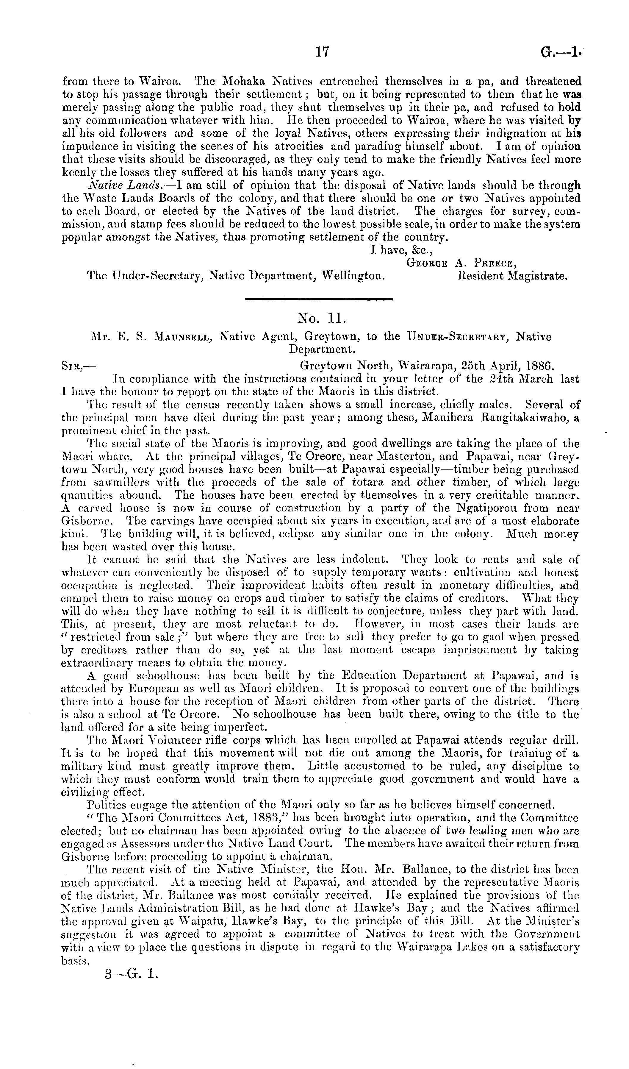 No. 11. Mr. E. S. Maunsell, Native Agent, Greytown, to the Under-Secretary, Native Department. Sir, — Greytown North, Wairarapa, 25th April, 1886. In compliance with the instructions contained in your letter of the 24th March last I have the honour to report on the state of the Maoris in this district. The result of the census recently taken shows a small increase, chiefly males. Several of the principal men have died during the past year; among these, Manihera Hangitakaiwaho, a prominent chief in the past. The social state of the Maoris is improving, and good dwellings are taking the place of the Maori whare. At the principal villages, Te Oreore, near Masterton, and Papawai, near Greytown North, very good houses have been built—at Papawai especially—timber being purchased from sawmillers with the proceeds of the sale of totara and other timber, of which large quantities abound. The houses have been erected by themselves in a very creditable manner. A carved house is now in course of construction by a party of the Ngatiporou from near Gisborne. The carvings have occupied about six years in execution, and are of a most elaborate kind. The building will, it is believed, eclipse any similar one in the colony. Much money has been wasted over this house. It cannot be said that the Natives are less indolent. They look to rents and sale of whatever can conveniently be disposed of to supply temporary wants : cultivation and honest occupation is neglected. Their improvident habits often result in monetary difficulties, and compel them to raise money on crops and timber to satisfy the claims of creditors. What they will do when they have nothing to sell it is difficult to conjecture, unless they part with land. This, at present, they are most reluctant to do. However, in most cases their lands are '' restricted from sale ;" but where they are free to sell they prefer to go to gaol when pressed by creditors rather than do so, yet at the last moment escape imprisonment by taking extraordinary means to obtain the money. A good schoolhousc has been built by the Education Department at Papawai, and is attended by European as well as Maori children. It is proposed to convert one of the buildings there into a house for the reception of Maori children from other parts of the district. There is also a school at Te Oreore. No schoolhouse has been built there, owing to the title to the land offered for a site being imperfect. The Maori Volunteer rifle corps which has been enrolled at Papawai attends regular drill. It is to be hoped that this movement will not die out among the Maoris, for training of a military kind must greatly improve them. Little accustomed to be ruled, any discipline to which they must conform would train them to appreciate good government and would have a civilizing effect. Politics engage the attention of the Maori only so far as he believes himself concerned. "The Maori Committees Act, 1883/' has been brought into operation, and the Committee elected; but no chairman has been appointed owing to the absence of two leading men who are engaged as Assessors under the Native Land Court. The members have awaited their return from Gisborne before proceeding to appoint a chairman. The recent visit of the Native Minister, the lion. Mr. Ballance, to the district has been much appreciated. At a meeting held at Papawai, and attended by the representative Maoris of the district, Mr. Ballance was most cordially received. He explained the provisions of the Native Lauds Administration Bill, as he had done at Hawke's Bay ; and the Natives affirmed the approval given at Waipatu, Hawke's Bay, to the principle of this Bill. At the Minister's suggestion it was agreed to appoint a committee of Natives to treat with the Government with a view to place the questions in dispute in regard to the Wairarapa Lakes on a satisfactory basis. 3—G. 1.