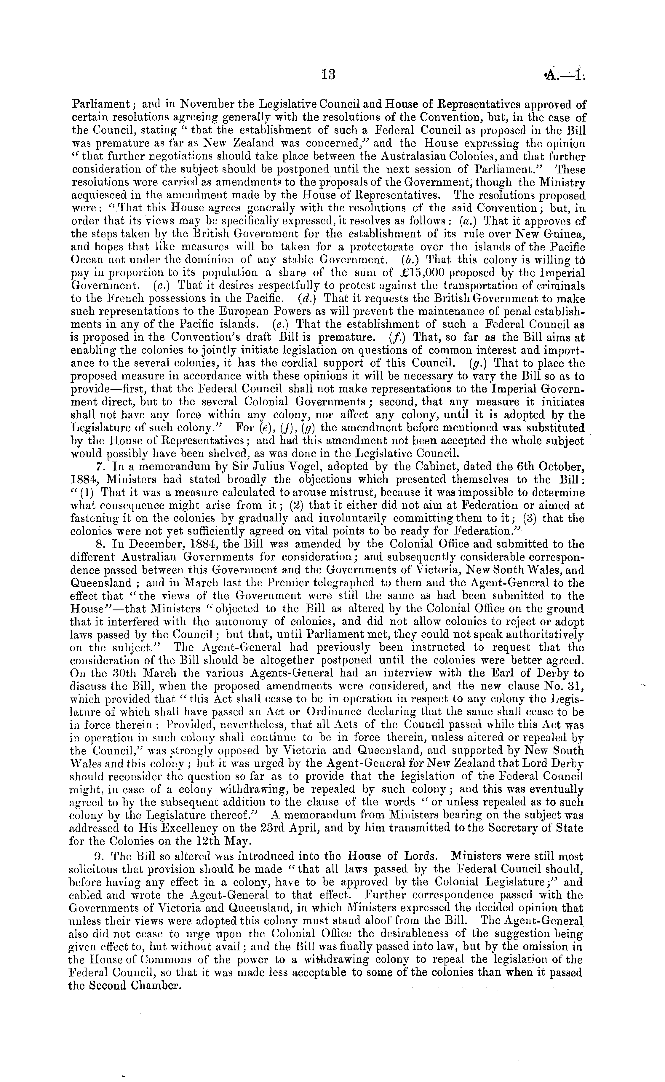 Parliament; and in November the Legislative Council and House of Representatives approved of certain resolutions agreeing generally with the resolutions of the Convention, but, in the case of the Council, stating " that the establishment of such a Federal Council as proposed in the Bill was premature as far as New Zealand was concerned," and the House expressing the opinion "that further negotiations should take place between the Australasian Colonies, and that further consideration of the subject should be postponed until the next session of Parliament." These resolutions were carried as amendments to the proposals of the Government, though the Ministry acquiesced in the amendment made by the House of Representatives. The resolutions proposed were: "That this House agrees generally with the resolutions of the said Convention; but, in order that its views may be specifically expressed, it resolves as follows : (a.) That it approves of the steps taken by the British Government for the establishment of its rule over New Guinea, and hopes that like measures will be taken for a protectorate over the islands of the Pacific Ocean not under the dominion of any stable Government, (b.) That this colony is willing to pay in proportion to its population a share of the sum of .€15,000 proposed by the Imperial Government, (c.) That it desires respectfully to protest against the transportation of criminals to the French possessions in the Pacific. (...) That it requests the British Government to make such representations to the European Powers as will prevent the maintenance of penal establishments in any of the Pacific islands, (c.) That the establishment of such a Federal Council as is proposed in the Convention's draft Bill is premature. (/.) That, so far as the Bill aims at enabling the colonies to jointly initiate legislation on questions of common interest and importance to the several colonies, it has the cordial support of this Council. ((/.) That to place the proposed measure in accordance with these opinions it will be necessary to vary the Bill so as to provide—first, that the Federal Council shall not make representations to the Imperial Government direct, but to the several Colonial Governments ; second, that any measure it initiates shall not have any force within any colony, nor affect any colony, until it is adopted by the Legislature of such colony." For (c), (J), (g) the amendment before mentioned was substituted by the House of Representatives; and had this amendment not been accepted the whole subject would possibly have been shelved, as was done in the Legislative Council. 7. In a memorandum by Sir Julius Vogel, adopted by the Cabinet, dated the 6th October, 1884, Ministers had stated broadly the objections which presented themselves to the Bill; " (1) That it was a measure calculated to arouse mistrust, because it was impossible to determine what consequence might arise from it; (2) that it either did not aim at Federation or aimed at fastening it on the colonies by gradually and involuntarily committing them to it; (3) that the colonies were not yet sufficiently agreed on vital points to be ready for Federation." 8. In December, 1884, the Bill was amended by the Colonial Office and submitted to the different Australian Governments for consideration; and subsequently considerable correspondence passed between this Government and the Governments of Victoria, New South Wales, and Queensland ; and in March last the Premier telegraphed to them aud the Agent-General to the effect that "the views of the Government were still the same as had been submitted to the House"—that Ministers " objected to the Bill as altered by the Colonial Office on the ground that it interfered with the autonomy of colonies, and did not allow colonies to reject or adopt laws passed by the Council; but that, until Parliament met, they could not speak authoritatively on the subject." The Agent-General had previously been instructed to request that the consideration of the Bill should be altogether postponed until the colonies were better agreed. On the 30th March the various Agents-General had an interview with the Earl of Derby to discuss the Bill, when the proposed amendments were considered, and the new clause No. 31, which provided that " this Act shall cease to be in operation in respect to any colony the Legislature of which shall have passed an Act or Ordinance declaring that the same shall cease to be in force therein : Provided, nevertheless, that all Acts of the Council passed while this Act was in operation in such colony shall continue to be in force therein, unless altered or repealed by the Council," was strongly opposed by Victoria and Queensland, and supported by New South Wales and this colony ; but it was urged by the Agent-General for New Zealand that Lord Derby should reconsider the question so far as to provide that the legislation of the Federal Council might, in case of a colony withdrawing, be repealed by such colony; and this was eventually agreed to by the subsequent addition to the clause of the words " or unless repealed as to such colony by the Legislature thereof." A memorandum from Ministers bearing on the subject was addressed to His Excellency on the 23rd April, and by him transmitted to the Secretary of State for the Colonies on the 12th May. 9. The Bill so altered was introduced into the House of Lords. Ministers were still most solicitous that provision should be made " that all laws passed by the Federal Council should, before having any effect in a colony, have to be approved by the Colonial Legislature;" and cabled and wrote the Agcut-General to that effect. Further correspondence passed with the Governments of Victoria and Queensland, in which Ministers expressed the decided opinion that unless their views were adopted this colony must stand aloof from the Bill. The Agent-General also did not cease to urge upon the Colonial Office the desirableness of the suggestio