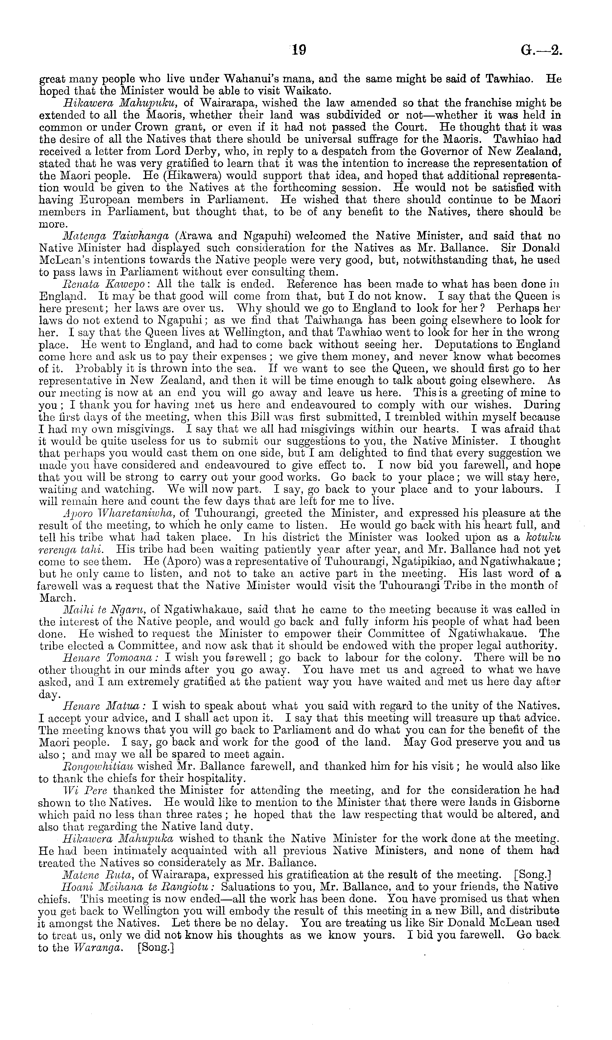 great many people who live under Wahanui's mana, and the same might be said of Tawhiao. He hoped that the Minister would be able to visit Waikato. Hikawera Mahupuku, of Wairarapa, wished the law amended so that the franchise might be extended to all the Maoris, whether their land was subdivided or not—whether it was held in common or under Crown grant, or even if it had not passed the Court. He thought that it was the desire of all the Natives that there should be universal suffrage for the Maoris. Tawhiao had received a letter from Lord Derby, who, in reply to a despatch from the Governor of New Zealand, stated that he was very gratified to learn that it was the intention to increase the representation of the Maori people. He (Hikawera) would support that idea, and hoped that additional representation would be given to the Natives at the forthcoming session. Ho would not be satisfied with having European members in Parliament. He wished that there should continue to be Maori members in Parliament, but thought that, to be of any benefit to the Natives, there should be more. Matenga Taiwhanga (Arawa and Ngapuhi) welcomed the Native Minister, and said that no Native Minister had displayed such consideration for the Natives as Mr. Ballance. Sir Donald McLean's intentions towards the Native people were very good, but, notwithstanding that, he used to pass laws in Parliament without ever consulting them. Benata Kawepo : All the talk is ended. Eeference has been made to what has been done in England. It may be that good will come from that, but Ido not know. I say that the Queen is here present; her laws are over us. Why should we go to England to look for her ? Perhaps her laws do not extend to Ngapuhi; as we find that Taiwhanga has been going elsewhere to look for her. I say that the Queen lives at Wellington, and that Tawhiao went to look for her in the wrong place. He went to England, and had to come back without seeing her. Deputations to England come here and ask us to pay their expenses ; we give them money, and never know what becomes of it. Probably it is thrown into the sea. If we want to see the Queen, we should first go to her representative in New Zealand, and then it will be time enough to talk about going elsewhere. As our meeting is now at an end you will go away and leave us here. This is a greeting of mine to you ; I thank you for having met us here and endeavoured to comply with our wishes. During the first days of the meeting, when this Bill was first submitted, I trembled within myself because I had my own misgivings. I say that we all had misgivings within our hearts. I was afraid that it would be quite useless for us to submit our suggestions to you, the Native Minister. I thought that perhaps you would cast them on one side, but I am delighted to find that every suggestion we made you have considered and endeavoured to give effect to. I now bid you farewell, and hope that you will be strong to carry out your good works. Go back to your place; we will stay here, waiting and watching. We will now part. I say, go back to your place and to your labours. I will remain here and count the few days that are left for me to live. A'poro Wharetaniiuha, of Tuhourangi, greeted the Minister, and expressed his pleasure at the result of the meeting, to which he only came to listen. Ho would go back with his heart full, and tell his tribe what had taken place. In his district the Minister was looked upon as a kotuku rerenga tahi. His tribe had been waiting patiently year after year, and Mr. Ballance had not yet come to see them. He (Aporo) was a representative of Tuhourangi, Ngatipikiao, and Ngatiwhakaue ; but he only came to listen, and not to take an active part in the meeting. His last word of a farewell was a request that the Native Minister would visit the Tuhourangi Tribe in the month of March. Maihi te Ngaru, of Ngatiwhakaue, said that he came to the meeting because it was called in the interest of the Native people, and would go back and fully inform his people of what had been done. He wished to request the Minister to empower their Committee of Ngatiwhakaue. The tribe elected a Committee, and now ask that it should be endowed with the proper legal authority. Henare Tomoana: I wish you farewell; go back to labour for the colony. There will be no other thought in our minds after you go away. You have met us and agreed to what we have asked, and I am extremely gratified at the patient way you have waited and met us here day aftar day. Henare Matua: I wish to speak about what you said with regard to the unity of the Natives. I accept your advice, and I shall act upon it. I say that this meeting will treasure up that advice. The meeting knows that you will go back to Parliament and do what you can for the benefit of the Maori people. I say, go back and work for the good of the land. May God preserve you and us also ; and may we all be spared to meet again. Bongowhitiau wished Mr. Ballance farewell, and thanked him for his visit; he would also like to thank the chiefs for their hospitality. Wi Pere thanked the Minister for attending the meeting, and for the consideration he had shown to the Natives. He would like to mention to the Minister that there were lands in Gisborne which paid no less than three rates ; he hoped that the law respecting that would be altered, and also that regarding the Native land duty. Hikaivera Mahupuka wished to thank the Native Minister for the work done at the meeting. He had been intimately acquainted with all previous Native Ministers, and none of them had treated the Natives so considerately as Mr. Ballance. Matcne Buta, of Wairarapa, expressed his gratification at the result of the meeting. [Song.] Hoani Maihana te Bangiotu: Saluations to you, Mr. Ballance, and to your friends, the Native chiefs. This meeting is now ended—all the work has been done. You have promised us that when you get back to Wellington you will embody the result of this meeti