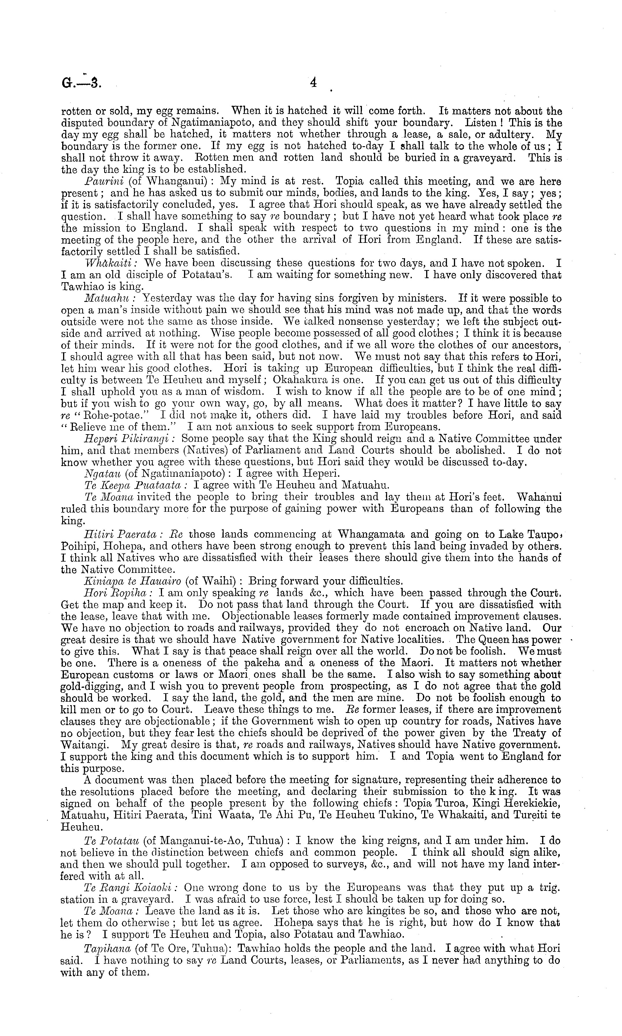 rotten or sold, my egg remains. When it is hatched it will come forth. It matters not about the disputed boundary of Ngatimaniapoto, and they should shift your boundary. Listen ! This is the day my egg shall be hatched, it matters not whether through a lease, a sale, or adultery. My boundary is the former one. If my egg is not hatched to-day I shall talk to the whole of us; I shall not throw it away. Rotten men and rotten land should be buried in a graveyard. This is the day the king is to be established. Paurini (of Whanganui) :My mind is at rest. Topia called this meeting, and we are here present; and he has asked us to submit our minds, bodies, and lands to the king. Yes, I say; yes; if it is satisfactorily concluded, yes. I agree that Hori should speak, as we have already settled the question. I shall have something to say re boundary ; but I have not yet heard what took place re the mission to England. I shall speak with respect to two questions in my mind : one is the meeting of the people here, and the other the arrival of Hori from England. If these are satisfactorily settled I shall be satisfied. Wh&kaiti : We have been discussing these questions for two days, and I have not spoken. I lam an old disciple of Potatau's. lam waiting for something new. I have only discovered that Tawhiao is king. Matuahn : Yesterday was the day for having sins forgiven by ministers. If it were possible to open a man's inside without pain we should see that his mind was not made up, and that the words outside were not the same as those inside. We calked nonsense yesterday; we left the subject outside and arrived at nothing. Wise people become possessed of all good clothes; I think it is because of their minds. If it were not for the good clothes, and if we all wore the clothes of our ancestors, I should agree with all that has been said, but not now. We must not say that this refers to Hori, let him wear his good clothes. Hori is taking up European difficulties, but I think the real difficulty is between Te Heuheu and myself ; Okahakura is one. If you can get us out of this difficulty I shall uphold you as a man of wisdom. I wish to know if all the people are to be of one mind ; but if you wish to go your own way, go, by all means. What does it matter ? I have little to say re " Eohe-potae." I did not make it, others did. I have laid my troubles before Hori, and said " Eelieve me of them." lam not anxious to seek support from Europeans. Heperi Pikirangi : Some people say that the King should reign and a Native Committee under him, and that members (Natives) of Parliament and Land Courts should be abolished. I do not know whether you agree with these questions, but Hori said they would be discussed to-day. Ngatau (of Ngatimaniapoto) : I agree with Heperi. Te Keepa Puataata : I agree with Te Heuheu and Matuahu. Te Moana invited the people to bring their troubles and lay them at Hori's feet. Wahanui ruled this boundary more for the purpose of gaining power with Europeans than of following the king. Hitiri Paerata : Be those lands commencing at Whangamata and going on to Lake Taupo> Poihipi, Hohepa, and others have been strong enough to prevent this land being invaded by others. I think all Natives who are dissatisfied with their leases there should give them into the hands of the Native Committee. Kiniapa te Hauairo (of Waihi) : Bring forward your difficulties. Hori Bopiha : I am only speaking re lands &c, which have been passed through the Court. Get the map and keep it. Do not pass that land through the Court. If you are dissatisfied with the lease, leave that with me. Objectionable leases formerly made contained improvement clauses. We have no objection to roads and railways, provided they do not encroach on Native land. Our great desire is that we should have Native government for Native localities. The Queen has power to give this. What I say is that peace shall reign over all the world. Do not be foolish. We must be one. There is a oneness of the pakeha and a oneness of the Maori. It matters not whether European customs or laws or Maori ones shall be the same. I also wish to say something about gold-digging, and I wish you to prevent people from prospecting, as I do not agree that the gold should be worked. I say the land, the gold, and the men are mine. Do not be foolish enough to kill men or to go to Court. Leave these things to me. Be former leases, if there are improvement clauses they are objectionable; if the Government wish to open up country for roads, Natives have no objection, but they fear lest the chiefs should be deprived of the power given by the Treaty of Waitangi. My great desire is that, re roads and railways, Natives should have Native government. I support the king and this document which is to support him. I and Topia went to England for this purpose. A document was then placed before the meeting for signature, representing their adherence to the resolutions placed before the meeting, and declaring their submission to the k ing. It was signed on behalf of the people present by the following chiefs : Topia Turoa, Kingi Herekiekie, Matuahu, Hitiri Paerata, Tini Waata, Te Alii Pu, Te Heuheu Tukino, Te Whakaiti, and Tureiti te Heuheu. Te Potatau (of Manganui-te-Ao, Tuhua) : I know the king reigns, and lam under him. Ido not believe in the distinction between chiefs and common people. I think all should sign alike, and then we should pull together. lam opposed to surveys, &c., and will not have my land interfered with at all. Te Bangi Koiaohi: One wrong done to us by the Europeans was that they put up a trig, station in a graveyard. I was afraid to use force, lest I should be taken up for doing so. Te Moana : Leave the land as it is. Let those who are kingites be so, and those who are not, let them do otherwise ; but let us agree. Hohepa says that he is right, but how do I know that he is ? I support Te Heuheu and Topia, also Potatau and Tawhiao. Tapihana (of Te Ore, Tuhua): Tawhiao