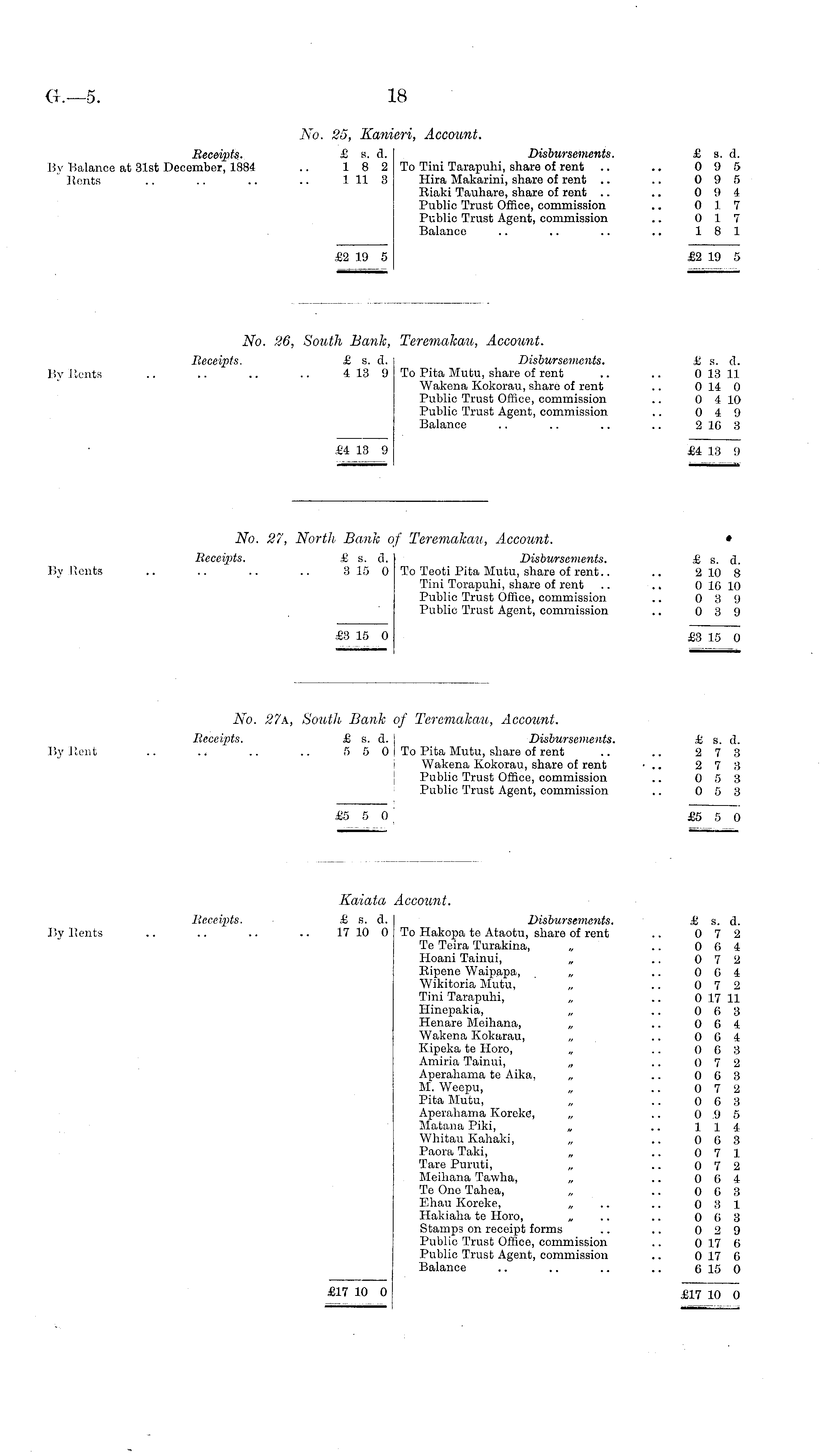 No. 26, South Bank, Teremakau, Account. Receipts. £ s. d. Disbursements. £ s. d. By Rents .. .. .. .. 4 13 9 To Pita Mutu, share of rent .. .. 0 13 11 Wakena Kokorau, share of rent .. 0 14 0 Public Trust Office, commission .. 0 4 10 Public Trust Agent, commission .. 0 4 9 Balance .. .. .. .. 216 3 £4 13 9 £4 13 9