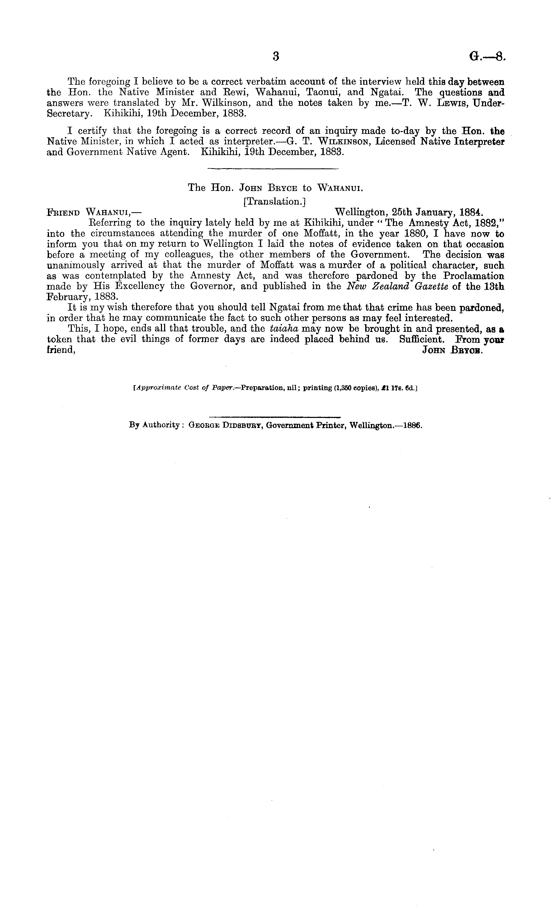 The Hon. John Bkyce to Wahanui. [Translation.] Fbiend Wahanui, — Wellington, 25th January, 1884. Eeferring to the inquiry lately held by me at Kihikihi, under "The Amnesty Act, 1882," into the circumstances attending the murder of one Moffatt, in the year 1880, I have now to inform you that on my return to Wellington I laid the notes of evidence taken on that occasion before a meeting of my colleagues, the other members of the Government. The decision was unanimously arrived at that the murder of Moffatt was a murder of a political character, such as was contemplated by the Amnesty Act, and was therefore pardoned by the Proclamation made by His Excellency the Governor, and published in the New Zealand Gazette of the 13th February, 1883. It is my wish therefore that you should tell Ngatai from me that that crime has been pardoned, in order that he may communicate the fact to such other persons as may feel interested. This, I hope, ends all that trouble, and the taiaha may now be brought in and presented, as a token that the evil things of former days are indeed placed behind us. Sufficient. Prom your friend, John Bbyob. [Approximate Cost of Paper.— Preparation, nil; printing (1,360 copies), £1 17s. 6d.]