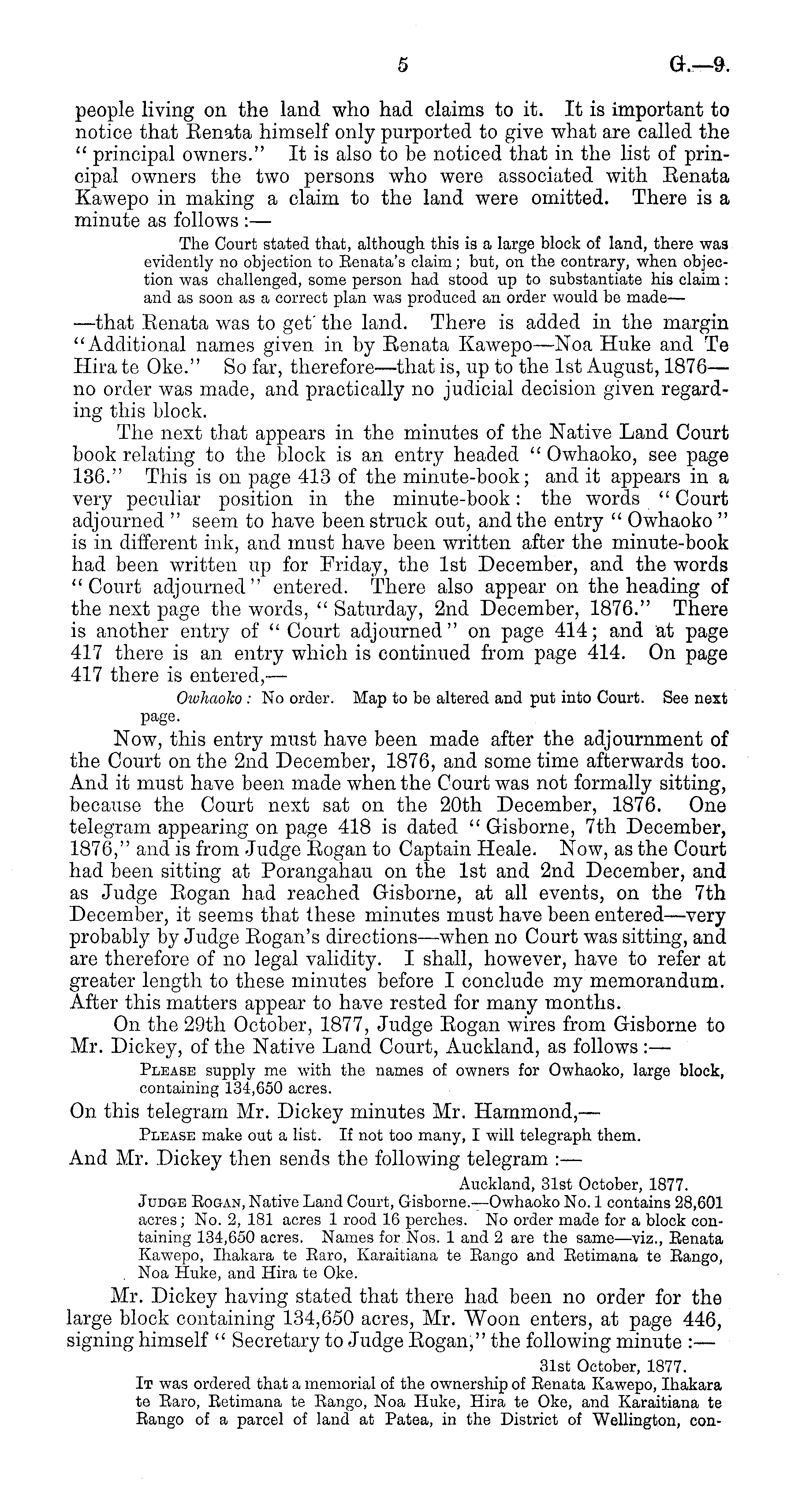 people living on the land who had claims to it. It is important to notice that Eenata himself only purported to give what are called the " principal owners." It is also to be noticed that in the list of principal owners the two persons who were associated with Eenata Kawepo in making a claim to the land were omitted. There is a minute as follows :— The Court stated that, although this is a large block of land, there was evidently no objection to Eenata's claim; but, on the contrary, when objection was challenged, some person had stood up to substantiate his claim: and as soon as a correct plan was produced an order would be made— —that Eenata was to get' the land. There is added in the margin "Additional names given in by Eenata Kawepo —Noa Huke and Te Hira te Oke." So far, therefore—that is, up to the Ist August, 1876— no order was made, and practically no judicial decision given regarding this block. The next that appears in the minutes of the Native Land Court book relating to the block is an entry headed " Owhaoko, see page 136." This is on page 413 of the minute-book; and it appears in a very peculiar position in the minute-book: the words " Court adjourned " seem to have been struck out, and the entry " Owhaoko " is in different ink, and must have been written after the minute-book had been written up for Friday, the Ist December, and the words "Court adjourned" entered. There also appear on the heading of the next page the words, " Saturday, 2nd December, 1876." There is another entry of "Court adjourned" on page 414; and at page 417 there is an entry which is continued from page 414. On page 417 there is entered, — Owhaoko : No order. Map to be altered and put into Court. See next page. Now, this entry must have been made after the adjournment of the Court on the 2nd December, 1876, and some time afterwards too. And it must have been made when the Court was not formally sitting, because the Court next sat on the 20th December, 1876. One telegram appearing on page 418 is dated " Gisborne, 7th December, 1876," and is from Judge Eogan to Captain Heale. Now, as the Court had been sitting at Porangahau on the Ist and 2nd December, and as Judge Eogan had reached Gisborne, at all events, on the 7th December, it seems that these minutes must have been entered —very probably by Judge Eogan's directions—when no Court was sitting, and are therefore of no legal validity. I shall, however, have to refer at greater length to these minutes before I conclude my memorandum. After this matters appear to have rested for many months. On the 29th October, 1877, Judge Eogan wires from Gisborne to Mr. Dickey, of the Native Land Court, Auckland, as follows :— Please supply me with the names of owners for Owhaoko, large block, containing 134,650 acres. On this telegram Mr. Dickey minutes Mr. Hammond, — Please make out a list. If not too many, I will telegraph them. And Mr. Dickey then sends the following telegram : — Auckland, 31st October, 1877. Judge Eogan, Native Land Court, Gisborne.—Owhaoko No. 1 contains 28,601 acres; No. 2, 181 acres 1 rood 16 perches. No order made for a block containing 134,650 acres. Names for Nos. 1 and 2 are the same—viz., Eenata Kawepo, Ihakara te Earo, Karaitiana te Eango and Eetimana te Eango, . Noa Huke, and Hira te Oke. Mr. Dickey having stated that there had been no order for the large block containing 134,650 acres, Mr. Woon enters, at page 446, signing himself " Secretary to Judge Eogan," the following minute :— 31st October, 1877. It was ordered that a memorial of the ownership of Eenata Kawepo, Ihakara te Earo, Eetimana te Eango, Noa Huke, Hira te Oke, and Karaitiana te Eango of a parcel of land at Patea, in the District of Wellington, con-