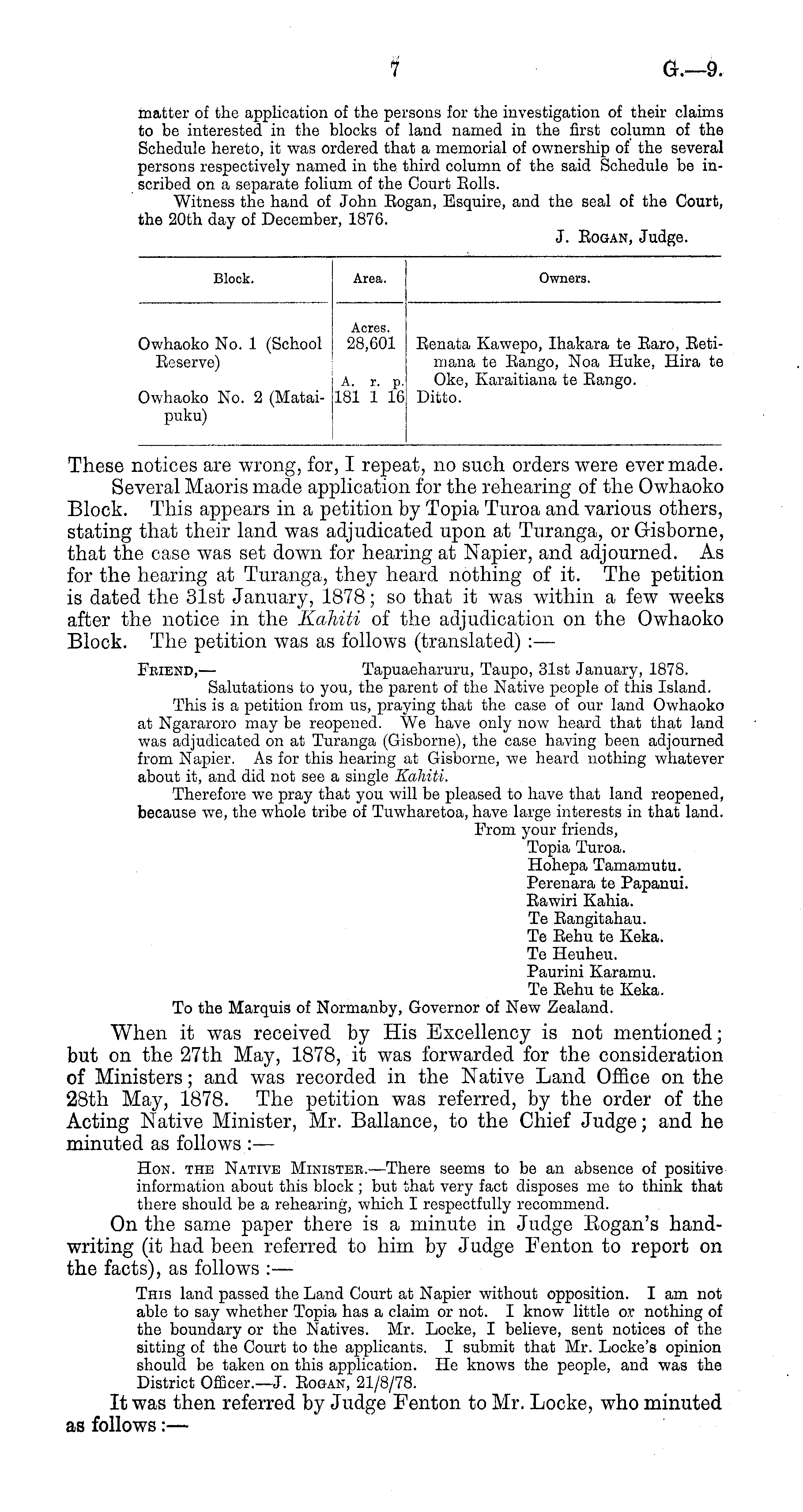 These notices are wrong, for, I repeat, no such orders were ever made. Several Maoris made application for the rehearing of the Owhaoko Block. This appears in a petition by Topia Turoa and various others, stating that their land was adjudicated upon at Turanga, orGisborne, that the case was set down for hearing at Napier, and adjourned. As for the hearing at Turanga, they heard nothing of it. The petition is dated the 31st January, 1878; so that it was within a few weeks after the notice in the Kahiti of the adjudication on the Owhaoko Block. The petition was as follows (translated) : — Feiend, — Tapuaeharuru, Taupo, 31st January, 1878. Salutations to you, the parent of the Native people of this Island. This is a petition from us, praying that the case of our land Owhaoko at Ngararoro may be reopened. We have only now heard that that land was adjudicated on at Turanga (Gisborne), the case having been adjourned from Napier. As for this hearing at Gisborne, we heard nothing whatever about it, and did not see a single Kahiti. Therefore we pray that you will be pleased to have that land reopened, because we, the whole tribe of Tuwharetoa, have large interests in that land. From your friends, Topia Turoa. Hohepa Tamamutu. Perenara te Papanui. Eawiri Kahia. Te Eangitahau. Te Eehu te Keka. Te Heuheu. Paurini Karamu. Te Eehu te Keka. To the Marquis of Normanby, Governor of New Zealand. When it was received by His Excellency is not mentioned; but on the 27th May, 1878, it was forwarded for the consideration of Ministers; and was recorded in the Native Land Office on the 28th May, 1878. The petition was referred, by the order of the Acting Native Minister, Mr. Ballance, to the Chief Judge; and he minuted as follows : — Hon. the Native Minister.—There seems to be an absence of positive information about this block ; but that very fact disposes me to think that there should be a rehearing, which I respectfully recommend. On the same paper there is a minute in Judge Eogan's handwriting (it had been referred to him by Judge Fenton to report on the facts), as follows : — This land passed the Land Court at Napier without opposition. I am not able to say whether Topia has a claim or not. I know little or nothing of the boundary or the Natives. Mr. Locke, I believe, sent notices of the sitting of the Court to the applicants. I submit that Mr. Locke's opinion should be taken on this application. He knows the people, and was the District Officer.— J. Eogan, 21/8/78. It was then referred by Judge Fenton to Mr. Locke, who minuted as follows:—