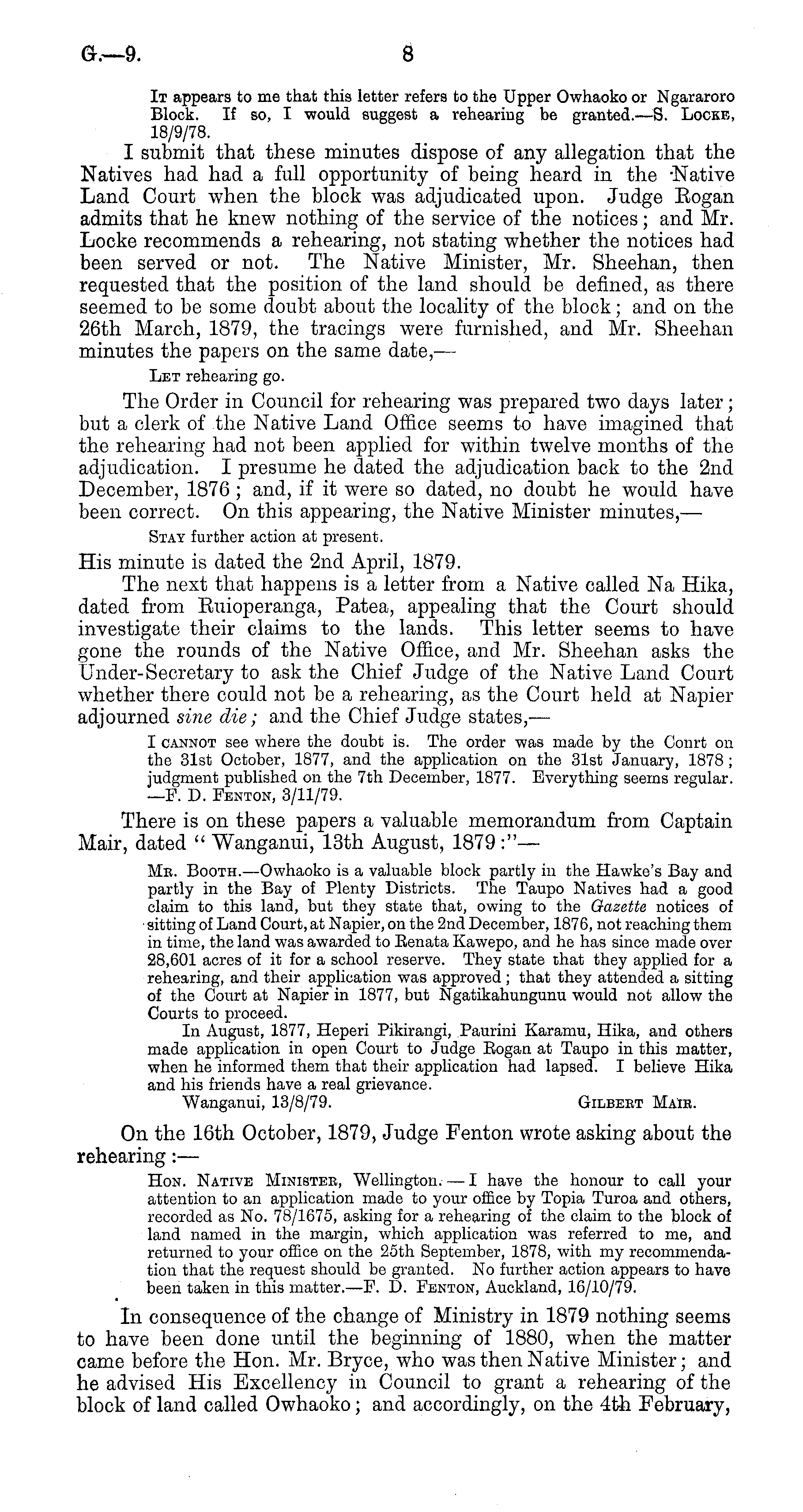 It appears to me that this letter refers to the Upper Owhaoko or Ngararoro Block. If so, I would suggest a rehearing be granted.—S. Locke, 18/9/78. I submit that these minutes dispose of any allegation that the Natives had had a full opportunity of being heard in the -Native Land Court when the block was adjudicated upon. Judge Eogan admits that he knew nothing of the service of the notices; and Mr. Locke recommends a rehearing, not stating whether the notices had been served or not. The Native Minister, Mr. Sheehan, then requested that the position of the land should be defined, as there seemed to be some doubt about the locality of the block; and on the 26th March, 1879, the tracings were furnished, and Mr. Sheehan minutes the papers on the same date, — Let rehearing go. The Order in Council for rehearing was prepared two days later; but a clerk of the Native Land Office seems to have imagined that the rehearing had not been applied for within twelve months of the adjudication. I presume he dated the adjudication back to the 2nd December, 1876 ; and, if it were so dated, no doubt he would have been correct. On this appearing, the Native Minister minutes, — Stay further action at present. His minute is dated the 2nd April, 1879. The next that happens is a letter from a Native called Na Hika, dated from Euioperanga, Patea, appealing that the Court should investigate their claims to the lands. This letter seems to have gone the rounds of the Native Office, and Mr. Sheehan asks the Under-Secretary to ask the Chief Judge of the Native Land Court whether there could not be a rehearing, as the Court held at Napier adjourned sine die; and the Chief Judge states,— I cannot see where the doubt is. The order was made by the Conrt on the 31st October, 1877, and the application on the 31st January, 1878 ; judgment published on the 7th December, 1877. Everything seems regular. —P. D. Fenton, 3/11/79. There is on these papers a valuable memorandum from Captain Mair, dated " Wanganui, 13th August, 1879:" — Mb. Booth. —Owhaoko is a valuable block partly in the Hawke's Bay and partly in the Bay of Plenty Districts. The Taupo Natives had a good claim to this land, but they state that, owing to the Gazette notices of ■ sitting of Land Court, at Napier, on the 2nd December, 1876, not reaching them in time, the land was awarded to Eenata Kawepo, and he has since made over 28,601 acres of it for a school reserve. They state that they applied for a rehearing, and their application was approved ; that they attended a sitting of the Court at Napier in 1877, but Ngatikahungunu would not allow the Courts to proceed. In August, 1877, Heperi Pikirangi, Paurini Karamu, Hika, and others made application in open Court to Judge Eogan at Taupo in this matter, when he informed them that their application had lapsed. I believe Hika and his friends have a real grievance. "Wanganui, 13/8/79. Gilbert Maie. On the 16th October, 1879, Judge Fenton wrote asking about the rehearing:— Hon. Native Ministee, Wellington. — I have the honour to call your attention to an application made to your office by Topia Turoa and others, recorded as No. 78/1675, asking for a rehearing of the claim to the block of land named in the margin, which application was referred to me, and returned to your office on the 25th September, 1878, with my recommendation that the request should be granted. No further action appears to have been taken in this matter. —P. D. Penton, Auckland, 16/10/79. In consequence of the change of Ministry in 1879 nothing seems to have been done until the beginning of 1880, when the matter came before the Hon. Mr. Bryce, who was then Native Minister; and he advised His Excellency in Council to grant a rehearing of the block of land called Owhaoko ; and accordingly, on the 4th February,
