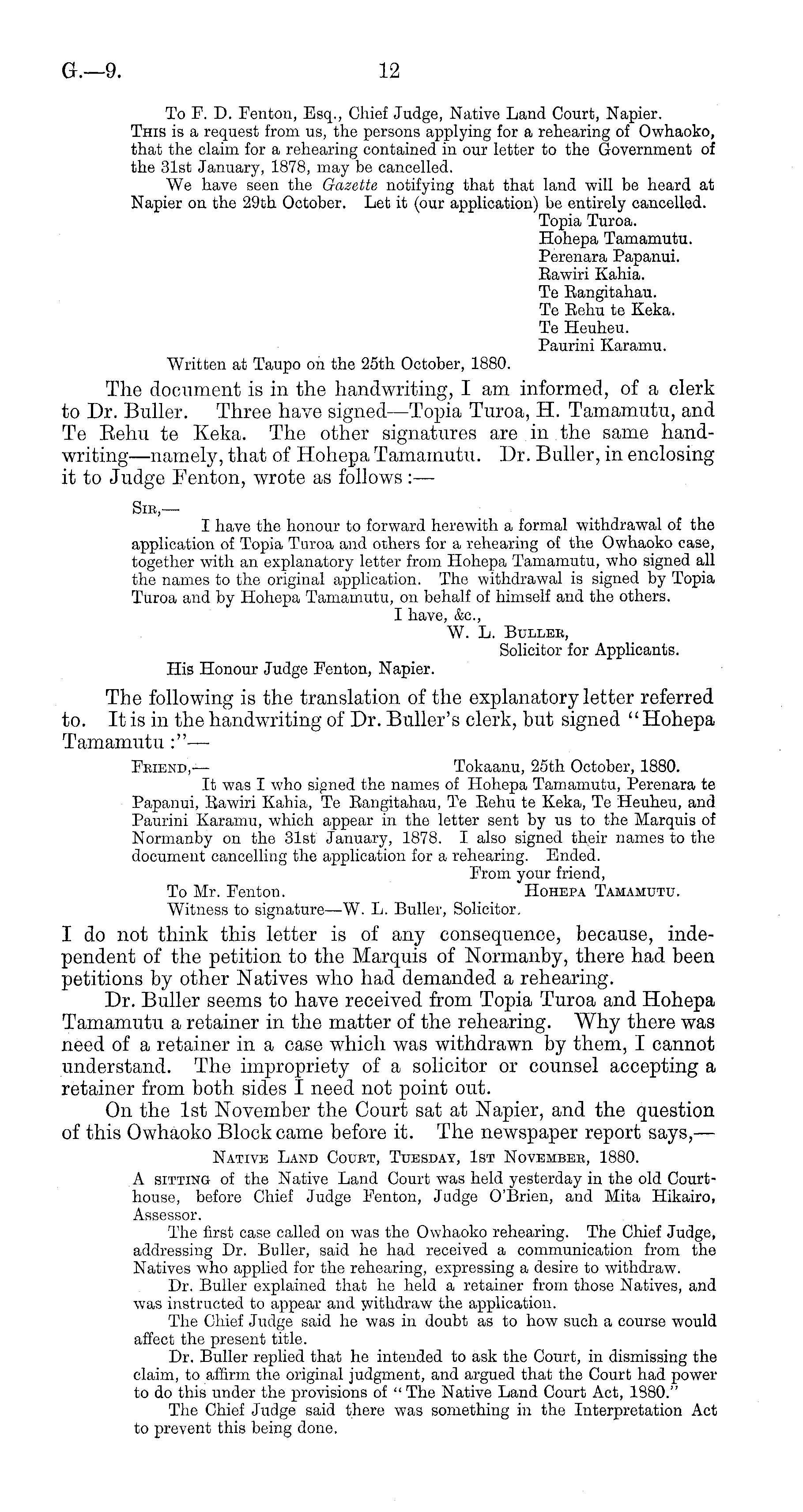 To F. D. Fenton, Esq., Chief Judge, Native Land Court, Napier. This is a request from us, the persons applying for a rehearing of Owhaoko, that the claim for a rehearing contained in our letter to the Government of the 31st January, 1878, may be cancelled. We have seen the Gazette notifying that that land will be heard at Napier on the 29th October. Let it (our application) be entirely cancelled. Topia Turoa. Hohepa Tamamutu. Perenara Papanui. Eawiri Kahia. Te Bangitahau. Te Eehu te Keka. Te Heuheu. Paurini Karamu. Written at Taupo on the 25th October, 1880. The document is in the handwriting, I am informed, of a clerk to Dr. Buller. Three have signed —Topia Turoa, H. Tamamutu, and Te Behu te Keka. The other signatures are in the same handwriting—namely, that of Hohepa Tamamutu. Dr. Buller, in enclosing it to Judge Fenton, wrote as follows: — Sir, — I have the honour to forward herewith a formal withdrawal of the application of Topia Turoa and others for a rehearing of the Owhaoko case, together with an explanatory letter from Hohepa Tamamutu, who signed all the names to the original application. The withdrawal is signed by Topia Turoa and by Hohepa Tamamutu, on behalf of himself and the others. I have, &c, W. L. Buller, Solicitor for Applicants. His Honour Judge Fenton, Napier. The following is the translation of the explanatory letter referred to. It is in the handwriting of Dr. Buller's clerk, but signed "Hohepa Tamamutu :" — Friend,— Tokaanu, 2oth October, 1880. It was I who signed the names of Hohepa Tamamutu, Perenara te Papanui, Bawiri Kahia, Te Bangitahau, Te Behu te Keka, Te Heuheu, and Paurini Karamu, which appear in the letter sent by us to the Marquis of Normanby on the 31st January, 1878. I also signed their names to the document cancelling the application for a rehearing. Ended. From your friend, To Mr. Fenton. Hohepa Tamamutu. Witness to signature—W. L. Buller, Solicitor. I do not think this letter is of any consequence, because, independent of the petition to the Marquis of Normanby, there had been petitions by other Natives who had demanded a rehearing. Dr. Buller seems to have received from Topia Turoa and Hohepa Tamamutu a retainer in the matter of the rehearing. Why there was need of a retainer in a case which was withdrawn by them, I cannot understand. The impropriety of a solicitor or counsel accepting a retainer from both sides I need not point out. On the Ist November the Court sat at Napier, and the question of this Owhaoko Block came before it. The newspaper report says,— Native Land Court, Tuesday, Ist November, 1880. A sitting of the Native Land Court was held yesterday in the old Courthouse, before Chief Judge Fenton, Judge O'Brien, and Mita Hikairo, Assessor. The first case called on was the Owhaoko rehearing. The Chief Judge, addressing Dr. Buller, said he had received a communication from the Natives who applied for the rehearing, expressing a desire to withdraw. Dr. Buller explained that he held a retainer from those Natives, and was instructed to appear and withdraw the application. The Chief Judge said ho was in doubt as to how such a course would affect the present title. Dr. Buller replied that he intended to ask the Court, in dismissing the claim, to affirm the original judgment, and argued that the Court had power to do this under the provisions of " The Native Land Court Act, 1880." The Chief Judge said there was something in the Interpretation Act to prevent this being done.