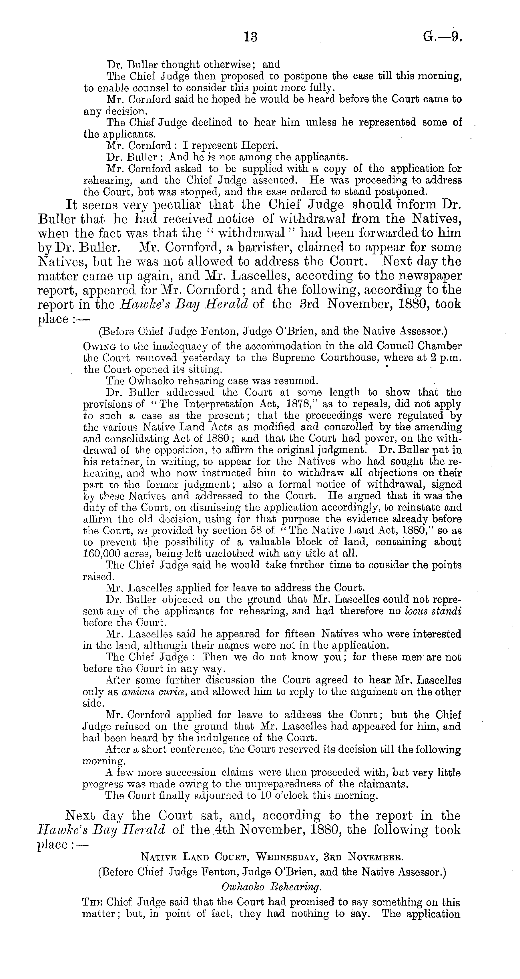 Dr. Buller thought otherwise; and The Chief Judge then proposed to postpone the case till this morning, to enable counsel to consider this point more fully. Mr. Cornford said he hoped he would be heard before the Court came to any decision. The Chief Judge declined to hear him unless he represented some of the applicants. Mr. Cornford : I represent Heperi. Dr. Buller : And he is not among the applicants. Mr. Cornford asked to be supplied with a copy of the application for rehearing, and the Chief Judge assented. He was proceeding to address the Court, but was stopped, and the case ordered to stand postponed. It seems very peculiar that the Chief Judge should inform Dr. Buller that he had received notice of withdrawal from the Natives, when the fact was that the " withdrawal " had been forwarded to him by Dr. Buller. Mr. Cornford, a barrister, claimed to appear for some Natives, but he was not allowed to address the Court. Next day the matter came up again, and Mr. Lascelles, according to the newspaper report, appeared for Mr. Cornford; and the following, according to the report in the HaivTce's Bay Herald of the 3rd November, 1880, took place : — (Before Chief Judge Fenton, Judge O'Brien, and the Native Assessor.) Owing to the inadequacy of the accommodation in the old Council Chamber the Court removed yesterday to the Supreme Courthouse, where at 2 p.m. the Court opened its sitting. The Owhaoko rehearing case was resumed. Dr. Buller addressed the Court at some length to show that the provisions of "The Interpretation Act, 1878," as to repeals, did not apply to such a case as the present; that the proceedings were regulated by the various Native Land Acts as modified and controlled by the amending and consolidating Act of 1880; and that the Court had power, on the withdrawal of the opposition, to affirm the original judgment. Dr. Buller put in his retainer, in writing, to appear for the Natives who had sought the rehearing, and who now instructed him to withdraw all objections on their part to the former judgment; also a formal notice of withdrawal, signed by these Natives and addressed to the Court. He argued that it was the duty of the Court, on dismissing the application accordingly, to reinstate and affirm the old decision, using for that purpose the evidence already before the Court, as provided by section 58 of " The Native Land Act, 1880," so as to prevent the possibility of a valuable block of land, containing about 160,000 acres, being left unclothed with any title at all. The Chief Judge said he would take further time to consider the points raised. Mr. Lascelles applied for leave to address the Court. Dr. Buller objected on the ground that Mr. Lascelles could not represent any of the applicants for rehearing, and had therefore no locus standi before the Court. Mr. Lascelles said he appeared for fifteen Natives who were interested in the land, although their names were not in the application. The Chief Judge : Then we do not know you; for these men are not before the Court in any way. After some further discussion the Court agreed to hear Mr. Lascelles only as amicus curia, and allowed him to reply to the argument on the other side. Mr. Cornford applied for leave to address the Court; but the Chief Judge refused on the ground that Mr. Lascelles had appeared for him, and had been heard by the indulgence of the Court. After a short conference, the Court reserved its decision till the following morning. A few more succession claims were then proceeded with, but very little progress was made owing to the unpreparedness of the claimants. The Court finally adjourned to 10 o'clock this morning. Next day the Court sat, and, according to the report in the Haivke's Bay Herald of the 4th November, 1880, the following took place: — Native Land Court, Wednesday, 3rd November. (Before Chief Judge Fenton, Judge O'Brien, and the Native Assessor.) Owhaoko Behearing. The Chief Judge said that the Court had promised to say something on this matter; but, in point of fact, they had nothing to say. The application