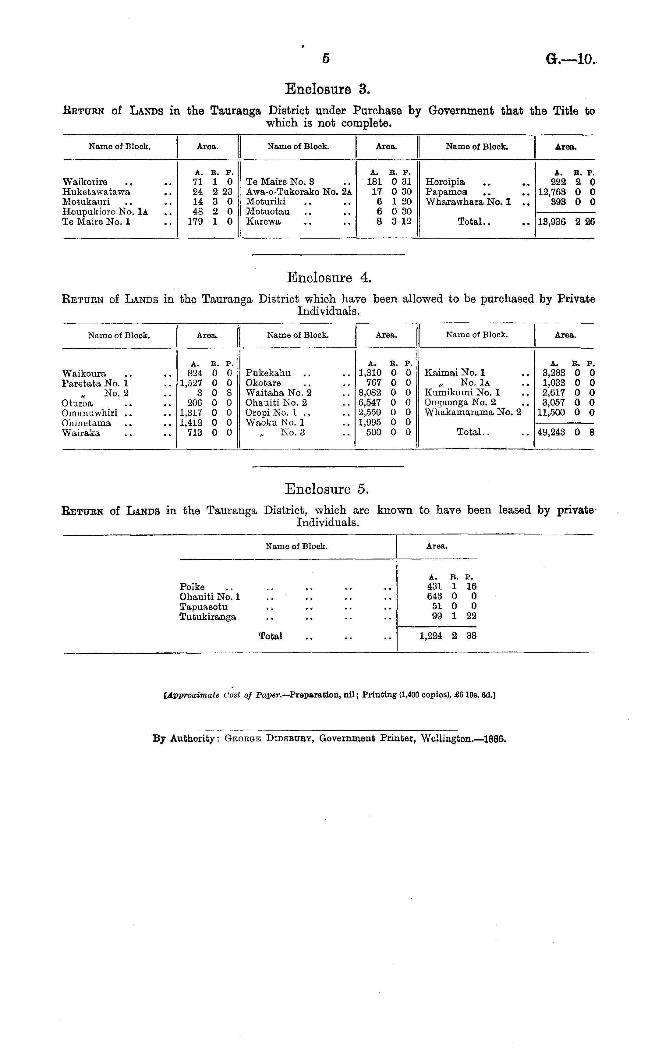 Enclosure 5. Return of Lands in the Tauranga District, which are known to have been leased by private Individuals.