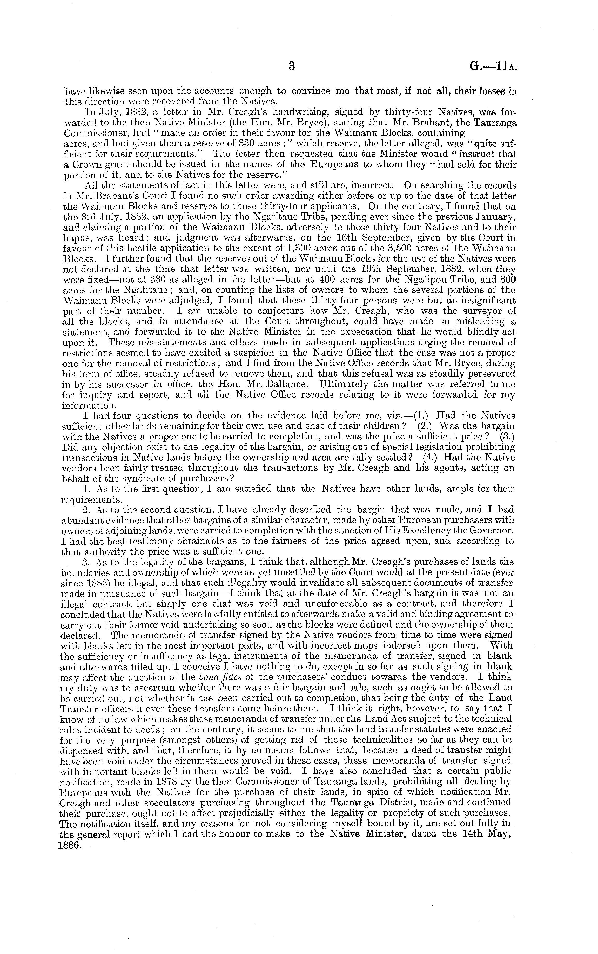have likewise seen upon the accounts enough to convince me that most, if not all, their losses in this direction were recovered from the Natives. In July, 1882, a letter in Mr. Creagh's handwriting, signed by thirty-four Natives, was forwarded to the then Native Minister (the Hon. Mr. Bryce), stating that Mr. Brabant, the Tauranga Commissioner, had "made an order in their favour for the Waimanu Blocks, containing acres, and had given them a reserve of 330 acres ; " which reserve, the letter alleged, was "quite sufficient for their requirements." The letter then requested that the Minister would "instruct that a Crown grant should be issued in the names of the Europeans to whom they " had sold for their portion of it, and to the Natives for the reserve." All the statements of fact in this letter were, and still are, incorrect. On searching the records in Mr. Brabant's Court I found no such order awarding either before or up to the date of that letter the Waimanu Blocks and reserves to those thirty-four applicants. On the contrary, I found that on the 3rd July, 1882, an application by the Ngatitaue Tribe, pending ever since the previous January, and claiming a portion of the Waimanu Blocks, adversely to those thirty-four Natives and to their hapus, was heard; and judgment was afterwards, on the 16th September, given by the Court in favour of this hostile application to the extent of 1,300 acres out of the 3,500 acres of the Waimanu Blocks. I further found that the reserves out of the Waimanu Blocks for the use of the Natives were not declared at the time that letter was written, nor until the 19th September, 1882, when they were fixed —not at 330 as alleged in the letter—but at 400 acres for the Ngatipou Tribe, and 800 acres for the Ngatitaue; and, on counting the lists of owners to whom the several portions of the Waimanu Blocks were adjudged, I found that these thirty-four persons were but an insignificant part of their number. I am unable to conjecture how Mr. Creagh, who was the surveyor of all the blocks, and in attendance at the Court throughout, could have made so misleading a statement, and forwarded it to the Native Minister in the expectation that he would blindly act upon it. These mis-statements and others made in subsequent applications urging the removal of restrictions seemed to have excited a suspicion in the Native Office that the case was not a proper one for the removal of restrictions ; and I find from the Native Office records that Mr. Bryce, during his term of office, steadily refused to remove them, and that this refusal was as steadily persevered in by his successor in office, the Hon. Mr. Ballance. Ultimately the matter was referred to mo for inquiry and report, and all the Native Office records relating to it were forwarded for my information. I had four questions to decide on the evidence laid before me, viz.—(1.) Had the Natives sufficient other lands remaining for their own use and that of their children ? (2.) Was the bargain with the Natives a proper one to be carried to completion, and was the price a sufficient price ? (3.) Did any objection exist to the legality of the bargain, or arising out of special legislation prohibiting transactions in Native lands before the ownership and area are fully settled ? (4.) Had the Native vendors been fairly treated throughout the transactions by Mr. Creagh and his agents, acting on behalf of the syndicate of purchasers ? 1. As to the first question, I am satisfied that the Natives have other lands, ample for their requirements. 2. As to the second question, I have already described the bargin that was made, and I had abundant evidence that other bargains of a similar character, made by other European purchasers with owners of adjoining lands, were carried to completion with the sanction of His Excellency the Governor. I had the best testimony obtainable as to the fairness of the price agreed upon, and according to that authority the price was a sufficient one. 3. As to the legality of the bargains, I think that, although Mr. Creagh's purchases of lands the boundaries and ownership of which were as yet unsettled by the Court would at the present date (ever since 1883) be illegal, and that such illegality would invalidate all subsequent documents of transfer made in pursuance of such bargain—l think that at the date of Mr. Creagh's bargain it was not an illegal contract, but simply one that was void and unenforceable as a contract, and therefore I concluded that the Natives were lawfully entitled to afterwards make a valid and binding agreement to carry out their former void undertaking so soon as the blocks were defined and the ownership of them declared. The memoranda of transfer signed by the Native vendors from time to time were signed with blanks left in the most important parts, and with incorrect maps indorsed upon them. With the sufficiency or insufficency as legal instruments of the memoranda of transfer, signed in blank and afterwards filled up, I conceive I have nothing to do, except in so far as such signing in blank may affect the question of the bona fides of the purchasers' conduct towards the vendors. I think my duty was to ascertain whether there was a fair bargain and sale, such as ought to be allowed to be carried out, not whether it has been carried out to completion, that being the duty of the Land Transfer officers if ever these transfers come before them. I think it right, however, to say that I know of no law which makes these memoranda of transfer under the Land Act subject to the technical rules incident to deeds ; on the contrary, it seems to me that the land transfer statutes were enacted for the very purpose (amongst others) of getting rid of these technicalities so far as they can be dispensed with, and that, therefore, it by no moans follows that, because a deed of transfer might have been void under the circumstances proved in these cases, these memoranda of transfer signed with imp