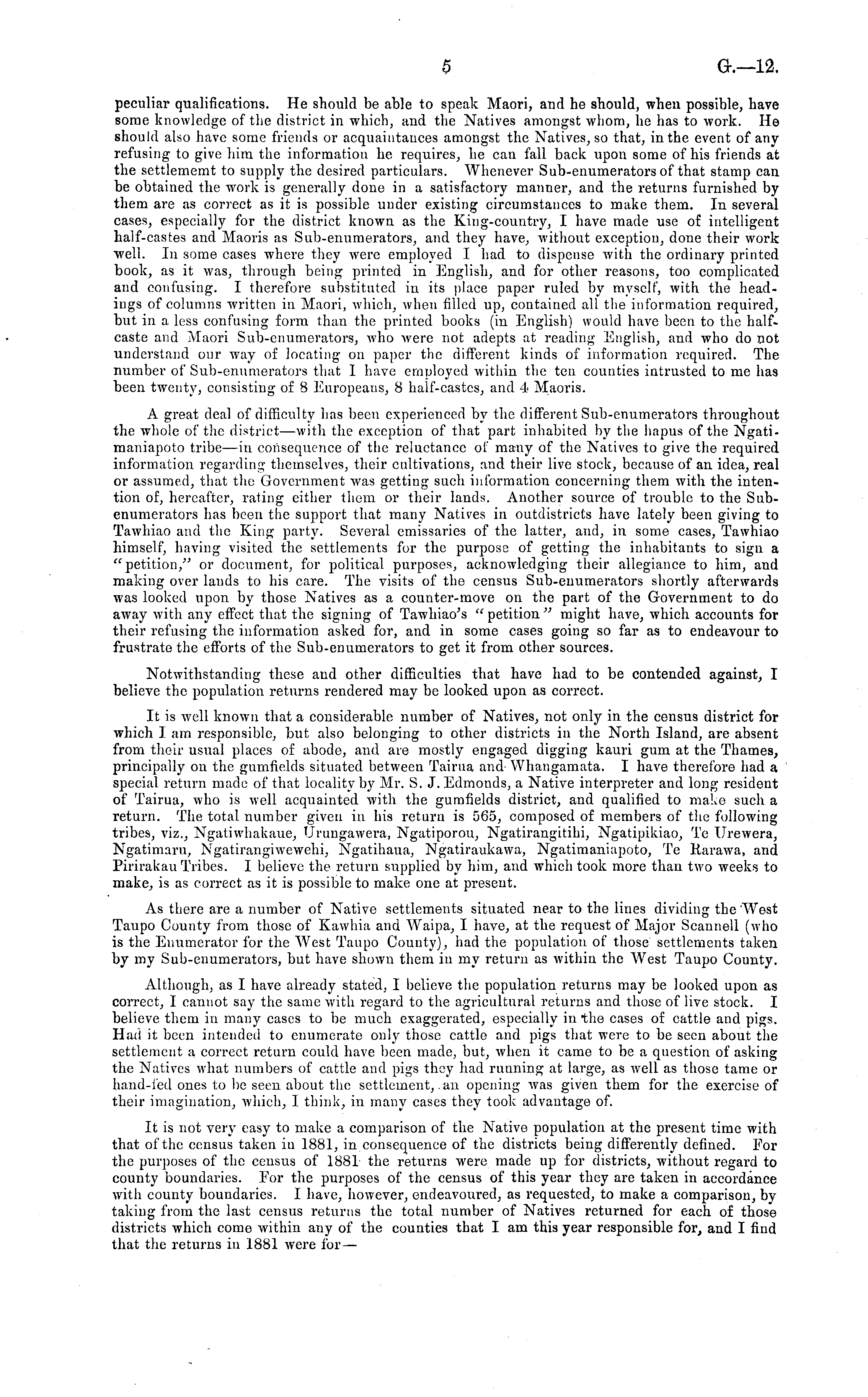 peculiar qualifications. He should be able to speak Maori, and he should, when possible, have some knowledge of the district in which, and the Natives amongst whom, he has to work. He should also have some friends or acquaintances amongst the Natives, so that, in the event of any refusing to give him the information he requires, he can fall back upon some of his friends at the scttlememt to supply the desired particulars. Whenever Sub-enumerators of that stamp can be obtained the work is generally done in a satisfactory manner, and the returns furnished by them are as correct as it is possible under existing circumstances to make them. In several cases, especially for the district known as the King-country, I have made use of intelligent half-castes and Maoris as Sub-enumerators, and they have, without exception, done their work well. In some cases where they were employed I had to dispense with the ordinary printed book, as it was, through being printed in English, and for other reasons, too complicated and confusing. I therefore substituted in its place paper ruled by myself, with the headings of columns written in Maori, which, when filled up, contained all the information required, but in a less confusing form than the printed books (in English) would have been to the halfcaste and Maori Sub-enumerators, who were not adepts at reading English, and who do not understand our way of locating on paper the different kinds of information required. The number of Sub-enumerators that I have employed within the ten counties intrusted to me has been twenty, consisting of 8 Europeans, 8 half-castes, and 4 Maoris. A great deal of difficulty has been experienced by the different Sub-enumerators throughout the whole of the district —with the exception of that part inhabited by the hapus of the Ngatimaniapoto tribe—in consequence of the reluctance of many of the Natives to give the required information regarding themselves, their cultivations, and their live stock, because of an idea, real or assumed, that the Government was getting such information concerning them with the intention of, hereafter, rating either them or their lands. Another source of trouble to the Subenumerators has been the support that many Natives in outdistricts have lately been giving to Tawhiao and the King party. Several emissaries of the latter, and, in some cases, Tawhiao himself, having visited the settlements for the purpose of getting the inhabitants to sign a "petition," or document, for political purposes, acknowledging their allegiance to him, and making over lands to his care. The visits of the census Sub-enumerators shortly afterwards was looked upon by those Natives as a counter-move on the part of the Government to do away with any effect that the signing of Tawhiao's " petition " might have, which accounts for their refusing the information asked for, and in some cases going so far as to endeavour to frustrate the efforts of the Sub-enumerators to get it from other sources. Notwithstanding these and other difficulties that have had to be contended against, I believe the population returns rendered may be looked upon as correct. It is well known that a considerable number of Natives, not only in the census district for which I am responsible, but also belonging to other districts in the North Island, are absent from their usual places of abode, and are mostly engaged digging kauri gum at the Thames, principally on the gumfields situated between Tairua and Whangamata. I have therefore had a special return made of that locality by Mr. S. J. Edmonds, a Native interpreter and long resident of Tairua, who is well acquainted with the gumfields district, and qualified to make such a return. The total number given in his return is 565, composed of members of the following tribes, viz., Ngatiwhakaue, Urungawera, Ngatiporou, Ngatirangitihi, Ngatipikiao, Te Urewera, Ngatimaru, Ngatirangiwewehi, Ngatihaua, Ngatiraukawa, Ngatimaniapoto, Te Rarawa, and Pirirakau Tribes. I believe the return supplied by him, and which took more than two weeks to make, is as correct as it is possible to make one at present. As there are a number of Native settlements situated near to the lines dividing the West Taupo County from those of Kawhia and Waipa, I have, at the request of Major Scannell (who is the Enumerator for the West Taupo County), had the population of those settlements taken by my Sub-enumerators, but have shown them in my return as within the West Taupo County. Although, as I have already stated, I believe the population returns may be looked upon as correct, I cannot say the same with regard to the agricultural returns and those of live stock. I believe them in many cases to be much exaggerated, especially in the cases of cattle and pigs. Had it been intended to enumerate only those cattle and pigs that were to be seen about the settlement a correct return could have been made, but, when it came to be a question of asking the Natives what numbers of cattle and pigs they had running at large, as well as those tame or hand-fed ones to be seen about the settlement, .an opening was given them for the exercise of their imagination, which, I think, in many cases they took advantage of. It is not very easy to make a comparison of the Native population at the present time with that of the census taken in 1881, in consequence of the districts being differently defined. For the purposes of the census of 1881 the returns were made up for districts, without regard to county boundaries. For the purposes of the census of this year they are taken in accordance with county boundaries. I have, however, endeavoured, as requested, to make a comparison, by taking from the last census returns the total number of Natives returned for each of those districts which come within any of the counties that I am this year responsible for, and I find that the returns in 1881 were for —