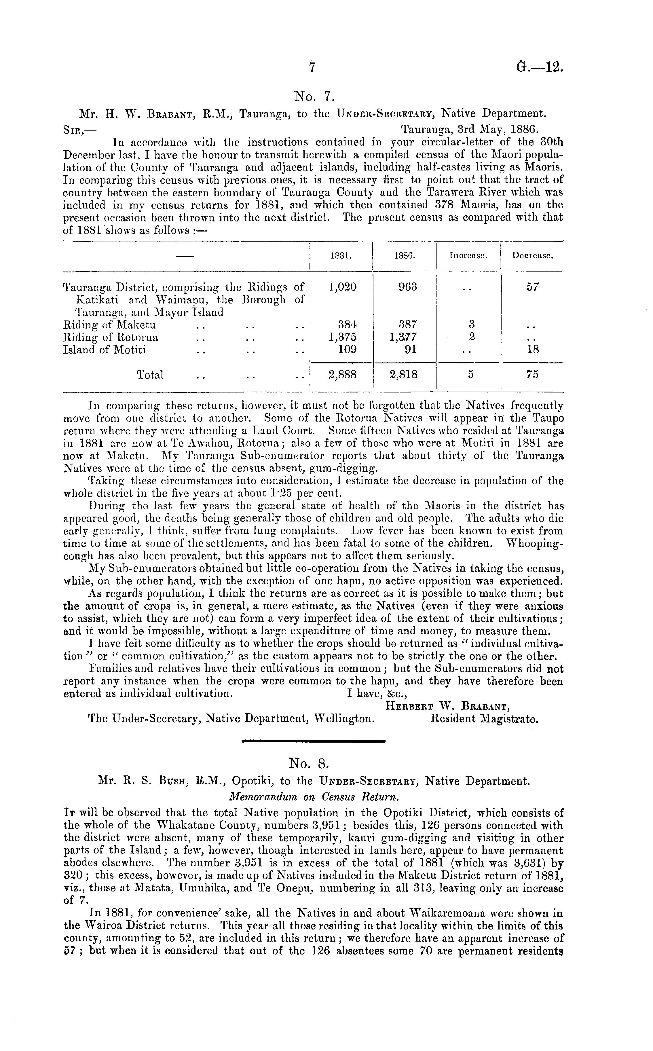 No. 7. Mr. H. W. Brabant, R.M., Tauranga, to the Under-Secretary, Native Department. Sir,— Tauranga, 3rd May, 1886. In accordance with the instructions contained in your circular-letter of the 30th December last, I have the honour to transmit herewith a compiled census of the Maori populalation of the County of Tauranga and adjacent islands, including half-castes living as Maoris. In comparing this census with previous ones, it is necessary first to point out that the tract of country between the eastern boundary of Tauranga County and the Tarawera River which was included in my census returns for 1881, and which then contained 378 Maoris, has on the present occasion been thrown into the next district. The present census as compared with that of 1881 shows as follows :—