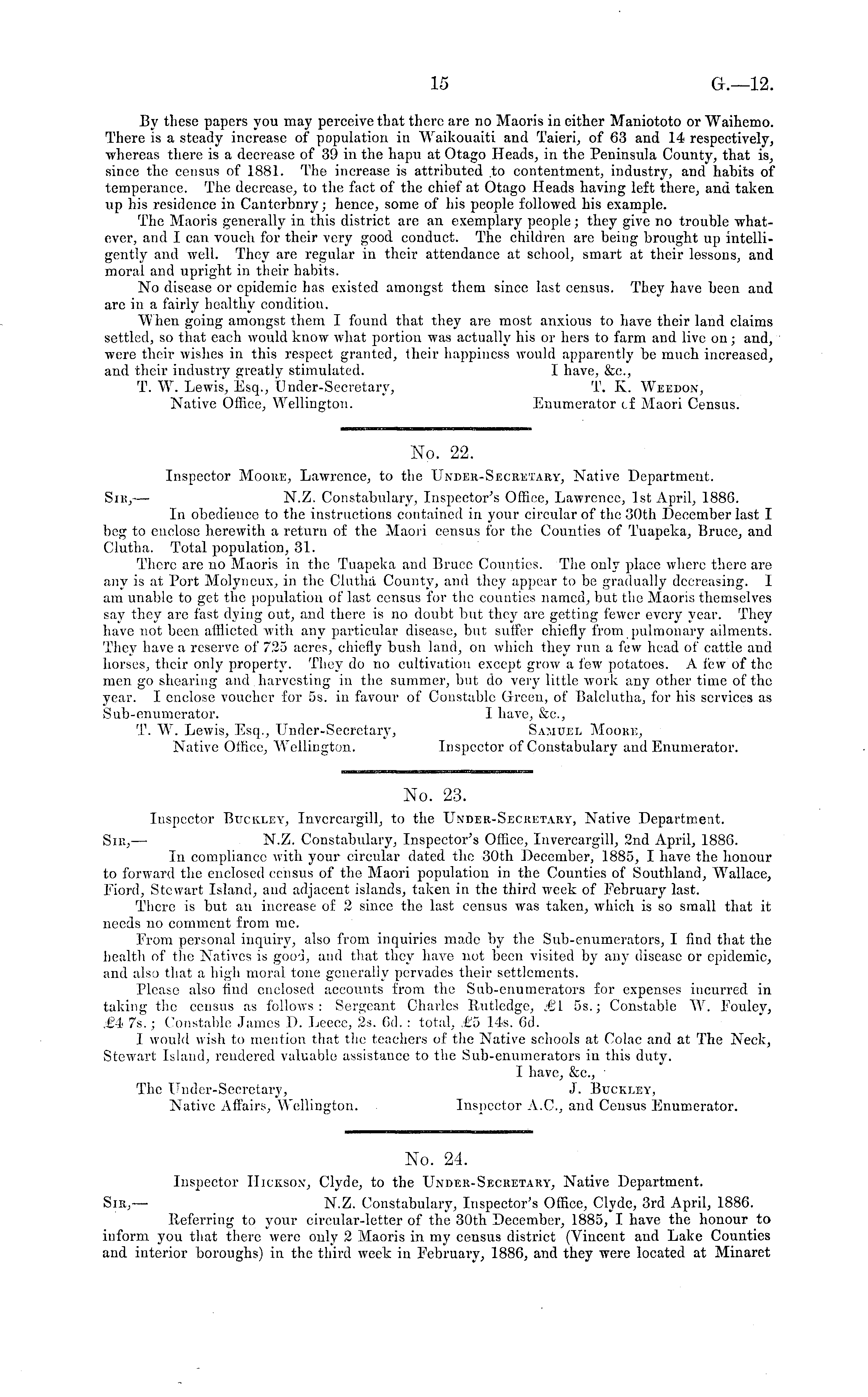 No. 23. Inspector Buckley, Invcrcargill, to the Under-Secretary, Native Department. Sir, — N.Z. Constabulary, Inspector's Office, Invercargill, 2nd April, 1886. In compliance with your circular dated the 30th December, 1885, I have the honour to forward the enclosed census of the Maori population in the Counties of Southland, Wallace, Fiord, Stewart Island, and adjacent islands, taken in the third week of February last. There is but an increase of 2 since the last census was taken, which is so small that it needs no comment from me. From personal inquiry, also from inquiries made by the Sub-enumerators, I find that the health of the Natives is good, and that they have not been visited by any disease or epidemic, and also that a high moral tone generally pervades their settlements. Plcaso also find enclosed accounts from the Sub-enumerators for expenses incurred in taking the census as follows: Sergeant Charles Rutledge, _£l 55.; Constable W. Foulcy, .£4 75.; Constable James D. Beece, 2s. 6d. : total, .€5 14s. 6d. I would wish to mention that the teachers of the Native schools at Colac and at The Neck, Stewart Island, rendered valuable assistance to the Sub-enumerators in this duty. I have, &c, The Under-Secretary, J. Buckley, Native Affairs, Wellington. Inspector A.C., and Census F.numcrator.