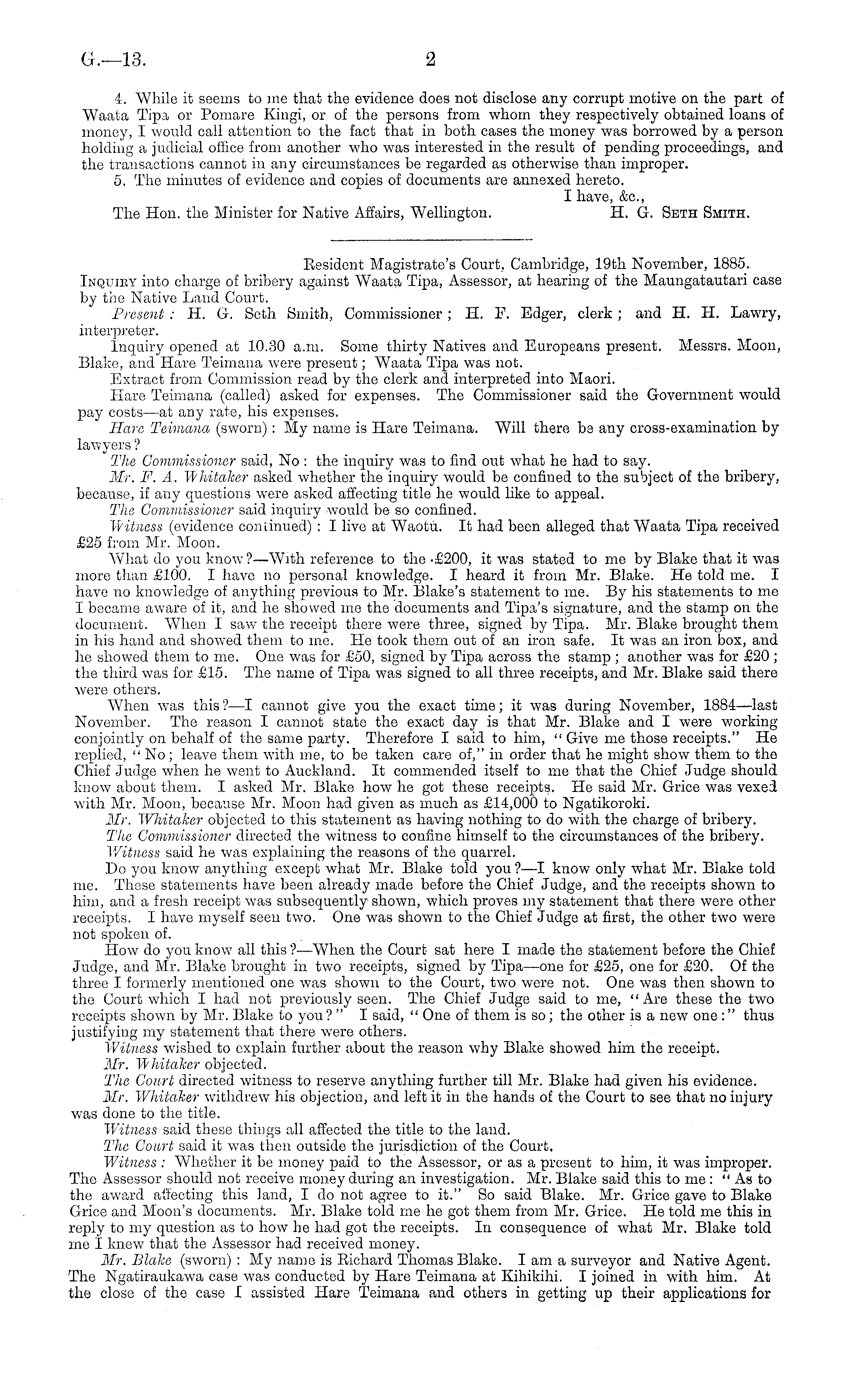 Eesidcnt Magistrate's Court, Cambridge, 19th November, 1885. Inquiry into charge of bribery against Waata Tipa, Assessor, at hearing of the Maungatautari case by the Native Land Court. Present : H. G. Seth Smith, Commissioner ; H. F. Edger, clerk ; and H. H. Lawry, interpreter. Inquiry opened at 10.30 a.m. Some thirty Natives and Europeans present. Messrs. Moon, Blako, and Hare Teimana were present; Waata Tipa was not. Extract from Commission read by the clerk and interpreted into Maori. Hare Teimana (called) asked for expenses. The Commissioner said the Government would pay costs —at any rate, his expenses. Hare Teimana (sworn): My name is Hare Teimana. Will there bo any cross-examination by lawyers ? The Commissioner said, No : the inquiry was to find out what he had to say. Mr. F. A. Whitaker asked whether the inquiry would be confined to the subject of the bribery, because, if any questions were asked affecting title he would like to appeal. The Commissioner said inquiry would be so confined. Witness (evidence continued) : I live at Waotu. It had been alleged that Waata Tipa received £25 from Mr. Moon. AVhat do you know?—With reference to the £200, it was stated to me by Blake that it was more than £100. I have no personal knowledge. I heard it from Mr. Blake. He told me. I have no knowledge of anything previous to Mr. Blake's statement to me. By his statements to me I became aware of it, and he showed mo the documents and Tipa's signature, and the stamp on the document. When I saw the receipt there were three, signed by Tipa. Mr. Blake brought them in his hand and showed them to me. He took them out of an iron safe. It was an iron box, and he showed them to me. One was for £50, signed by Tipa across the stamp ; another was for £20 ; the third was for £15. The name of Tipa was signed to all three receipts, and Mr. Blake said there were others. When was this ?—I cannot give you the exact time; it was during November, 1884—last November. The reason I cannot state the exact day is that Mr. Blake and I were working conjointly on behalf of the same party. Therefore I said to him, " Give me those receipts." He replied, " No; leave them with me, to be taken care of," in order that he might show them to the Chief Judge when he went to Auckland. It commended itself to me that the Chief Judge should know about them. I asked Mr. Blake how he got these receipts. He said Mr. Grice was vexed with Mr. Moon, because Mr. Moon had given as much as £14,000 to Ngatikoroki. Mr. Wliitaker objected to this statement as having nothing to do with the charge of bribery. The Commissioner directed the witness to confine himself to the circumstances of the bribery. Witness said he was explaining the reasons of the quarrel. Do you know anything except what Mr. Blake told you ?—I know only what Mr. Blake told me. Those statements have been already made before the Chief Judge, and the receipts shown to him, and a fresh receipt was subsequently shown, which proves my statement that there were other receipts. I have myself seen two. One was shown to the Chief Judge at first, the other two were not spoken of. How do you know all this ?—When the Court sat here I made the statement before the Chief Judge, and Mr. Blako brought in two receipts, signed by Tipa—one for £25, one for £20. Of the three I formerly mentioned one was shown to the Court, two were not. One was then shown to the Court which I had not previously seen. The Chief Judge said to me, "Are these the two receipts shown by Mr. Blake to you? " I said, " One of them is so ; the other is a new one :" thus justifying my statement that there were others. Witness wished to explain further about the reason why Blake showed him the receipt. Mr. Whitaker objected. The Court directed witness to reserve anything further till Mr. Blake had given his evidence. Mr. Whitaker withdrew his objection, and left it in the hands of the Court to see that no injury was done to the title. Witness said these things all affected the title to the land. The Court said it was then outside the jurisdiction of the Court. Witness : Whether it be money paid to the Assessor, or as a present to him, it was improper. The Assessor should not receive money during an investigation. Mr. Blako said this to me :"As to the award affecting this land, I do not agree to it." So said Blake. Mr. Grice gave to Blake Grice and Moon's documents. Mr. Blake told me he got them from Mr. Grice. He told me this in reply to my question as to how he had got the receipts. In consequence of what Mr. Blake told me I knew that the Assessor had received money. Mr. Blako (sworn) :My name is Richard Thomas Blake. lam a surveyor and Native Agent. The Ngatiraukawa case was conducted by Hare Teimana at Kihikihi. I joined in with him. At the close of the case I assisted Hare Teimana and others in getting up their applications for