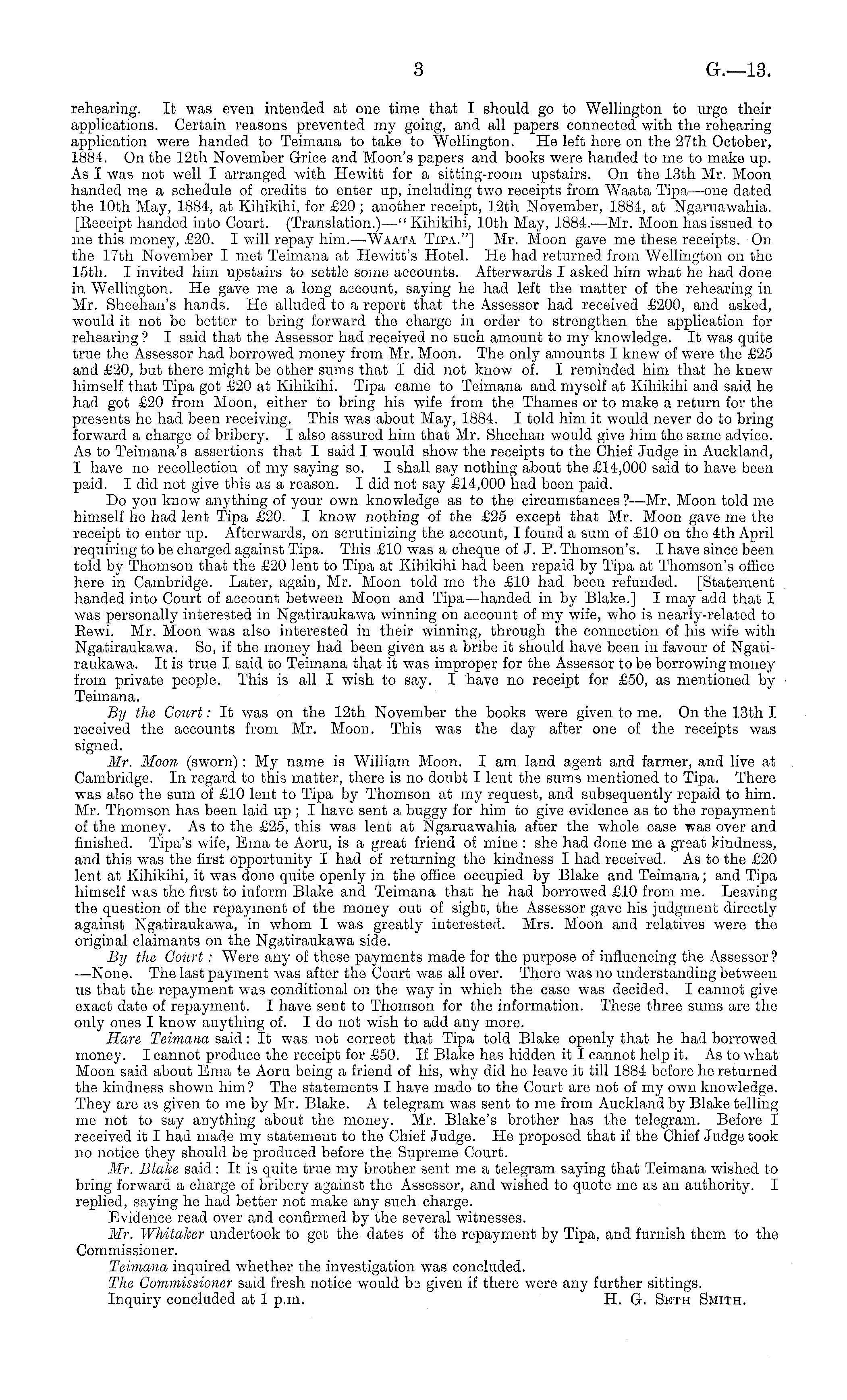 rehearing. It was even intended at one time that I should go to Wellington to urge their applications. Certain reasons prevented my going, and all papers connected with the rehearing application were handed to Teimana to take to Wellington. He left here on the 27th October, 188-1. On the 12th November Grice and Moon's papers and books were handed to me to make up. As I was not well I arranged with Hewitt for a sitting-room upstairs. On the 13th Mr. Moon handed me a schedule of credits to enter up, including two receipts from Waata Tipa —one dated the 10th May, 1884, at Kihikihi, for £20 ; another receipt, 12th November, 1884, at Ngaruawahia. [Eeceipt handed into Court. (Translation.) —"Kihikihi, 10th May, 1884.—Mr. Moon has issued to me this money, £20. I will repay him.—Waata Tipa."] Mr. Moon gave me these receipts. On the 17th November I met Teimana at Hewitt's Hotel. He had returned from Wellington on the 15th. I invited him upstairs to settle some accounts. Afterwards I asked him what he had done in Wellington. He gave me a long account, saying he had left the matter of the rehearing in Mr. Sheehan's hands. He alluded to a report that the Assessor had received £200, and asked, would it not be better to bring forward the charge in order to strengthen the application for rehearing ? I said that the Assessor had received no such amount to my knowledge. It was quite true the Assessor had borrowed money from Mr. Moon. The only amounts I knew of were the £25 and £20, but there might be other sums that I did not know of. 1 reminded him that he knew himself that Tipa got £20 at Kihikihi. Tipa came to Teimana and myself at Kihikihi and said he had got £20 from Moon, either to bring his wife from the Thames or to make a return for the presents he had been receiving. This was about May, 1884. I told him it would never do to bring forward a charge of bribery. I also assured him that Mr. Sheehan would give him the same advice. As to Teimana's assertions that I said I would show the receipts to the Chief Judge in Auckland, I have no recollection of my saying so. I shall say nothing about the £14,000 said to have been paid. I did not give this as a reason. I did not say £14,000 had been paid. Do you know anything of your own knowledge as to the circumstances?—Mr. Moon told me himself he had lent Tipa £20. I know nothing of the £25 except that Mr. Moon gave me the receipt to enter up. Afterwards, on scrutinizing the account, I found a sum of £10 on the 4th April requiring to be charged against Tipa. This £10 was a cheque of J. P. Thomson's. I have since been told by Thomson that the £20 lent to Tipa at Kihikihi had been repaid by Tipa at Thomson's office here in Cambridge. Later, again, Mr. Moon told me the £10 had been refunded. [Statement handed into Court of account between Moon and Tipa —handed in by Blake.] I may add that I was personally interested in Ngatiraukawa winning on account of my wife, who is nearly-related to Eewi. Mr. Moon was also interested hi their winning, through the connection of his wife with Ngatiraukawa. So, if the money had been given as a bribe it should have been in favour of Ngatiraukawa. It is true I said to Teimana that it was improper for the Assessor to be borrowing money from private people. This is all I wish to say. I have no receipt for £50, as mentioned by Teimana. By the Court: It was on the 12th November the books were given to me. On the 13th I received the accounts from Mr. Moon. This was the day after one of the receipts was signed. Mr. Moon (sworn): My name is William Moon. I am land agent and farmer, and live at Cambridge. In regard to this matter, there is no doubt I lent the sums mentioned to Tipa. There was also the sum of £10 lent to Tipa by Thomson at my request, and subsequently repaid to him. Mr. Thomson has been laid up ; I have sent a buggy for him to give evidence as to the repayment of the money. As to the £25, this was lent at Ngaruawahia after the whole case was over and finished. Tipa's wife, Ema te Aoru, is a great friend of mine : she had done me a great kindness, and this was the first opportunity I had of returning the kindness I had received. As to the £20 lent at Kihikihi, it was done quite openly in the office occupied by Blake and Teimana; and Tipa himself was the first to inform Blake and Teimana that he had borrowed £10 from me. Leaving the question of tho repayment of the money out of sight, the Assessor gave his judgment directly against Ngatiraukawa, in whom I was greatly interested. Mrs. Moon and relatives were tho original claimants on the Ngatiraukawa side. By the Court: Were any of these payments made for the purpose of influencing the Assessor? ■ —None. The last payment was after the Court was all over. There was no understanding between us that the repayment was conditional on the way in which the case was decided. I cannot give exact date of repayment. I have sent to Thomson for the information. These three sums are the only ones I know anything of. Ido not wish to add any more. Hare Teimana said: It was not correct that Tipa told Blake openly that he had borrowed money. I cannot produce the receipt for £50. If Blake has hidden it I cannot help it. As to what Moon said about Ema te Aoru being a friend of his, why did he leave it till 1884 before he returned the kindness shown him? The statements I have made to the Court are not of my own knowledge. They are as given to me by Mr. Blake. A telegram was sent to me from Auckland by Blake telling me not to say anything about the money. Mr. Blake's brother has the telegram. Before I received it I had made my statement to the Chief Judge. He proposed that if the Chief Judge took no notice they should be produced before the Supreme Court. Mr. Blake said : It is quite true my brother sent me a telegram saying that Teimana wished to bring forward a charge of bribery against the Assessor, and wished to quote me as an authority. I replied, saying