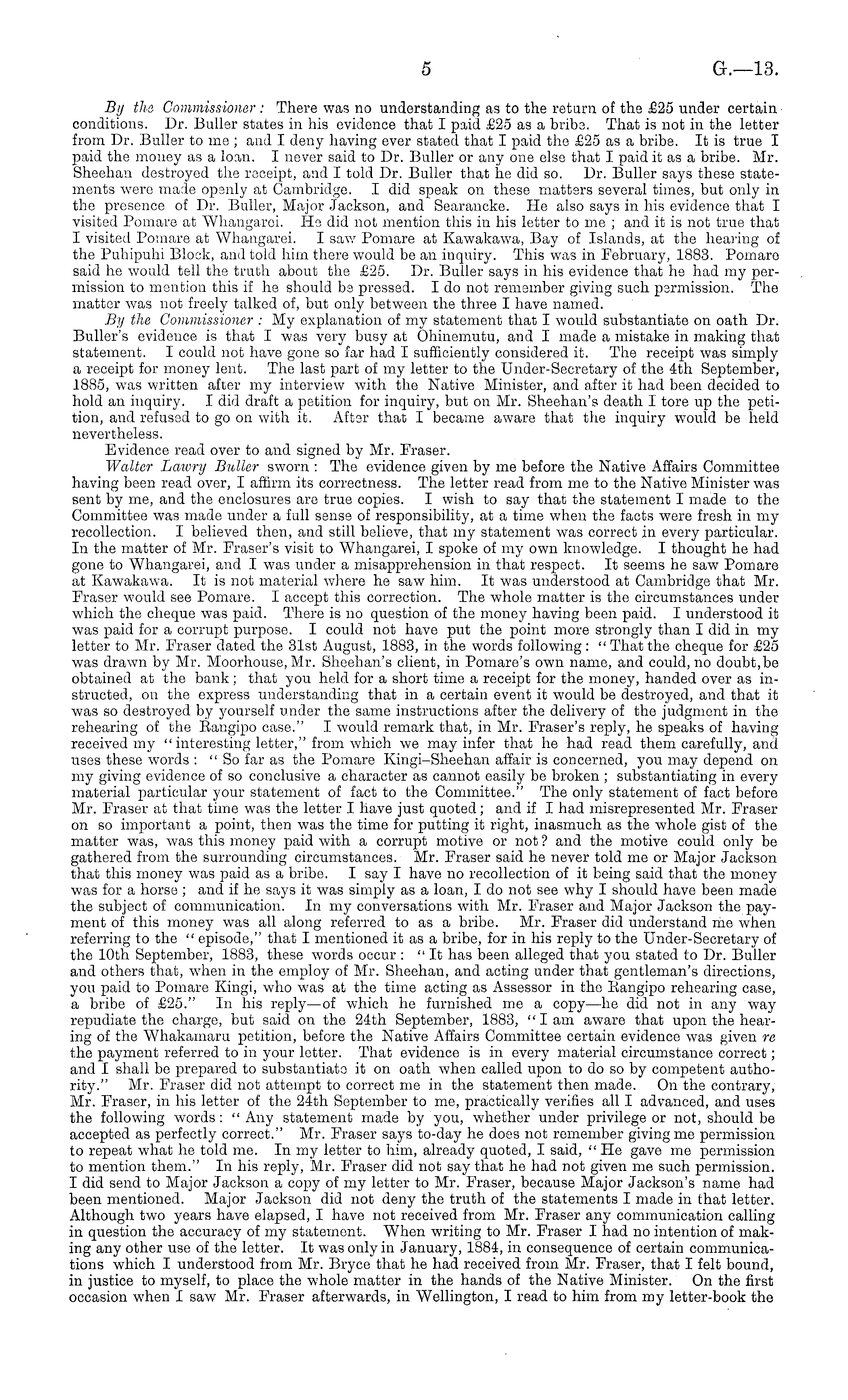 By the Commissioner : There was no understanding as to the return of the £25 under certain conditions. Dr. Buller states in his evidence that I paid £25 as a bribe. That is not in the letter from Dr. Buller to me ; and I deny having ever stated that I paid the £25 as a bribe. It is true I paid the money as a loan. I never said to Dr. Buller or any one else that I paid it as a bribe. Mr. Sheehan destroyed the receipt, and I told Dr. Buller that he did so. Dr. Buller says these statements were made openly at Cambridge. I did speak on these matters several times, but only in the presence of Dr. Buller, Major Jackson, and Searancke. He also says in his evidence that I visited Pomare at Whangarei. He did not mention this in his letter to me ; and it is not true that I visited Pomare at Whangarei. I saw Pomare at Kawakawa, Bay of Islands, at the hearing of the Puhipuhi Block, and told him there would be an inquiry. This was in February, 1883. Pomaro said he would tell the truth about the £25. Dr. Buller says in his evidence that he had my permission to mention this if he should be pressed. Ido not remember giving such permission. The matter was not freely talked of, but only between the three I have named. By the Commissioner : My explanation of my statement that I would substantiate on oath Dr. Buller's evidence is that I was very busy at Ohinemutu, and I made a mistake in making that statement. I could not have gone so far had I sufficiently considered it. The receipt was simply a receipt for money lent. The last part of my letter to the Under-Secretary of the 4th September, 1885, was written after my interview with the Native Minister, and after it had been decided to hold an inquiry. I did draft a petition for inquiry, but on Mr. Sheehan's death I tore up the petition, and refused to go on with it. After that I became aware that the inquiry would be held nevertheless. Evidence read over to and signed by Mr. Fraser. Walter Laivry Buller sworn : The evidence given by me before the Native Affairs Committee having been read over, I affirm its correctness. The letter read from me to the Native Minister was sent by me, and the enclosures are true copies. I wish to say that the statement I made to the Committee was made under a full sense of responsibility, at a time when the facts were fresh in my recollection. I believed then, and still believe, that my statement was correct in every particular. In the matter of Mr. Fraser's visit to Whangarei, I spoke of my own knowledge. I thought he had gone to Whangarei, and I was under a misapprehension in that respect. It seems he saw Pomare at Kawakawa. It is not material where he saw him. It was understood at Cambridge that Mr. Fraser would see Pomaro. I accept this correction. The whole matter is the circumstances under which the cheque was paid. There is no question of the money having been paid. I understood it was paid for a corrupt purpose. I could not have put the point more strongly than I did in my letter to Mr. Fraser dated the 31st August, 1883, in the words following: " That the cheque for £25 was drawn by Mr. Moorhouse, Mr. Sheehan's client, in Pomare's own name, and could, no doubt,be obtained at the bank; that you held for a short time a receipt for the money, handed over as instructed, on the express understanding that in a certain event it would be destroyed, and that it was so destroyed by 3 rourself under the same instructions after the delivery of the judgment in the rehearing of the Bangipo case." I would remark that, in Mr. Fraser's reply, he speaks of having received my " interesting letter," from which we may infer that ho had read them carefully, and uses these words : "So far as the Pomare Kingi-Sheehan affair is concerned, you may depend on my giving evidence of so conclusive a character as cannot easily be broken ; substantiating in every material particular your statement of fact to the Committee." The only statement of fact before Mr. Fraser at that time was the letter I have just quoted; and if I had misrepresented Mr. Fraser on so important a point, then was the time for putting it right, inasmuch as the whole gist of the matter was, was this money paid with a corrupt motive or not ? and the motive could only be gathered from the surrounding circumstances. Mr. Fraser said he never told me or Major Jackson that this money was paid as a bribe. I say I have no recollection of it being said that the money was for a horse ; and if he says it was simply as a loan, Ido not see why I should have been made the subject of communication. In my conversations with Mr. Fraser and Major Jackson the payment of this money was all along referred to as a bribe. Mr. Fraser did understand me when referring to the " episode," that I mentioned it as a bribe, for in his reply to the Under-Secretary of the 10th September, 1883, these words occur : "It has been alleged that you stated to Dr. Buller and others that, when in the employ of Mr. Sheehan, and acting under that gentleman's directions, you paid to Pomare Kingi, who was at the time acting as Assessor in the liangipo rehearing case, a bribe of £25." In his reply—of which he furnished me a copy —he did not in any way repudiate the charge, but said on the 24th September, 1883, "lam aware that upon the hearing of the Whakainaru petition, before the Native Affairs Committee certain evidence was given re the payment referred to in your letter. That evidence is in every material circumstance correct; and I shall be prepared to substantiate it on oath when called upon to do so by competent authority." Mr. Fraser did not attempt to correct me in the statement then made. On the contrary, Mr. Fraser, in his letter of the 24th September to me, practically verifies all I advanced, and uses the following words : " Any statement made by you, whether under privilege or not, should be accepted as perfectly correct." Mr. Fraser says to-day he does not remember giving me permission to repeat what he