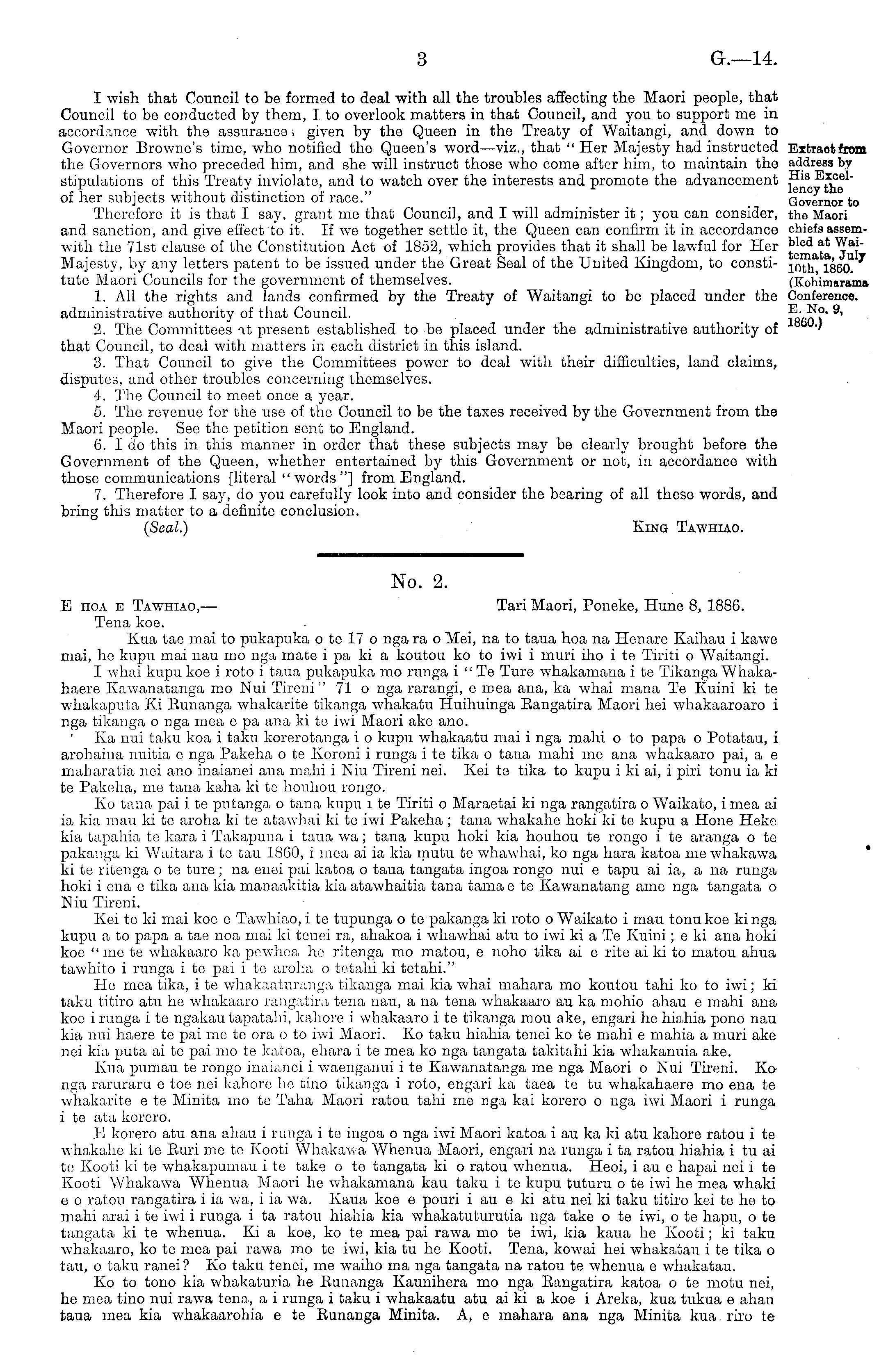 No. 2. E hoa c Tawhiao, — Tari Maori, Poneke, Huno 8, 1886. Tena koe. Kua tae mai to pukapuka o to 17 o nga ra o Mci, na to taua hoa na Henare Kaihau i kawe mai, ho kupu mai nau mo nga mate i pa ki a koutou ko to iwi i muri iho i te Tiriti o Waitangi. I whai kupu koe i roto i taua pukapuka mo runga i " Te Ture whakamana i to Tikanga Whakahaere Kawanatanga mo Nui Tircni" 71 o nga rarangi, c mea ana, ka whai mana Te Kuini ki to whakaputa Xi Bunanga whakarite tikanga whakatu Huihuinga Bangatira Maori hoi whakaaroaro i nga tikanga o nga mea c pa ana ki to iwi Maori ake ano. Ka nui taku koa i taku korerotanga i o kupu whakaatu mai i nga mahi o to papa o Potatau, i arohaiua nuitia c nga Pakeha o te Koroni i runga i te tika o tana mahi me ana whakaaro pai, a c maharatia nei ano inaianei ana mahi i Niu Tireni nei. Kei to tika to kupu iki ai, i piri tonu ia ki te Pakeha, me tana kaha kite houhou rongo. Ko tana pai i te putanga o tana kupu l te Tiriti o Maraetai ki nga rangatira o Waikato, i mea ai ia kia mau kite aroha kite atawhai kite iwi Pakeha; tana whakahe hoki kite kupu a Hone Heke kia tapahia te kara i Takapuna i taua wa; tana kupu hoki kia houhou te rongo i te aranga o te pakanga ki Waitara i te tau 1860, i mea ai ia kia mutu te whawhai, ko nga hara katoa me whakawa kite ritenga ote ture ;na enei pai katoa o taua tangata ingoa rongo nui c tapu ai ia, ana runga hoki i cna c tika ana kia manaakitia kia atawhaitia tana tama c to Kawanatang ame nga tangata o Niu Tireni. Kei to ki mai koe c Tawhiao, i to tupunga o te pakanga ki roto o Waikato i mau tonu koe kinga kupu ato papa a tae noa mai ki tenei ra, ahakoa i whawhai atu to iwi ki aTe Kuini; eki ana hoki koe " mo te whakaaro ka pewhoa ho ritenga mo matou, c noho tika ai o rite ai ki to matou ahua tawhito i runga i te pai i te aroha o tetahi ki tetahi." He mea tika, i te whakaaturanga tikanga mai kia whai mahara mo koutou tahi ko to iwi; ki taku titiro atu he whakaaro rangatira tena nau, a na tena whakaaro au ka mohio ahau c mahi ana koe i runga i te ngakautapataln, kahore i whakaaro i te tikanga mou ake, engari he hiahia pono nau kia nui haere te pai me te ora oto iwi Maori. Ko taku hiahia tenei ko te mahi c mahia a muri ake nei kia puta ai te pai mo te katoa, ehara i te mea ko nga tangata takitahi kia whakanuia ake. Kua pumau te rongo inaianei i waenganui ite Kawanatanga me nga Maori o Nui Tireni. Konga raruraru c toe nei kahore he tino tikanga i roto, engari ka taea te tv whakahaere mo ena te whakarite c te Minita mo te Taha Maori ratou tahi me nga kai korero o nga iwi Maori i runga i te ata korero. E korero atu ana ahau i runga i te ingoa o nga iwi Maori katoa i au ka ki atu kahore ratou i te whakahe kite Buri me to Kooti Whakawa Whenua Maori, engari na runga ita ratou hiahia itv ai te Kooti kite whakapumau ite take ote tangata ki o ratou whenua. Heoi, iau c hapai nei ite Kooti Whakawa Whenua Maori ho whakamana kau taku i to kupu tuturu o te iwi he mea whaki c o ratou rangatira iia wa, iia wa. Kaua koe o pouri iau c ki atu nei ki taku titiro kei te he to mahi arai i te iwi i runga i ta ratou hiahia kia whakatuturutia nga take o te iwi, o te hapu, o te tangata kite whenua. Xi a koe, ko te mea pai rawa mo te iwi, kia kaua he Kooti; ki taku whakaaro, ko te mea pai rawa mo to iwi, kia tv he Kooti. Tena, kowai hei whakatau ite tika o tau, o taku ranei? Ko taku tenei, me waiho ma nga tangata na ratou te whenua c whakatau. Ko to tono kia whakaturia he Bunanga Kaunihera mo nga Bangatira katoa o te motu nei, he mea tino nui rawa tena, a i runga i taku i whakaatu atu ai ki a koe i Areka, kua tukua c ahau taua mea kia whakaarohia c te Bunanga Minita. A, c mahara ana nga Minita kua riro te