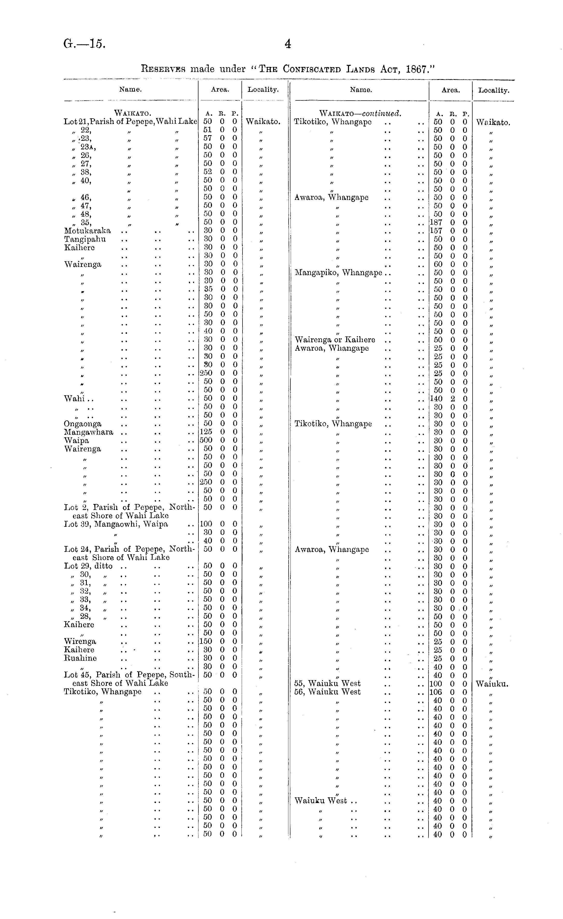 Name. Area. Locality. Waikato. Lot 21,Parish of Pepepe,WahiLake 22, „ „ "„ -23, „ „'23a, „ 26, „ 27, „ 38, „ 40, A. B. P. 50 0 0 51 0 0 57 0 0 50 0 0 50 0 0 50 0 0 52 0 0 50 0 0 50 0 0 50 0 0 50 0 0 50 0 0 50 0 0 30 0 0 30 0 0 30 0 0 30 0 0 30 0 0 30 0 0 30 0 0 35 0 0 30 0 0 30 0 0 50 0 0 30 0 0 '10 0 0 30 0 0 30 0 0 30 0 0 SO 0 0 250 0 0 50 0 0 50 0 0 50 0 0 50 0 0 50 0 0 50 0 0 125 0 0 500 0 0 50 0 0 50 0 0 50 0 0 50 0 0 250 0 0 50 0 0 50 0 0 50 0 0 Waikato. _ 46, „ 47, „ 48, „ 35, Motukaraka langipahu Kaihere Wairenga Wahi .. '.'. 3ngaonga Mangawhara Waipa Wairenga Lot 2, Parish of Pepepe, Northeast Shore of Wahi Lake Lot 39, Mangaowhi, Waipa 100 0 0 30 0 0 40 0 0 ! 50 0 0 Lot 24, Parish of Pepepe, North- I east Shore of Wahi Lake Lot 29, ditto .. „ 30, „ „ 31, „ „ 32, „ .. „ 33, „ „ 34, „ .. „ 28, „ Kaihere 50 0 0 50 0 0 50 0 0 50 0 0 50 0 0 50 0 0 50 0 0 50 0 0 50 0 0 150 0 0 30 0 0 30 0 0 30 0 0 i 50 0 0 Wirenga Kaihere .'. - Etuahine Lot 45, Parish of Pepepe, South- j east Shore of Wahi Lake rikotiko, Whangape .. .. : „ .. .. 50 0 0 50 0 0 50 0 0 50 0 0 50 0 0 50 0 0 50 0 0 50 0 0 50 0 0 50 0 0 50 0 0 50 0 0 50 0 0 50 0 0 j 50 0 0 80 0 0 50 0 0 i 50 0 0 .. „ . . . . ! " . .