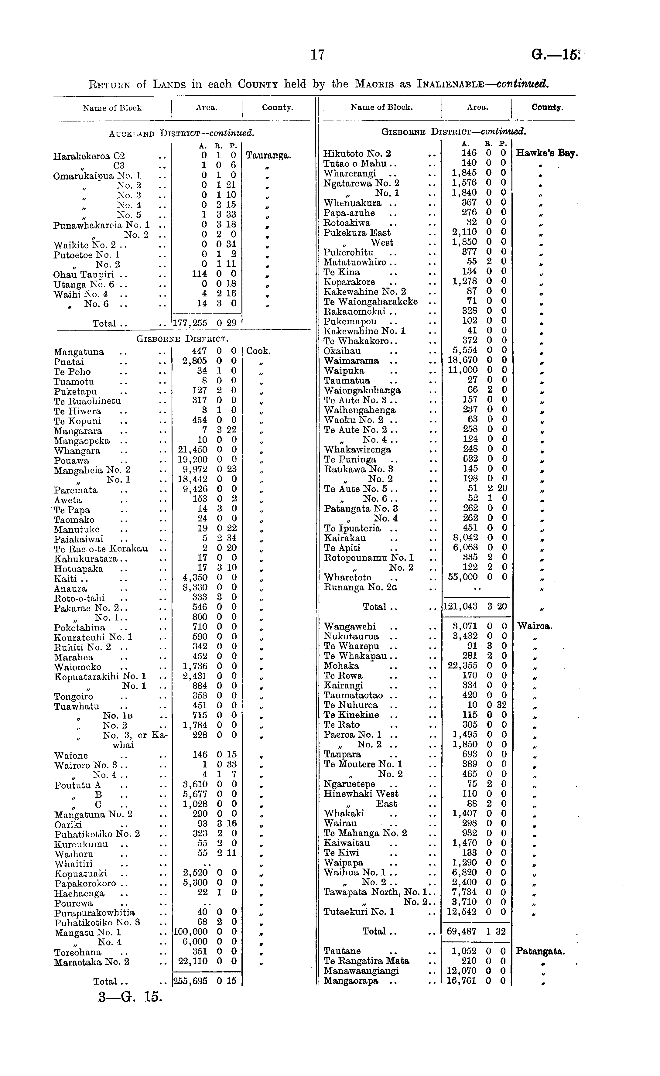 Name of Block. Area. County. Gisboene D: isteict — contin; act. Hikutoto No. 2 Tutae o Mahu Wharerangi Ngatarewa No. 2 No. 1 Whcnuakura Papa-aruhe Botoakiwa Pukekura East West Pukerohitu Matatuowhiro Te Kina Koparakore Kakewahine No. 2 Te Waiongaharakeke .. Bakauomokai Pukemapou Kakewahine No. 1 Te Whakakoro Okaihau Waimarama Waipuka Taumatua Waiongakohanga Te Aute No. 3 .. Waihengahenga Waoku No. 2 .. Te Aute No. 2 .. No. 4 .. Whaka w irenga Te Puninga Baukawa No. 3 No. 2 Te Aute No. 5 .. No. 6 .. Patangata No. 3 No. 4 Te Ipuateria Kairakau Te Apiti Botopounamu No. 1 No. 2 Wharetoto Bunanga No. 2a A. E. P. 146 0 0 140 0 0 1,845 0 0 1,576 0 0 1,840 0 0 367 0 0 276 0 0 32 0 0 2,110 0 0 1,850 0 0 377 0 0 55 2 0 134 0 0 1,278 0 0 87 0 0 71 0 0 328 0 0 102 0 0 41 0 0 372 0 0 5,554 0 0 18,670 0 0 11,000 0 0 27 0 0 66 2 0 157 0 0 237 0 0 63 0 0 258 0 0 124 0 0 248 0 0 622 0 0 145 0 0 198 0 0 51 2 20 52 1 0 262 0 0 262 0 0 451 0 0 8,042 0 0 6,068 0 0 335 2 0 122 2 0 55,000 0 0 Hawke's Bay. _ r. Total 121,043 3 20 Wangawehi Nukutaurua Te Wharepu Te Whakapau Mohaka Te Bewa Kairangi Taumataotao Te Nuhuroa Te Kinekine Te Eato Paeroa No. 1 .. „ No. 2 .. Taupara Te Moutere No. 1 No. 2 Ngaruetepe Hinewhaki West „ East Whakaki Wairau Te Mahanga No. 2 Kaiwaitau Te Kiwi Waipapa Waihua No. 1 .. „ No. 2 .. Tawapata North, No. 1.. No. 2.. Tutaekuri No. 1 3,071 0 0 3,432 0 0 91 3 0 281 2 0 22,355 0 0 170 0 0 334 0 0 420 0 0 10 0 32 115 0 0 305 0 0 1,495 0 0 1,850 0 0 693 0 0 389 0 0 465 0 0 75 2 0 110 0 0 88 2 0 1,407 0 0 298 0 0 932 0 0 1,470 0 0 133 0 0 1,290 0 0 6,820 0 0 2,400 0 0 7,734 0 0 3,710 0 0 12,542 0 0 Wairoa. Total 69,487 1 32 Tautane Te Bangatira Mata Manawaangiangi Mangaorapa 1,052 0 0 210 0 0 12,070 0 0 16,761 0 0 Patangata.