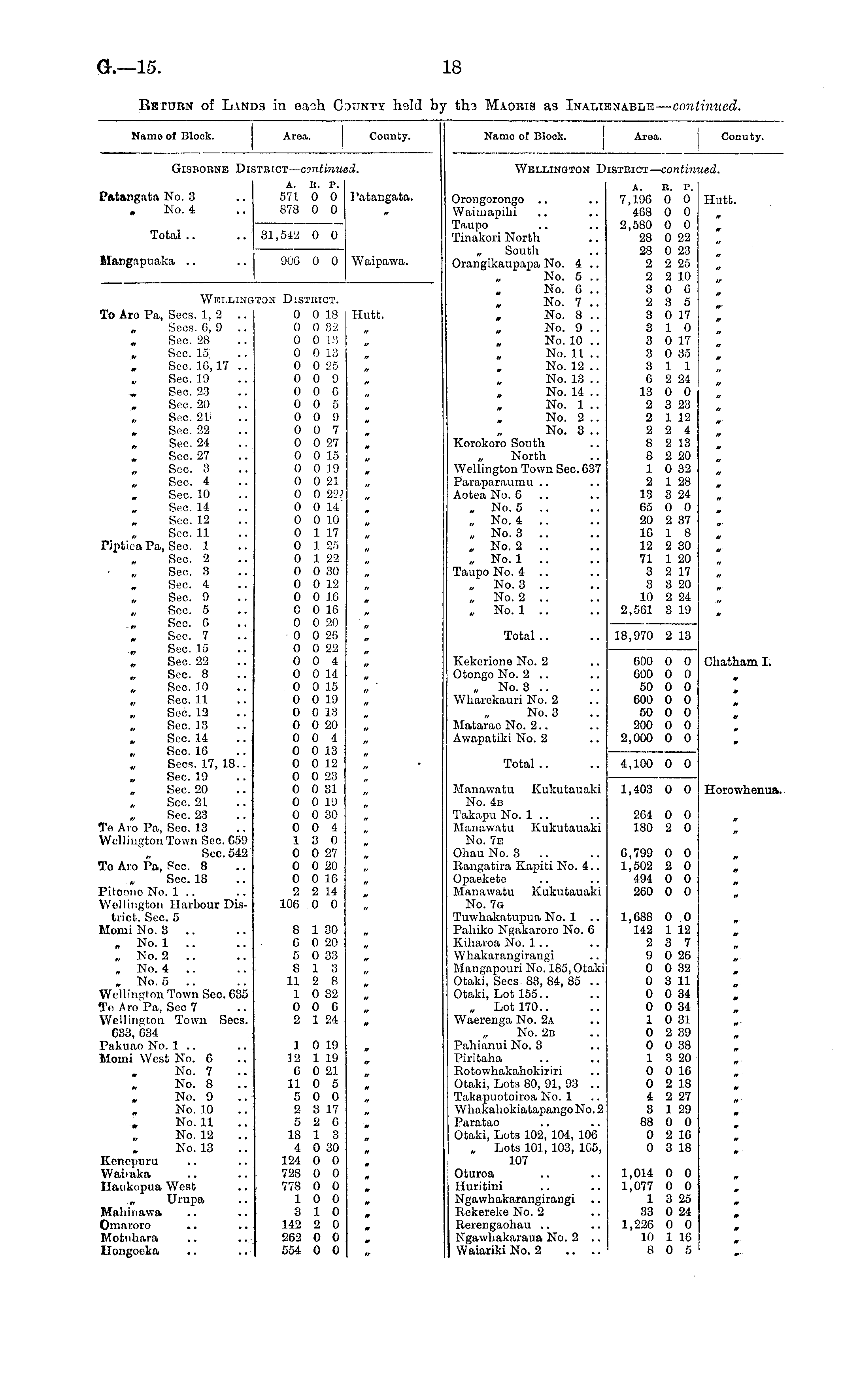 Namo of Block. Area. Conuty. Wellington D '.STRICT — contiiv, teed. Orongorongo Waituapilii Taupo Tinakori North South Orangikaupapa No. 4 .. No. 5 .. No. 0 .. No. 7 .. No. 8 .. No. 9 .. No. 10 .. No. 11 .. No. 12 .. No. 13 .. No. 14 .. No. 1 .. No. 2 .. No. 3 .. Korokoro South North Wellington Town Sec. 637 Paraparaumu Aotea No. 6 .. , No. 5 .. „ No. 4 .. „ No. 3 .. „ No. 2 „ No. 1 .. Taupo No. 4 .. . No. 3 .. „ No. 2 .. , No. 1 .. A. E. P. 7,196 0 0 468 0 0 2,580 0 0 28 0 22 28 0 23 2 2 25 2 2 10 3 0 6 2 3 5 3 0 17 3 10 3 0 17 3 0 35 3 11 6 2 24 13 0 0 2 3 23 2 1 12 2 2 4 8 2 13 8 2 20 1 0 32 2 1 23 18 3 24 65 0 0 20 2 37 16 1 8 12 2 30 71 1 20 3 2 17 3 3 20 10 2 24 2,561 3 19 Hutt. Total 18,970 2 13 Kekerione No. 2 Otongo No. 2 .. „ No. 3 .. Whaiekauri No. 2 No. 3 Matarae No. 2.. Awapatiki No. 2 Chatham I. 600 0 0 600 0 0 50 0 0 600 0 0 50 0 0 200 0 0 2,000 0 0 Total 4,100 0 0 Manawatu Kukutauaki No. 4b Takapu No. 1 .. Manawatu Kukutauaki No. 7e Ohau No. 3 Eangatira Kapiti No. 4.. Opaekete Manawatu Kukutauaki No. 7g Tuwhakatupua No. 1 .. Pahiko Ngakaroro No. 6 Kiharoa No. 1.. Whakarangirangi Mangapouri No. 185, Otaki Otaki, Sees 83, 84, 85 .. Otaki, Lot 155.. „ Lot 170.. Waerenga No. 2a No. 2b Pahianui No. 3 Piritaha Rotovvhakahokiriri Otaki, Lots 80, 91, 93 .. Takapuotoiroa No. 1 WhakahokiatapangoNo. 2 Paratao Otaki, Lots 102, 1.04, 106 „ Lots 101, 103, 105, 107 1,403 0 0 Horowhenua. 264 0 0 180 2 0 6,799 0 0 1,502 2 0 494 0 0 260 0 0 - 1,688 0 0 142 1 12 2 3 7 9 0 26 0 0 32 0 3 11 0 0 34 0 0 34 1 0 31 0 2 39 0 0 38 1 3 20 0 0 16 0 2 18 4 2 27 3 1 29 88 0 0 0 2 16 0 3 18 Oturoa Huritini Ngawhakarangirangi Rekercke No. 2 Berengaohau .. Ngawhakaraua No. 2 .. Waiariki No. 2 .. 1,014 0 0 1,077 0 0 1 3 25 33 0 24 1,226 0 0 10 1. 16 8 0 5