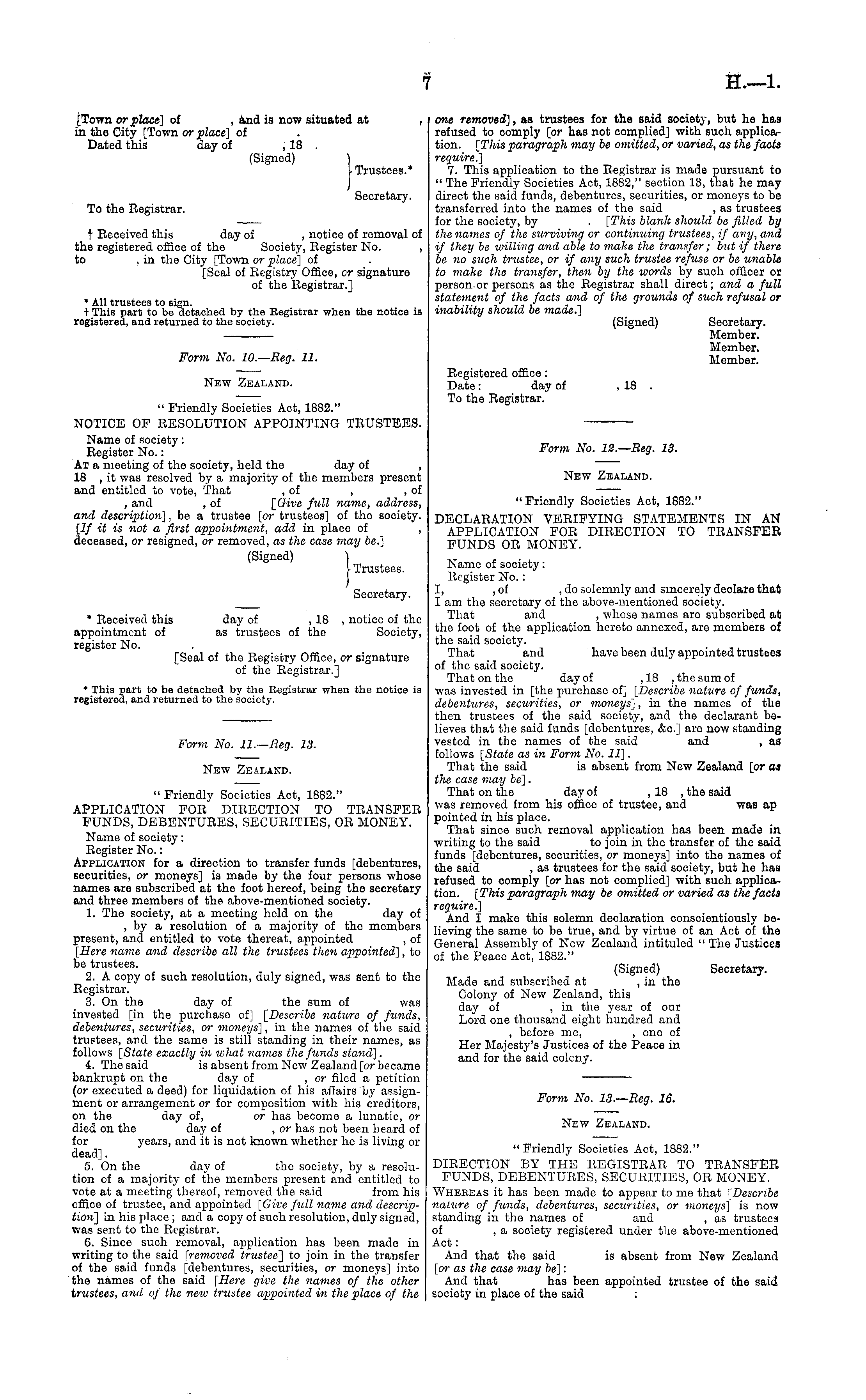 Form No. 11.—Beg. 13. New Zealand. " Friendly Societies Act, 1882." APPLICATION FOR DIRECTION TO TRANSFER FUNDS, DEBENTURES, SECURITIES, OR MONEY. Name of society: Register No.: Application for a direction to transfer funds [debentures, securities, or moneys] is made by the four persons whose names are subscribed at the foot hereof, being the secretary and three members of the above-mentioned society. 1. The society, at a meeting held on the day of , by a resolution of a majority of the members present, and entitled to vote thereat, appointed ,of [Here name and describe all the trustees then appointed] , to be trustees. 2. A copy of such resolution, duly signed, was sent to the Registrar. 3. On the day of the sum of was invested [in the purchase of] [Describe nature of funds, debentures, securities, or moneys] , in the names of the said trustees, and the same is still standing in their names, as follows [State exactly in what names the funds stand]. 4. The said is absent from New Zealand [or became bankrupt on the day of ,or filed a petition (or executed a deed) for liquidation of his affairs by assignment or arrangement or for composition with his creditors, on the day of, or has become a lunatic, or died on the day of ,or has not been heard of for years, and it is not known whether he is living or dead]. 5. On the day of the society, by a resolution of a majority of the members present and entitled to vote at a meeting thereof, removed the said from his office of trustee, and appointed [Give full name and description"] in his place ; and a copy of such resolution, duly signed, was sent to tho Registrar. 6. Since such removal, application has been made in writing to the said [removed trustee] to join in the transfer of the said funds [debentures, securities, or moneys] into the names of the said [Here give the names of the other trustees, and of the new trustee appointed in the place of the