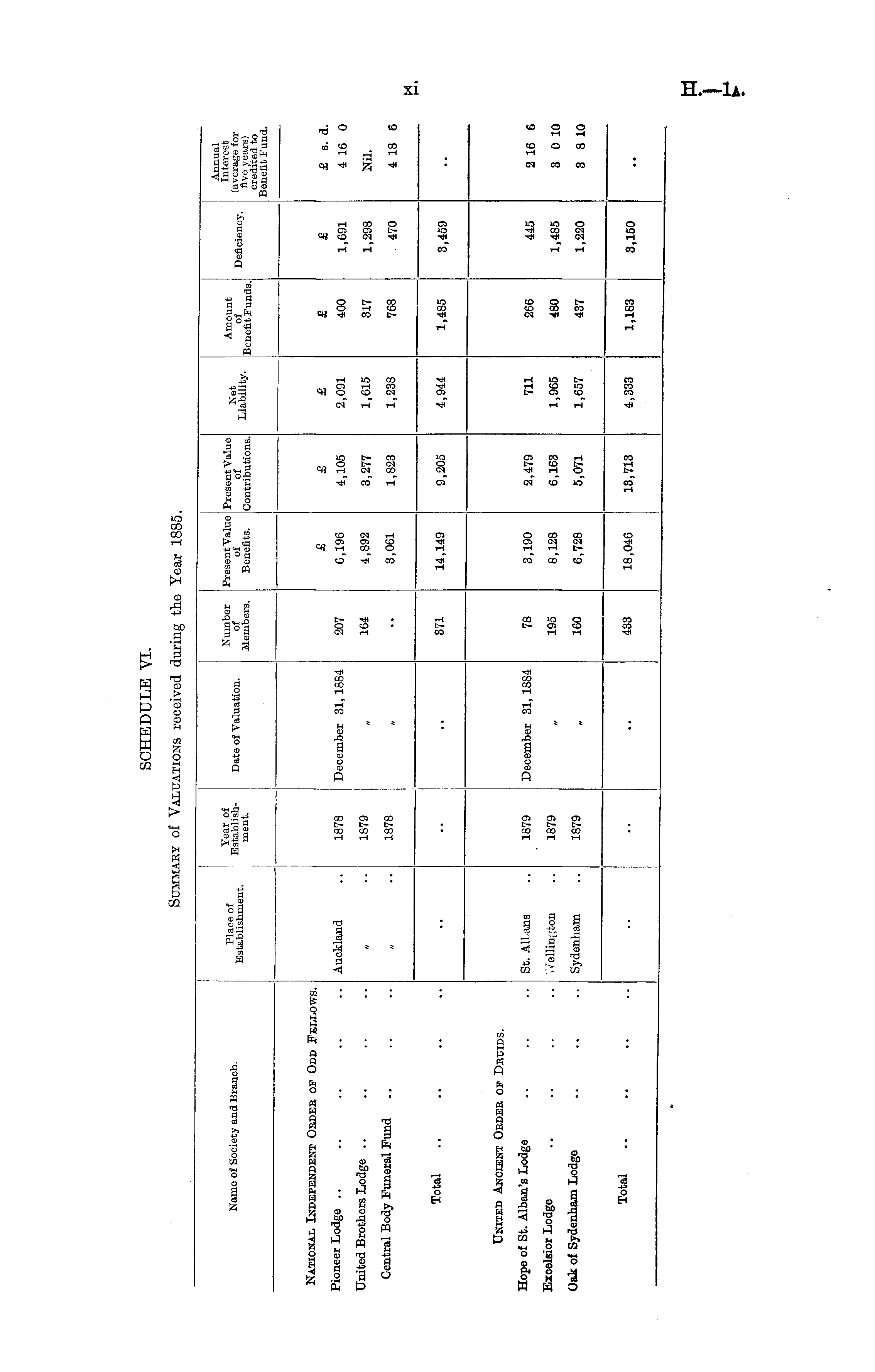 Name of Society and Branch. Place of Establishment. Year of Establishment. Date of Valuation. Number of Members. Present Value of Benefits. Present Value of Contributions. Net Liability. Amount of Benefit Funds. Deficiency. Annual Interest (average for five years) credited to Benefit Fund. National Independent Obdee op Odd Fellows. £ £ £ £ £ £ s. d. Pioneer Lodge Auckland 1878 December 31, 1884 207 6,196 4,105 2,091 400 1,691 4 16 C United Brothers Lodge 1879 164 4,892 3,277 1,615 317 1,298 Nil. Central Body Funeral Fund 1878 3,061 1,823 1,238 768 470 4 18 6 Total 371 14,149 9,205 4,944 1,485 3,459 United Ancient Oedeb op Deuids. Hope of St. Alban's Lodge St. Allans 1879 December 31,1884 78 3,190 2,479 711 266 445 2 16 ( Excelsior Lodge Wellington 1879 195 8,128 6,163 1,965 480 1,485 3 0 1( Oak of Sydenham Lodge Sydenham 1879 » 160 6,728 5,071 1,657 437 1,220 3 8 11 Total 433 18,046 13,713 4,333 1,183 3,150