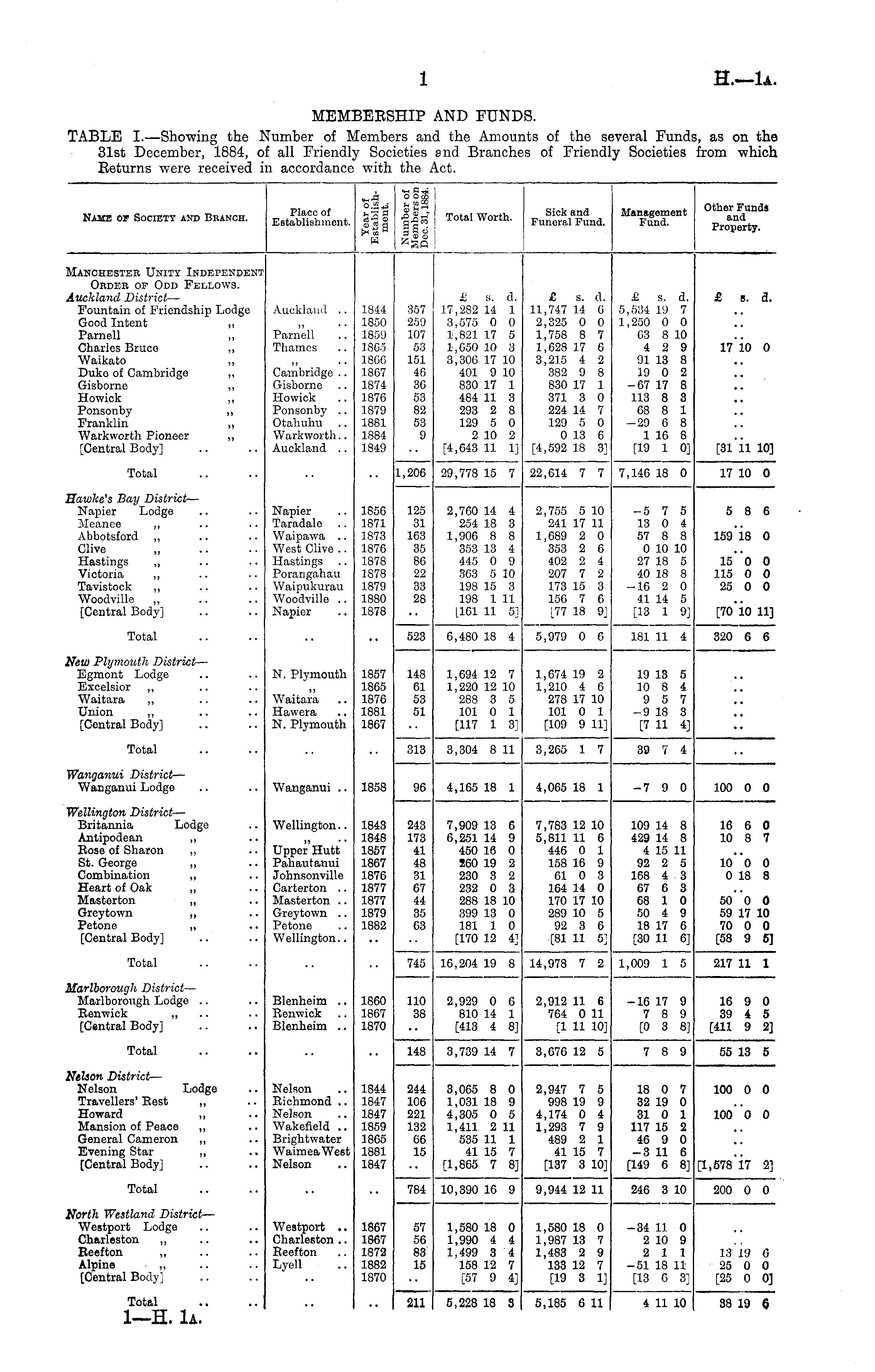MEMBERSHIP AND FUNDS. TABLE I.—Showing the Number of Members and the Amounts of the several Funds, as on the 31st December, 1884, of all Friendly Societies and Branches of Friendly Societies from which Returns were received in accordance with the Act.
