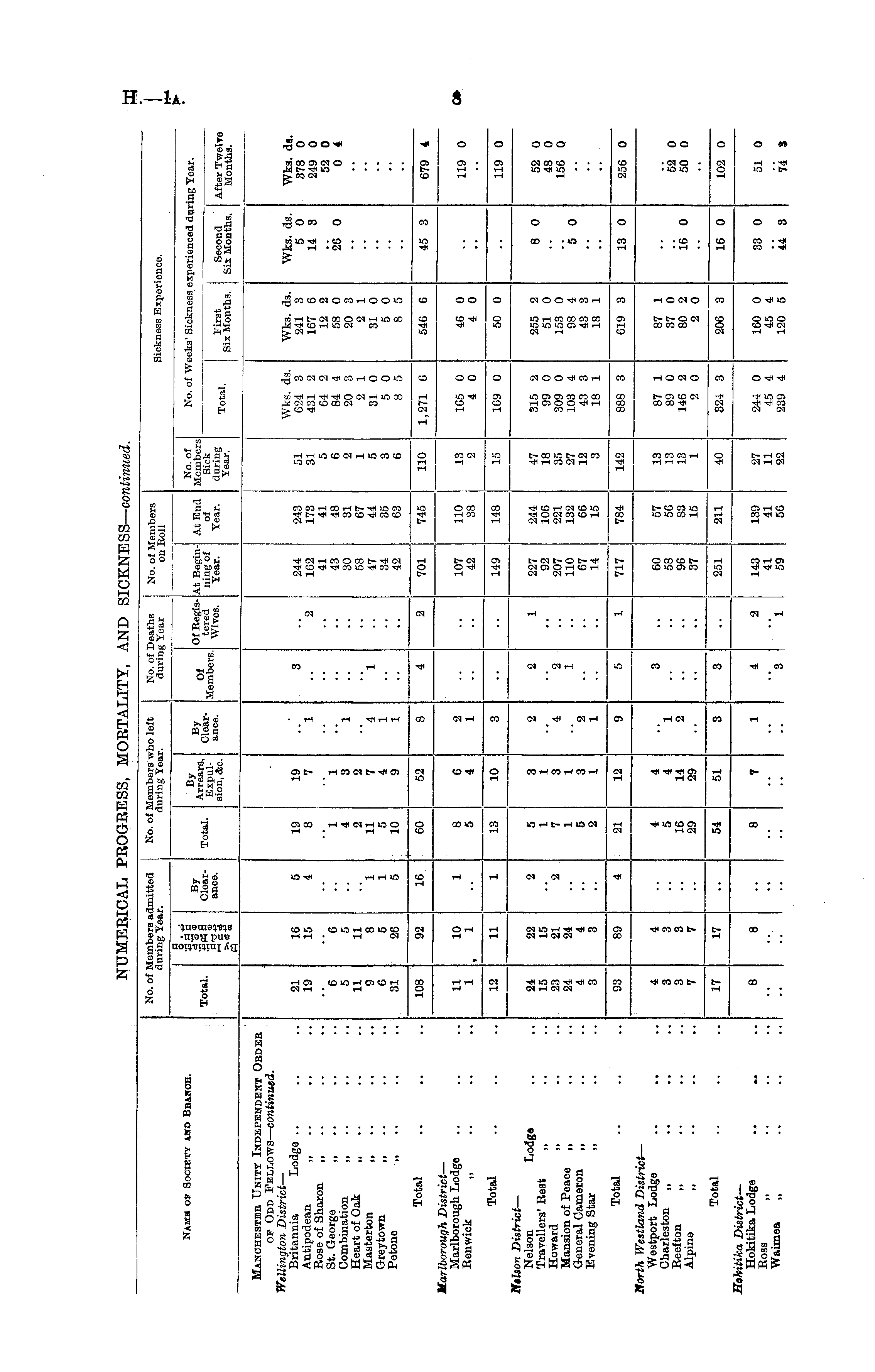 No. of Members admitted during Year. No. of Members who left during Year. No. of Deaths during Year No. of Members on Eoll Sickness Experience. Namb of Society akd Bbakoh. Total. la I By Clearance. Total. Arrears, Expulsion, &o. By Clearance. Of Members. Of Registered Wives. At Beginning of Year. At End of Year. No. of Members Sick during Year. No. of Wi sks' Sickness ixperienced dm •ing Year. Total. First Six Months. Second Six Months. After TwelT( Months. Manchester Unity Ikdepekdbnt Obder op Odd Fellows — continued. Wellington District — Britannia Lodga Antipodean ,, Bose of Sharon „ St. George „ Combination ,, Heart of Oak „ Masterton „ Greytown „ ., Petone „ 21 19 6 5 11 9 6 31 16 15 6 5 11 8 5 26 5 4 19 8 1 4 2 11 5 10 19 7 1 3 2 7 4 9 "l 3 "2 244 162 41 43 30 58 47 34 42 243 173 41 48 31 67 44 35 63 51 31 5 6 2 1 5 3 6 Wks. ds. 624 3 431 2 64 2 84 4 20 3 2 1 31 0 5 0 8 5 Wks. ds. 241 3 167 6 12 2 58 0 20 3 2 1 31 0 5 0 8 5 Wka. ds. 5 0 14 3 26 0 Wka. ds, 378 0 249 0 52 0 0 4 "l 1 1 5 4 1 1 1 Total 108 92 16 60 52 701 745 1,271 6 110 546 G 45 3 679 1 Harlborough District — Marlborough Lodge Benwiok „ I 11 1 10 1 1 8 5 6 4 2 1 107 42 110 38 13 2 165 0 4 0 46 0 4 0 119 0 • • .. Total 12 11 13 10 149 148 15 50 0 169 0 119 0 Nelson District — Nelson Lodg» Travellers' Rest ,, Howard ,, Mansion of Peace ,, General Cameron „ Evening Star I 24 15 23 24 4 3 22 15 21 24 4 3 2 2 5 1 7 1 5 2 3 1 3 1 3 1 2 4 2 "2 1 1 227 92 207 110 67 14 244 106 221 132 66 15 47 18 35 27 12 3 315 2 99 0 309 0 103 4 43 3 18 1 255 2 51 0 153 0 98 4 43 3 18 1 8 0 5 0 52 0 48 0 156 0 2 1 Total 93 89 21 12 717 784 142 888 3 619 3 13 0 256 0 North Westland District— Westport Lodge .. ., Charleston ,, .. ., Beefton ,, Alpine „ 4 3 3 7 4 3 3 7 4 5 16 29 4 4 14 29 1 2 3 60 58 96 37 57 56 83 15 13 13 13 1 87 1 89 0 146 2 2 0 87 1 37 0 80 2 2 0 52 0 50 0 16 0 Total 17 17 54 51 251 211 40 324 3 206 3 16 0 102 0 Eokitika District— Hokitika Lodge .. .. Boss „ Waimea „ 8 8 8 7 1 4 2 143 41 59 139 41 56 27 11 22 244 0 45 4 239 4 160 0 45 4 120 5 33 0 51 0 "3 "l 44 3 74 %