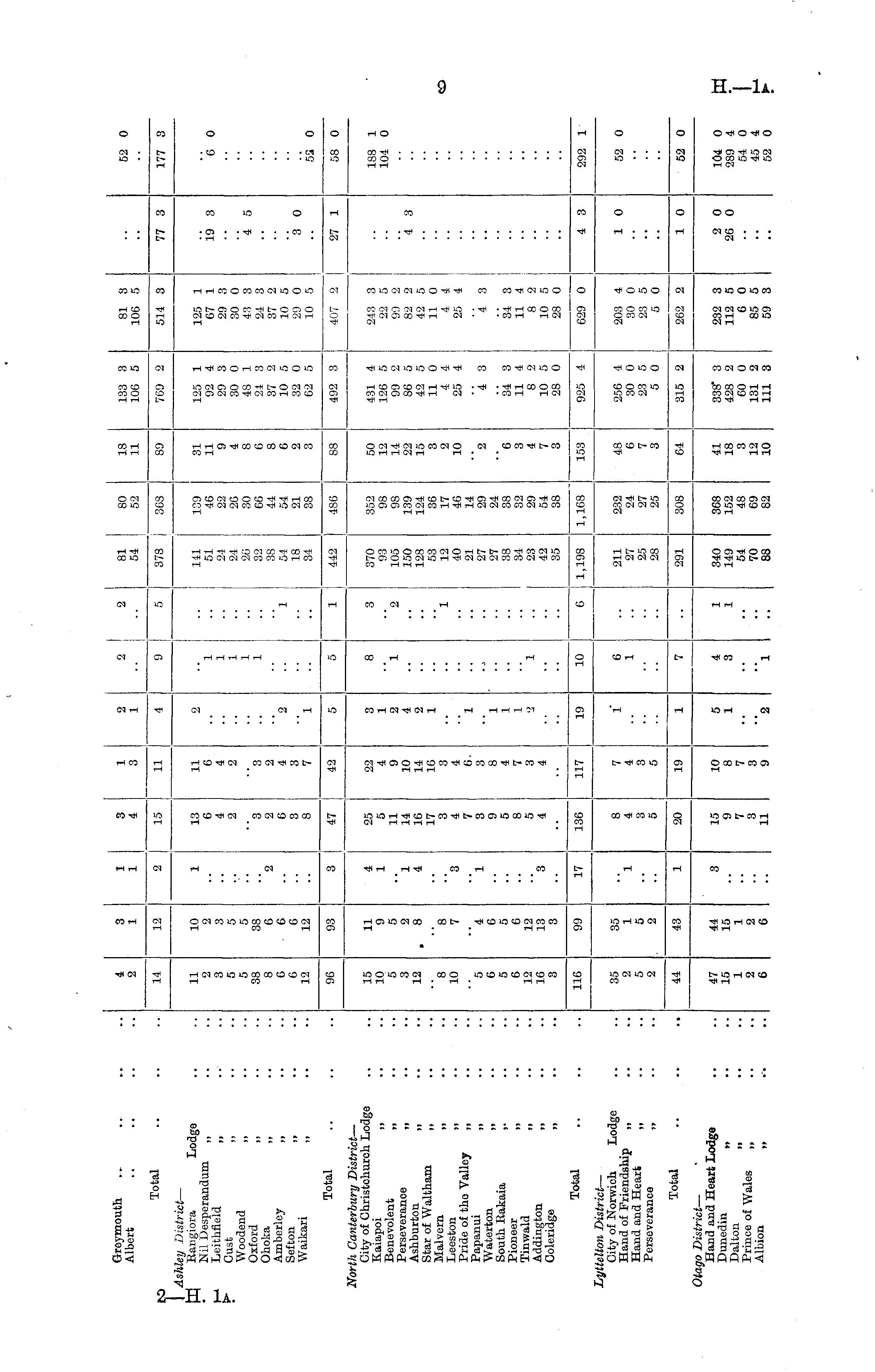 Greymouth Albert 1 2 3 1 1 1 3 4 1 3 9 1 2 2 SI 54 80 52 13 11 133 3 106 5 81 3 106 5 •• 52 0 " Total 14 V2 15 11 7G9 2 514 3 77 3 177 3 378 363 89 .shley District — Raisgiora Lodga Nil Uesperandum „ Loitlifield „ Gust ,, Woodend „ Oxford ,, Ohoka „ Amberley „ Sefton „ Waikari ,, 11 2 3 5 5 8 G 6 13 10 2 3 5 5 38 6 6 12 1 13 6 4 2 3 2 6 3 8 11 C 4 2 2 1 1 1 1 1 141 51 24 24 26 32 38 54 18 34 139 46 22 26 30 66 44 54 21 38 31 11 9 4 8 6 8 6 2 3 125 1 92 4 29 3 30 0 48 1 24 3 37 2 10 5 32 0 62 5 125 1 67 1 29 3 30 0 43 3 24 3 37 2 10 5 29 0 10 5 19 3 '4 5 G 0 "2 3 2 4 3 7 2 1 1 3 0 55 0 Total 90 93 47 ■12 i 407 2 I 27 1 58 0 442 486 83 492 3 forth Canterbury District — City of Christchurch Lodge Kaiapoi „ Benevolent „ Perseverance „ Ashburton „ Star of Waltham „ Malvern „ Leeston ,, Pride of tho Valley „ Papanui „ Waterton „ South Bakaia ,. Pioneer „ Tinwald „ Addington „ Coleridge „ 1 I I 15 5 3 12 11 9 5 2 . 8 4 1 "l 4 25 5 11 14 16 17 3 4 7 3 9 5 8 5 4 22 4 9 10 14 16 3 4 t 4 7 3 4 3 1 2 4 2 1 8 "l 3 2; 370 93 105 150 128 53 12 40 21 27 27 38 I 34 23 42 35 352 98 98 139 124 36 17 46 14 29 24 38 32 29 54 38 50 12 14 22 15 3 2 10 431 4 126 5 99 2 86 5 42 5 11 0 4 4 25 4 243 3 22 5 99 2 82 2 42 5 11 0 4 4 25 4 I •• 4 3 188 1 104 0 •• 8 10 8 7 "3 1 ; 5 6 5 6 12 16 3 1 "l 4 6 5 6 12 13 3 1 1 - ; # 2 4 3 4 3 •■ •■ G 3 4 7 3 34 3 11 4 8 2 10 5 28 0 34 3 11 4 8 2 10 5 28 0 1 ■• ,. 3 ■• "' .. Total ~l 1 I 19 10 G I I 153 925 4 11G 09 17 136 117 | I 1,198 1,163 629 0 4 3 292 1 lyttclton District — City of Norwich Lodge Hand of Friendship ,, Hand and Heart „ Perseverance ,, I I i I 1 1 1 1 1 1 r ■ i i 35 5 2 35 1 5 2 1 4 3 5 7 4 3 5 1 - 6 1 i 211 27 25 28 232 24 27 25 48 6 7 3 256 4 30 0 23 5 5 0 203 4 30 0 23 5 5 0 1 0 52 0 .. Total ! ! ; 1 64 1 262 2 1 0 52 0 44 43 20 19 1 7 •• 291 I 308 315 2 Hago District — Hand and Heart Lodge Dunedin „ Dalton ,, Prince of Wales „ Albion „ I I 1 I ! 47 15 1 2 6 44 15 1 2 6 3 15 9 7 3 11 10 8 7 3 9 5 1 4 3 1 1 340 149 54 70 88 368 152 48 69 82 41 18 3 12 10 338" 3 428 2 60 0 131 2 111 3 232 3 112 5 6 0 85 5 59 3 2 0 26 0 104 0 289 4 54 0 45 4 52 0 "2 1 - ..