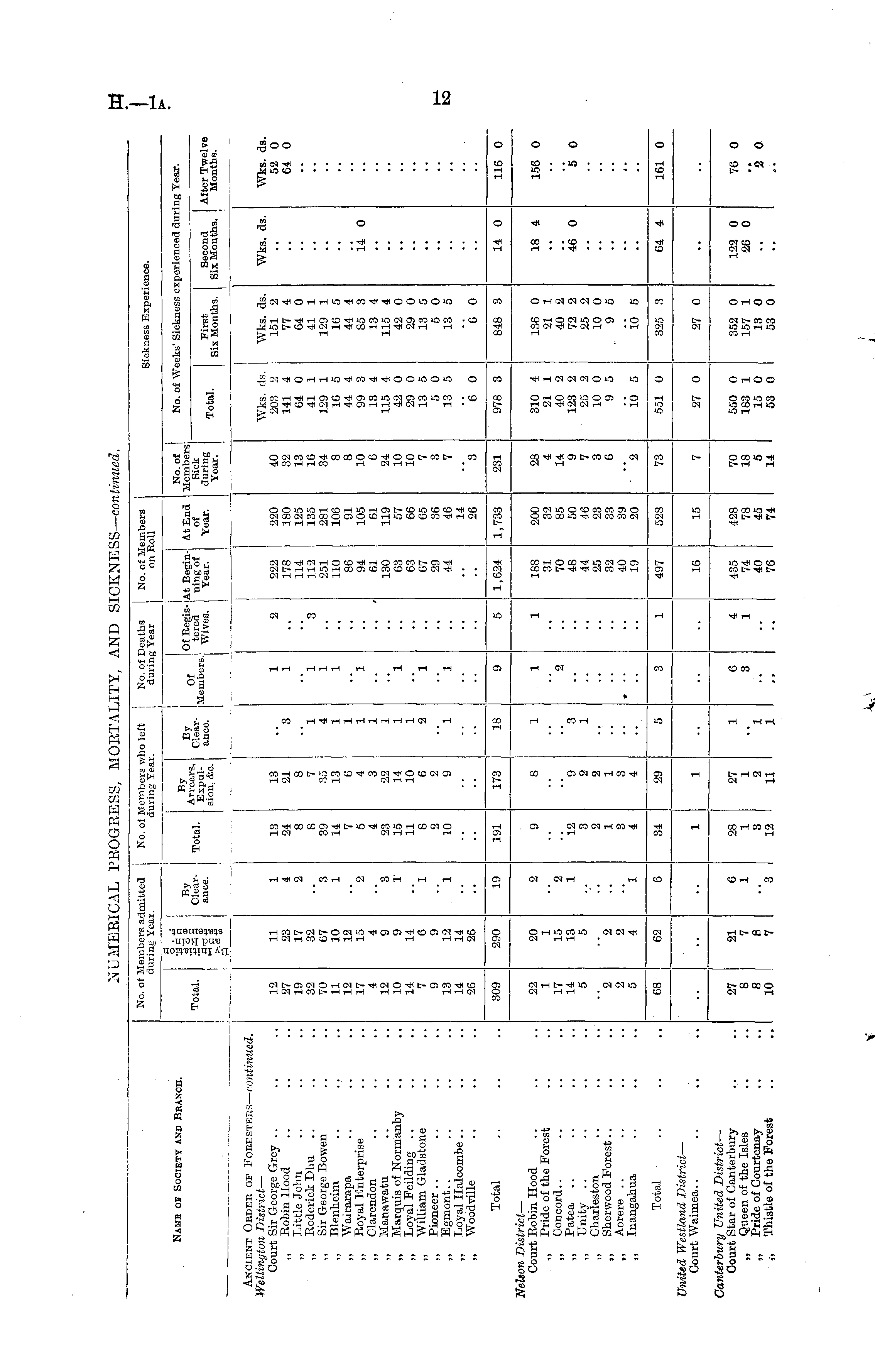 No. of Members admitted | during Year. No. of !V di ember? who left [ring Year. No. of Deaths during Year No. of Members on Roll Sickness Experience. Name of Society and Beanch. Total. •g d a By Clear- Total, ance. | Arrears, Expulsion; &c. ci£ r: Y^*** Of Eegis- :At Begin- At End tered ning of of Wives. Year. Year. No. of Members Sick I during Year. j Total. No. of Weeks' Sickness experienced during Year. First Second After Twelve Six Months. Six Months. Months. Ancient Ordek of Forestehs — continued. Wellington District — Court Sir George Grey .. ,, Eobin Hood ,, Little John ,, Roderick Dhu „ Sir George Bowen ,, Blenheim ,, Wairarapa ,, Eoyal Enterprise „ Clarendon ,, Manawatu ,, Marquis of Normanby „ Loyal Feilding .. ,, William Gladstone ,, Pioneer .. ,, Egmont.. „ Loyal Halcombe .. ,, Woodville 27 19 32 70 11 12 4 12 10 7 9 13 26 11 23 17 82 (57 10 12 15 4 9 9 1-1 6 9 IS 11 £0 1 4 2 "3 1 "2 13 24 8 8 39 14 7 5 4 23 15 11 8 2 10 13 21 8 7 35 13 6 4 3 22 14 10 6 2 9 "3 1 4 1 1 1 1 1 1 1 2 1 1 1 1 1 1 2 "3 222 178 114 112 251 110 86 94 61 130 63 63 67 29 44 220 180 125 135 281 106 91 105 61 119 57 66 65 36 46 14 26 40 32 13 16 34 8 8 10 6 24 10 10 7 3 7 Wks. ds. 203 2 141 4 64 0 41 1 129 1 16 5 44 4 99 3 13 4 115 4 42 0 29 0 13 5 5 0 13 5 Wks. ds. 151 2 77 £ 64 0 41 1 129 1 16 5 44 4 85 3 13 4 115 4 42 0 29 0 13 5 5 0 13 5 Wks. as. 14 0 Wks. ds. 52 0 64 0 3 1 ■j "l 1 "l 1 1 1 "3 6 0 6 0 Total 978 3 309 290 ID 191 173 18 1,624 1,733 231 848 3 14 0 116 0 Nelson District — Court Robin Hood „ Pride of the Forest ,, Concord.. „ Patea .. „ Unity .. ,, Charleston „ Sherwood Forest.. ,, Aorere .. ,, Inangalrua I I 22 1 17 14 5 20 1 15 13 5 2 "2 1 9 12 3 2 1 3 4 8 "9 2 1 3 4 1 "3 1 1 "2 1 188 31 70 48 44 25 32 40 19 200 32 85 50 46 23 33 39 20 28 4 14 9 7 3 0 310 4 21 1 40 2 123 2 25 2 10 0 9 5 13G 0 21 1 40 2 72 2 25 2 10 0 9 5 18 4 " 156 0 46 0 5 0 "2 5 2 2 4 1 "2 l6 5 j 10 5 .. Total 5 73 1 551 0 G8 I 02 34 29 3 497 528 325 3 64 4 161 0 United Wesfland District — Court Waimea.. ! I 16 15 7 27 0 27 0 •• •• •• Canterbury United District — Court Star of Canterbury „ Queen of the Isles ,, Pride of Courtenay „ Thistle of the Forest t I 27 8 8 10 21 7 8 7 G 1 28 1 3 12 27 1 2 11 1 "l 1 6 3 4 1 435 74 40 76 428 78 45 74 70 18 5 14 550 0 183 1 15 0 53 0 352 0 157 1 13 0 53 0 122 0 26 0 76 0 2 0 "3 I