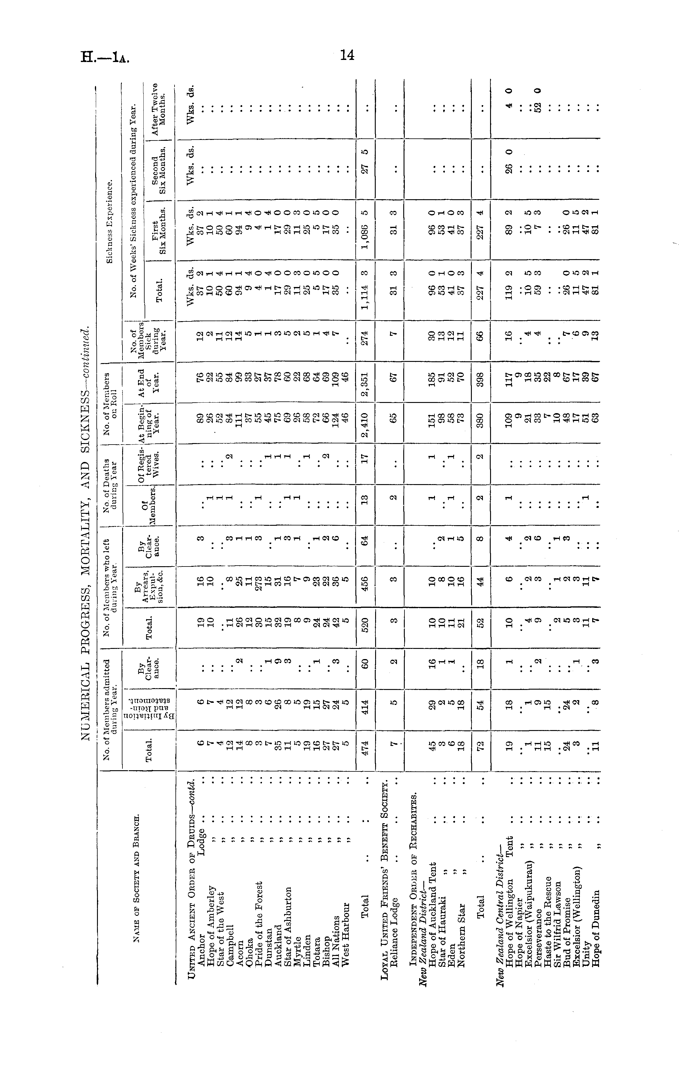 No. of Members admitted during Year. No. of Members who left during Year. No. of Deaths during Year No. of Members on Roll Sickness Experience. Name of Society and Branch. Total. 3 I O r 4J By Clearance. Total. Arrears. Expulsion, &c. By Clearance. Of Members. Of Registered Wives. ning of Year. of Year. Kick \~~ during Year. No. of TrnnVinvfi! Total. No. of Wl icks' Sickness experienced during Year. First Six Months. Second Six Months. After Twelve Months. United Ancient Obder op Druids — contd. Anchor Lodge Hope of Ainberley ,, Star of the West „ Campbell ,, Acorn ,, Pride of the Forest ,, Dunstan ,, Auckland „ Star of Ashburton „ Myrtle „ Linden „ Totara „ Bishop „ All Nations ,, West Harbour » • • 6 7 4 12 14 8 3 7 35 11 5 19 1C 27 27 5 6 7 4 12 12 8 3 G ■26 8 5 19 15 27 5 "2 1 9 3 19 10 11 26 12 30 15 32 19 8 9 24 24 42 5 16 10 8 25 11 273 15 31 16 7 9 23 22 36 5 3 3 1 1 3 1 3 1 1 1 1 1 - "2 1 1 1 89 26 52 84 111 37 55 45 75 69 26 58 72 66 124 46 76 22 55 84 99 33 27 37 78 60 22 68 64 69 109 46 12 2 11 12 14 5 1 1 3 5 2 5 1 4 7 Wks. ds. 37 2 10 1 50 4 60 1 94 1 9 4 i 0 1 4 17 0 29 0 11 3 25 0 5 5 17 0 35 0 Wks. ds. 37 2 10 1 50 4 60 1 94 1 9 4 4 0 1 4 17 0 29 0 11 3 25 0 5 5 17 0 35 0 Wks. ds. Wks. ds. "l 1 1 1 1 2 6 "2 "3 Total .. : i 17 I 2,410 I I 2,351 274 1,114 3 474 414 60 520 456 04 13 1,086 5 27 5 Loyal United Friends' Benefit Society. Reliance Lodge i i i 7 5 2 3 3 2 65 07 31 3 31 3 Independent Obdkb of Keohabites. New Zealand District — Hope of Auckland Tent Star of Hauraki ,, Eden „ Northern Star „ I 1 i ! 45 3 6 18 29 2 5 18 16 1 1 10 10 11 21 10 8 10 16 2 1 5 1 1 1 "l 151 98 58 73 185 91 52 70 30 13 12 11 96 0 53 1 41 0 37 3 96 0 53 1 41 0 37 3 Total 72 54 18 2 2 1 380 398 66 52 44 227 4 227 4 New Zealand Central District — Hope of Wellington Tent Hope of Napier „ Excelsior (Waipukurau) „ Perseverance „ Haste to the Rescue ,, Sir Wilfrid Lawson „ Bud of Promise „ Excelsior (Wellington) „ Unity Hope of Dunedin ,, 1 i I 19 18 1 10 6 4 1 109 9 21 33 7 10 48 17 51 63 117 9 18 35 22 8 67 17 39 67 16 119 2 89 2 20 0 4 0 1 11 15 1 9 15 "2 "i 9 "2 3 "2 6 4 4 10 5 59 3 10 5 7 3 52 0 *24 3 *24 2 2 5 3 11 7 1 2 3 11 7 "l 3 7 6 9 13 26 0 11 5 47 2 81 1 26 0 11 5 47 2 81 1 1 "l 11 "8 "3 ..