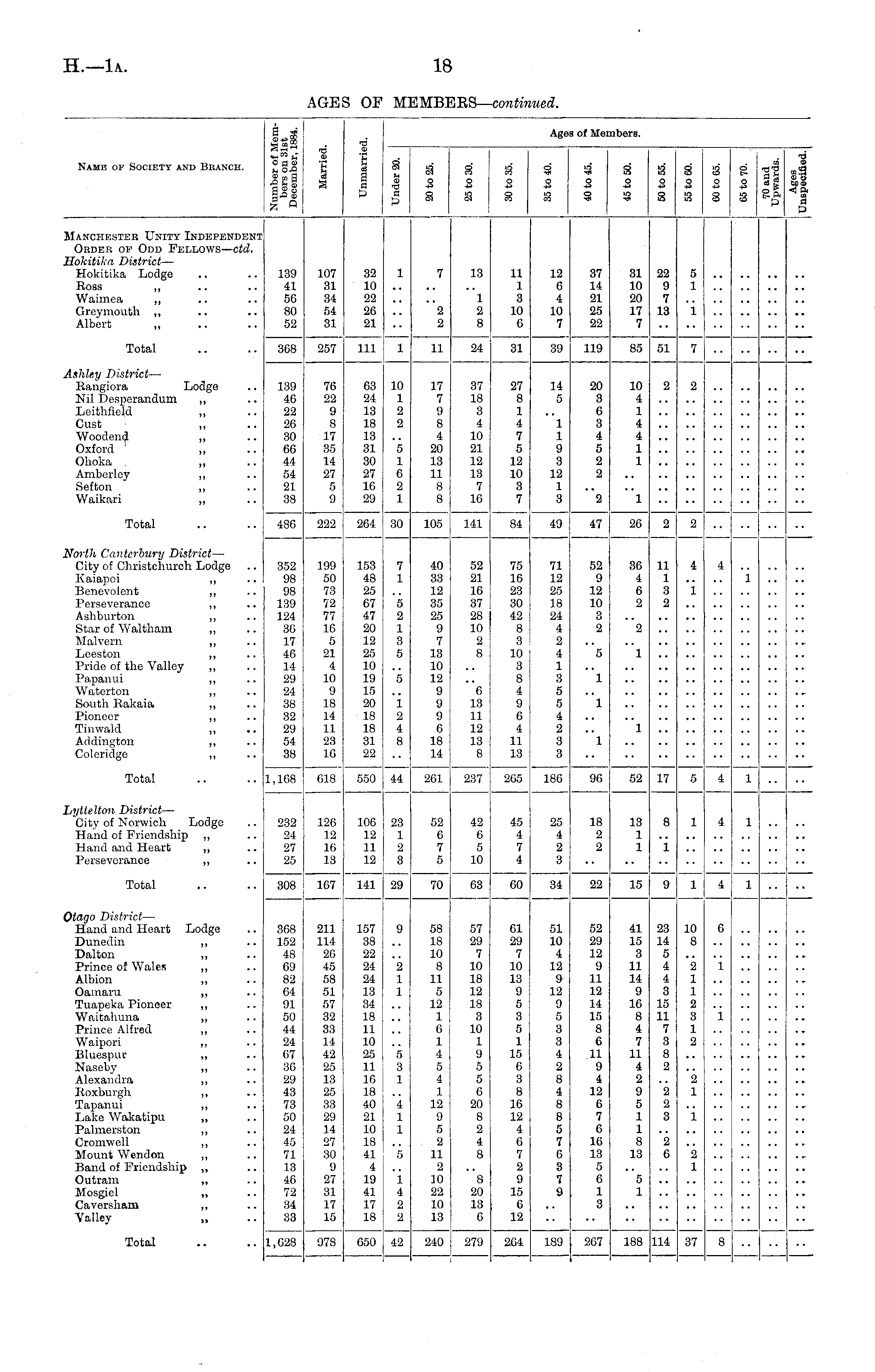 Namji oi' Society and Branch. rj • Odd) 111 I 9 'a i I o I s o i i si p o CO o as Ages of Members. o s o a s 3 S $ $ S 18 S CO <S> s 11 si "pa 0 Manchester Unity Independent Order of Odd Fellows — ctd. lokitika District — Hokitika Lodge Boss ,, Waimea „ Grey mouth „ Albert „ 139 41 5G 80 52 107 31 34 54 31 32 10 22 26 21 1 7 13 1 2 8 11 1 3 10 6 12 6 4 10 7 37 11 21 25 22 31 10 20 17 7 22 9 7 13 5 1 "2 2 1 Total 368 257 111 1 11 24 31 39 119 85 51 7 Uhley District — Kangiora Lodge Nil Desperandurn ,, Lcithfield „ Cust Woodend „ Oxford ' „ .. Ohoka „ Amborley ,, Sefton Waikari ,, i 139 4G 22 2G 30 6G 44 54 21 38 76 22 9 8 17 35 14 27 5 9 63 24 13 18 18 81 30 27 16 29 10 1 2 2 17 7 9 8 4 20 13 11 8 8 37 18 3 4 10 21 12 13 7 10 27 8 1 4 7 5 12 10 3 7 14 5 20 3 6 3 4 5 2 2 10 4 1 4 4 1 1 2 2 5 1 G 2 1 1 1 9 3 12 1 3 "2 "l Total 222 264 30 105 141 84 49 47 20 2 " i 48G I | I ; forth Canterbury District — City of Christchurch Lodge Kaiapoi „ Benevolent „ Perseverance ,, Ashburton ,, Star of Waltham „ Malvern ,, Leeston ,, Pride of the Valley „ Papanui „ Waterton ,, South Rakaia ,, Pioneer ,, Tinwald Addington ,, Coleridge ,, 352 98 98 139 124 3G 17 4G 14 29 24 38 32 29 54 38 199 50 73 72 77 10 5 21 4 10 9 18 14 11 23 10 153 48 25 67 47 j 20 12 25 10 19 15 20 18 18 31 22 7 1 I 5 i 2 1 3 5 40 33 12 35 25 9 7 13 10 12 9 9 9 6 18 14 52 21 1G 37 28 10 2 8 75 16 23 30 42 8 3 10 3 8 4 9 0 4 11 13 71 12 25 18 24 4 2 4 1 3 5 5 4 2 3 3 52 9 12 10 3 2 "5 3G 4 6 2 2 1 11 1 3 2 4 i 4 i '5 1 1 2 4 8 G 13 11 12 13 8 "l 1 1 Total 1,168 018 550 14 2G1 237 205 186 96 52 17 5 4 i 'jijttelton District — City of Norwich Lodge Hand of Friendship „ Hand and Heart ,, Perseverance „ ; 232 24 27 25 126 12 16 I 13 106 12 11 12 52 6 7 5 42 I 6 I 5 i 10 45 7 4 25 2 3 18 2 2 13 1 1 8 1 4 i 23 1 2 3 1 Total 308 167 141 29 70 68 60 34 22 15 9 1 4 i ")tacjo District — Hand and Heart Lodge Dunedin ,, Dalton „ Prince of Wales „ Albion „ Oamaru ,, Tuapeka Pioneer „ Waitalmna ,, Prince Alfred ,, Waipori „ Bluespur ,, Naseby „ Alexandra „ Koxburgh „ Tapanui „ Ijake Wakatipu „ Pahnerston „ Cromwell ,, Mount Wcndon ,, Band of Friendship „ Outram „ Mosgiel ,, Caversham ,, Valley 3G8 152 48 G9 82 G4 91 50 44 24 G7 30 29 43 73 50 24 45 71 13 46 72 84 33 211 114 20 45 58 51 57 32 33 14 42 25 13 25 33 29 14 27 80 9 27 81 17 15 157 38 22 24 24 13 34 | 18 11 10 25 11 16 18 40 21 10 18 41 4 19 41 17 18 9 2 1 1 5 3 1 58 18 10 8 11 5 12 1 6 I 1 4 5 4 \ I 11 2 10 22 10 13 57 29 7 10 18 12 18 3 10 1 9 5 | 5 6 4 8 01 29 7 10 13 9 5 3 5 1 15 6 3 8 16 12 4 0 7 2 9 15 6 12 51 10 4 12 9 12 9 5 3 3 4 2 8 4 8 8 5 7 G 3 7 9 52 29 12 9 11 12 14 15 8 G 11 9 4 12 6 7 0 10 13 5 0 1 3 41 15 3 11 14 9 1G 8 4 7 11 4 2 9 5 1 1 8 13 23 14 5 4 4 3 15 11 7 3 8 2 10 8 2 i! 11 2 3 1 2 *2 1 G ■ • ! ■ • I 1 .. I .. ■• .. 4 1 1 2 2 3 1 5 2 6 a i I i .. I I .. 1 4 2 2 8 20 13 C 5 1 Total 1,028 978 G50 ■\-2 240 279 2G4 189 207 188 114 37 8