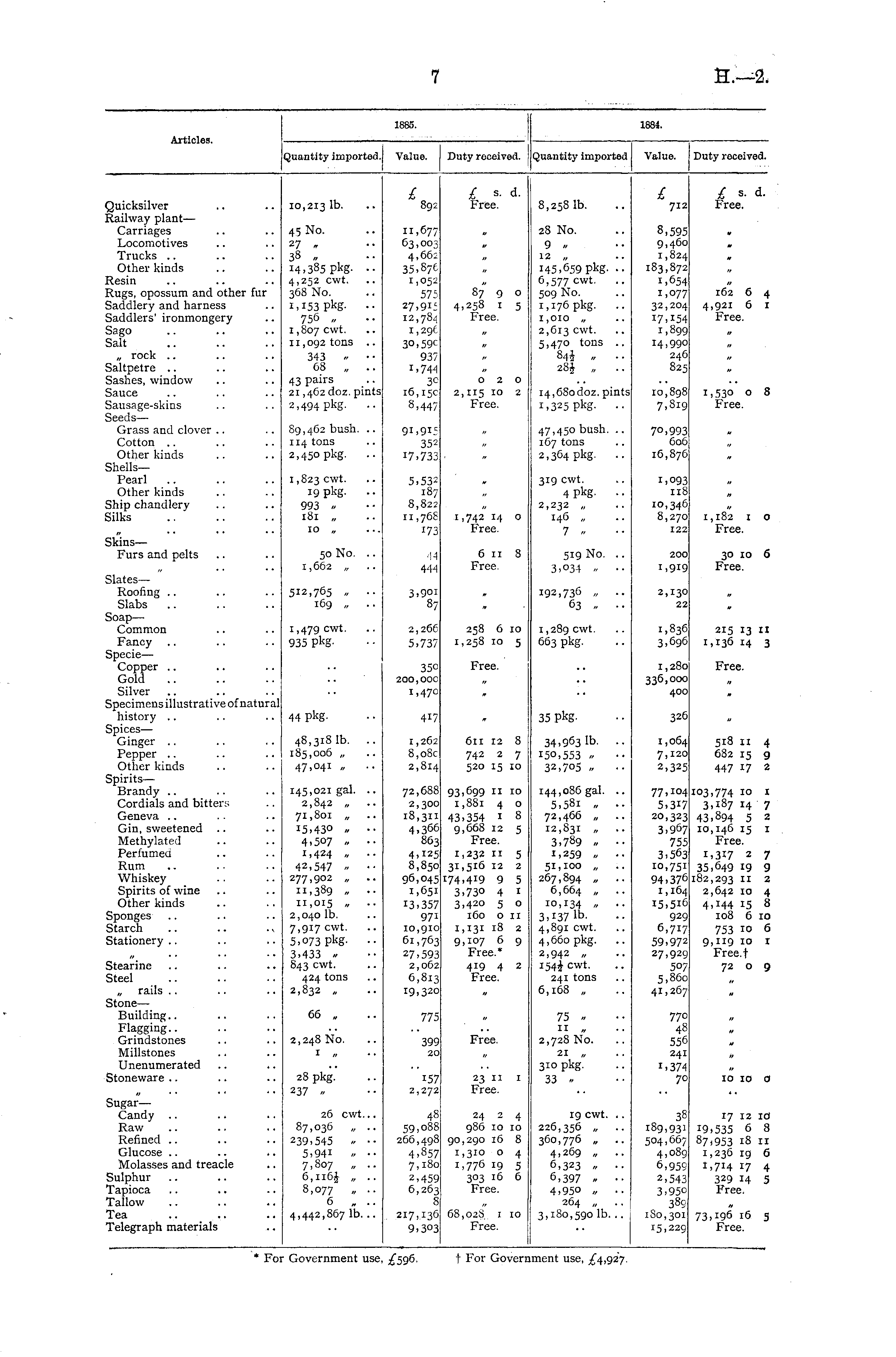 1885. 1884. Articles. Quantity imported. Value. Duty received. Quantity imported Value. Duty received. '* £ b. d. Free. £ I s. d. Free. Quicksilver Railway plant— Carriages Locomotives Trucks Other kinds Resin Rugs, opossum and other fur Saddlery and harness Saddlers' ironmongery Sago Salt 10,213 lb. 8,2581b. 712 45 No. 27- . 38 . 14,385 pkg. •• 4,252 cwt. 368 No. 1,153 pkg. 756 „ 1,807 cwt. 11,092 tons .. 343 » • • 68 , .. 43 pairs 21,462 doz. pints 2,494 pkg. 11,677 63,00" 4,662 35,876 1,052 57; 27,91: 12,784 1,29c 3O,59c 937 1,744 3 C 16,15c 8,447 87 9 o 4,258 1 5 Free. 28 No. 9 „ 12 „ 145,659 pkg. •• 6,577 cwt509 No. 1,176 pkg. 1,010 „ 2,613 cwt. 5,470 tons .. 8 4 i . •• 28J „ .. 8,595 9,460 1,824 183,872 1,654 1,077 32,204 17,154 1,899 14,990 246 825 162 6 4 4,921 6 1 Free. „ rock Saltpetre Sashes, window Sauce Sausage-skins SeedsGrass and clover Cotton Other kinds ShellsPearl .. Other kinds Ship chandlery Silks 89,462 bush. .. 114 tons 2,45° Pkg. 91,91; 352 r7,733 020 2,115 IO 2 Free. I4,68odoz. pints 1,325 pkg. 47,450 bush. .. 167 tons 2,364 pkg. .. 10,898 7,819 7O,993 606 16,876 1,530 o 8 Free. 1,823 cwt. 19 pkg. .. 993 . 181 „ 10 „ 5,532 187 8,822 11,76? *73 1,742 14 o Free. 319 cwt. 4 Pkg- • • 2,232 „ 146 „ 7 • i,093 118 10,346 8,270 122 1,182 1 o Free. SkinsFurs and pelts 50 No. .. 1,662 „ .. 6 11 8 Free. 519 No. .. 3.03 \ „ .. 200 30 10 6 Free. 44 444 1,919 SlatesRoofing Slabs .. Soap— Common Fancy Specie — Copper Gold Silver Specimens illustrative of natural history Spices— Ginger Pepper Other kinds Spirits— Brandy Cordials and bitters Geneva Gin, sweetened Methylated Perfumed Rum Whiskey Spirits of wine Other kinds Sponges Starch Stationery 512,765 „ .. 169 „ 1,479 cwt. 935 pkg44 pkg. 48,3181b. .. 185,006 „ 47,041 . 3,901 87 2,266 5,737 350 200,ooc 1,47c 417 1,262 8,08c 2,814 258 6 10 1,258 10 5 Free. 611 12 8 742 2 7 520 15 10 192,736 „ .. 63 „ •■ 1,289 cwt. 663 pkg. 35 pkg34,9631b. .. 150,553 » 32,705 ,. 2,130 22 1,836 3,696 1,280 336,000 400 326 1,064 7,120 2,325 215 13 " 1,136 14 3 Free. 518 11 4 682 15 g 447 !7 2 145,021 gal. .. 2,842 „ .. 71,801 „ 15,430 , .. 4,507 . •• 1,424 » •• 42,547 » •• 277,902 „ .. 11,389 , .. 11,015 „ 2,040 lb. 7,917 cwt. 5,O73 Pkg- •• 3,433 » 843 cwt. 424 tons 2,832 „ 72,688 2,300 18,311 4,366 863 4,125 8,850 96,045 1,651 13,357 971 10,910 61,763 27,593 2,062 6,813 19,320 93,699 11 10 1,881 4 o 43,354 1 8 9,668 12 5 Free. 1,232 11 5 31,516 12 2 174,419 9 5 3,73O 4 1 3,420 5 o 160 on 1,131 18 2 9,107 6 9 Free.' 419 4 2 Free. 144,086 gal. .. 5,581 „ .. 72,466 „ 12,831 „ 3,789 . •• 1,259 „ 51,100 „ 267,894 „ .. 6,664 » •■ 10,134 „ .. 3,1371b. 4,891 cwt. 4,660 pkg. 2,942 „ 1544 cwt. 241 tons 6,168 „ 77,i°4 5,3i7 20,323 3,967 755 3,563 io,75i 94,376 1,164 15,516 929 6,717 59,97 2 27,929 507 5,86o 41,267 103,774 10 1 3,187 14 7 43,894 5 2 10,146 15 1 Free. i,3I7 2 7 35,649 19 9 182,293 'I 2 2,642 10 4 4,144 15 8 108 6 10 753 10 6 9,119 10 1 Free.f 72 o 9 Stearine Steel „ rails StoneBuilding. . Flagging.. Grindstones Millstones Unenumerated 66 „ 2,248 No. 1 „ • • 775 Free. 75 » ii» 2,728 No. 21 „ 310 pkg. 33 » 770 48 556 241 i,374 70 399 20 Stoneware 28 pkg. 237 , 157 2,272 23 11 1 Free. 10 10 o SugarCandy Raw Refined Glucose Molasses and treacle Sulphur Tapioca Tallow Tea Telegraph materials 26 cwt... 87,036 „ .. 239,545 . •• 5,94i . ■• 7,807 , .. 6,n6£ „ .. 8,077 » ■• 6 „ .. 4,442,867 lb. .. 48 59,088 266,498 4.857 7,180 2,459 6,263 8 217,136! 9,303 24 2 4 986 10 10 90,290 16 8 1,310 o 4 1,776 19 5 303 16 6 Free. 19 cwt. .. 226,356 „ 360,776 , .. 4,269 , .. 6,323 „ .. 6,397 » ■■ 4,950 „ .. 264 „ 3,180,590lb... 3? 189,931 504,667 4,089 6,959 2,543 3,950 38c 180,301 15,229 17 12 id 19,535 6 8 87,953 18 11 1,236 19 6 1,714 17 4 329 14 5 Free. 68,028 1 10 Free. 73,196 16 5 Free. * For Government use. £596. t For Government use, £4,927.