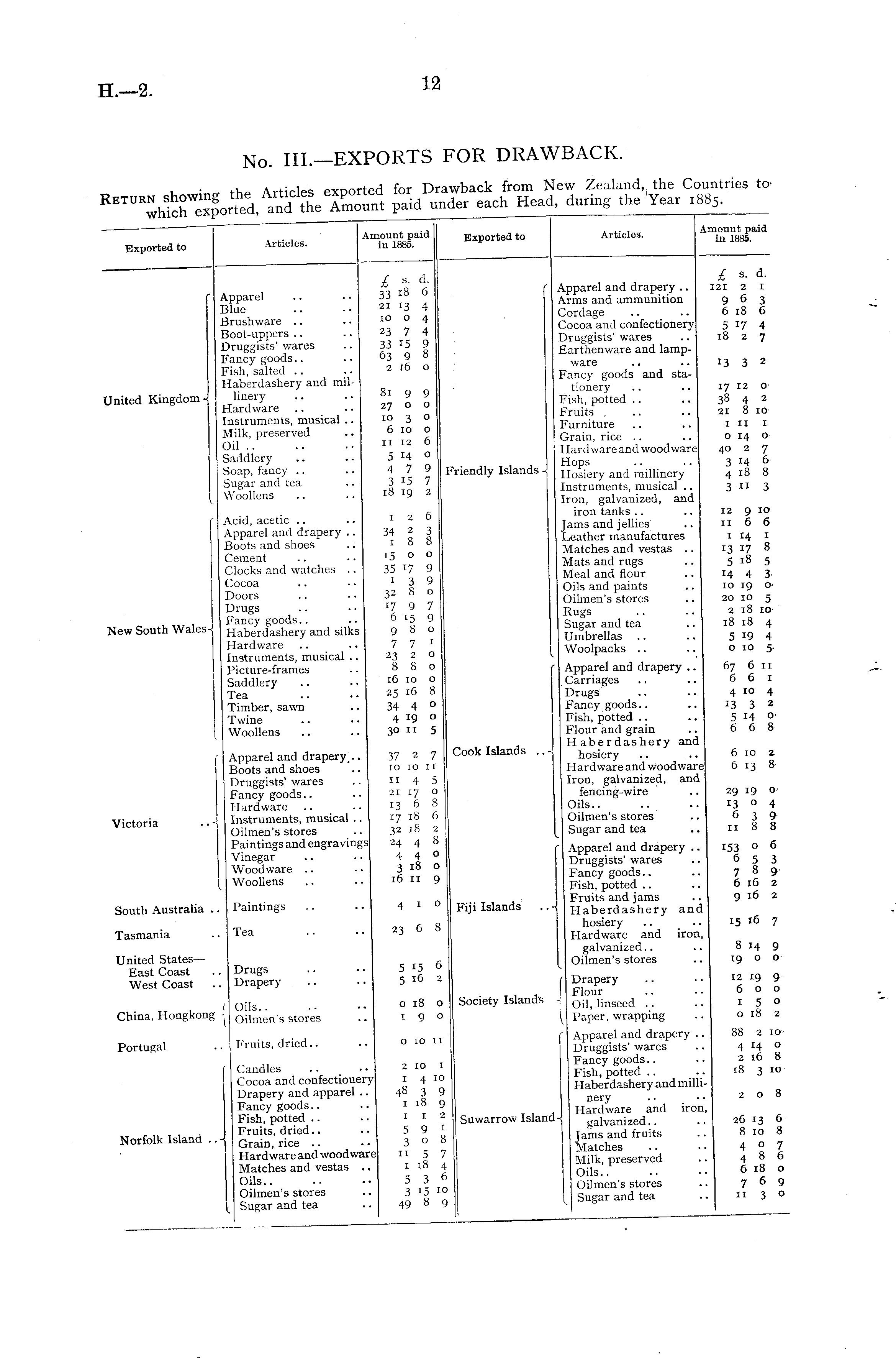 No. III.—EXPORTS FOR DRAWBACK. Return showing the Articles exported for Drawback from New Zealand, the Countries to which exported, and the Amount paid under each Head, during the year 1885.