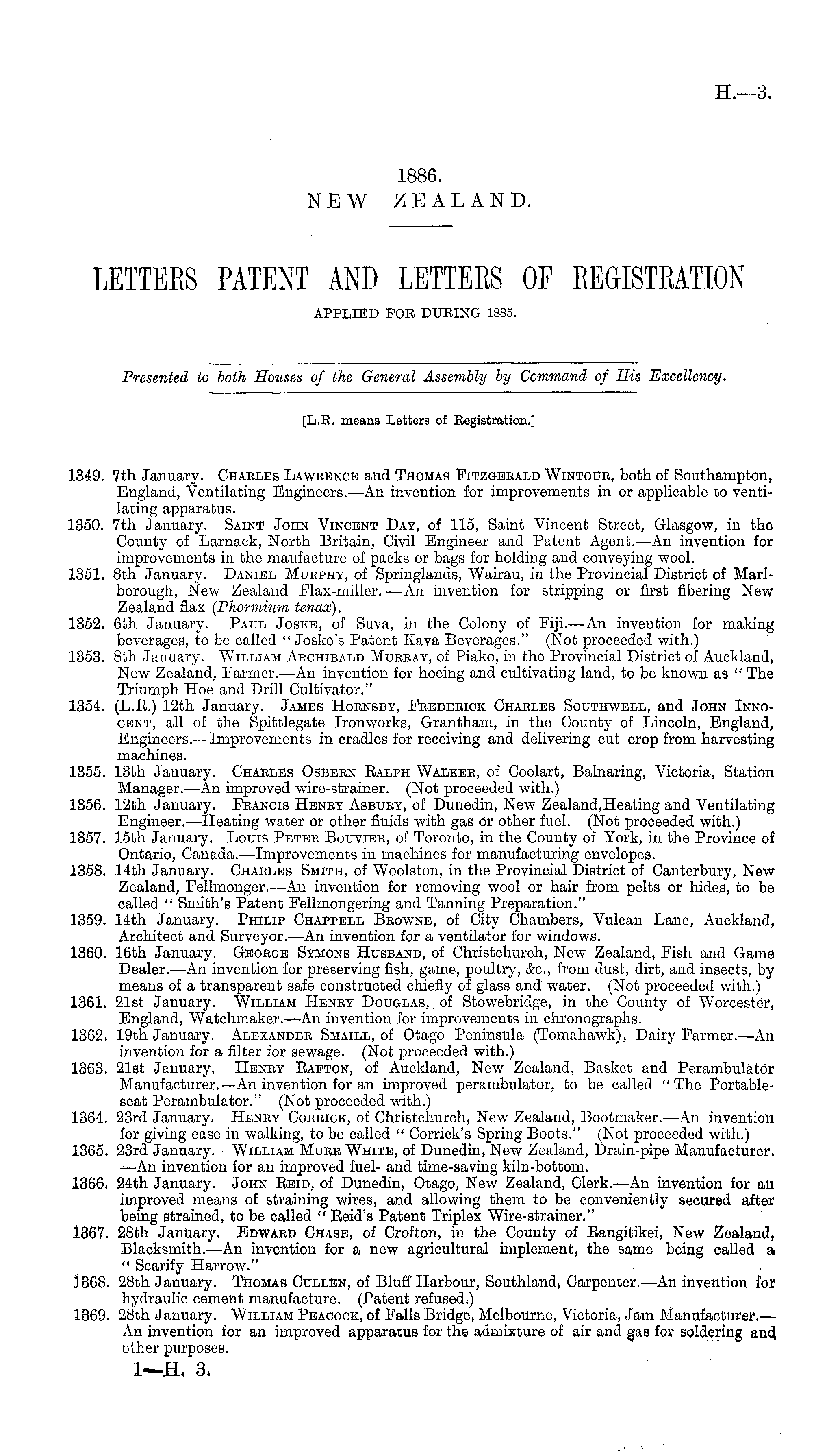 [L.E. means Letters of Registration.] 1349. 7th January. Charles Lawrence and Thomas Fitzgerald Wintoue, both of Southampton, England, Ventilating Engineers.—An invention for improvements in or applicable to ventilating apparatus. 1350. 7th January. Saint John Vincent Day, of 115, Saint Vincent Street, Glasgow, in the County of Larnack, North Britain, Civil Engineer and Patent Agent.—An invention for improvements in the maufacture of packs or bags for holding and conveying wool. 1351. Bth January. Daniel Murphy, of Springlands, Wairau, in the Provincial District of Marlborough, New Zealand Flax-miller.—An invention for stripping or first fibering New Zealand flax (Phormium tenax). 1352. 6th January. Paul Joske, of Suva, in the Colony of Fiji.—An invention for making beverages, to be called " Joske's Patent Kava Beverages." (Not proceeded with.) 1353. Bth January. William Aechibald Mueeay, of Piako, in the Provincial District of Auckland, New Zealand, Farmer.—An invention for hoeing and cultivating land, to be known as " The Triumph Hoe and Drill Cultivator." 1354. (L.E.) 12th January. James Hornsby, Frederick Charles Southwell, and John Innocent, all of the Spittlegate Ironworks, Grantham, in the County of Lincoln, England, Engineers.—lmprovements in cradles for receiving and delivering cut crop from harvesting machines. 1355. 13th January. Charles Osbern Ealph Walkee, of Coolart, Balnaring, Victoria, Station Manager.—An improved wire-strainer. (Not proceeded with.) 1356. 12th January. Francis Heney Asbuey, of Dunedin, New Zealand, Heating and Ventilating Engineer.—Heating water or other fluids with gas or other fuel. (Not proceeded with.) 1357. 15th January. Louis Peter Bouvier, of Toronto, in the County of York, in the Province of Ontario, Canada.—lmprovements in machines for manufacturing envelopes. 1358. 14th January. Charles Smith, of Woolston, in the Provincial District of Canterbury, New Zealand, Fellmonger.—An invention for removing wool or hair from pelts or hides, to be called " Smith's Patent Fellmongering and Tanning Preparation." 1359. 14th January. Philip Chappell Browne, of City Chambers, Vulcan Lane, Auckland, Architect and Surveyor.—An invention for a ventilator for windows. 1360. 16th January. George Symons Husband, of Christchurch, New Zealand, Fish and Game Dealer.—An invention for preserving fish, game, poultry, &c, from dust, dirt, and insects, by means of a transparent safe constructed chiefly of glass and water. (Not proceeded with.) 1361. 21st January. William Henry Douglas, of Stowebridge, in the County of Worcester, England, Watchmaker. —An invention for improvements in chronographs. 1362. 19th January. Alexander Smaill, of Otago Peninsula (Tomahawk), Dairy Farmer.—An invention for a filter for sewage. (Not proceeded with.) 1363. 21st January. Henry Bafton, of Auckland, New Zealand, Basket and Perambulator Manufacturer. —An invention for an improved perambulator, to be called " The Portableseat Perambulator." (Not proceeded with.) 1364. 23rd January. Henry Corrick, of Christchurch, New Zealand, Bootmaker.—An invention for giving ease in walking, to be called " Corrick's Spring Boots." (Not proceeded with.) 1365. 23rd January. William Murr White, of Dunedin, New Zealand, Drain-pipe Manufacturer. —An invention for an improved fuel- and time-saving kiln-bottom. 1366. 24th January. John Eeid, of Dunedin, Otago, New Zealand, Clerk.—An invention for an improved means of straining wires, and allowing them to be conveniently secured after being strained, to be called " Eeid's Patent Triplex Wire-strainer." 1367. 28th January. Edward Chase, of Crofton, in the County of Eangitikei, New Zealand, Blacksmith.—An invention for a new agricultural implement, the same being called a " Scarify Harrow." 1368. 28th January. Thomas Cullen, of Bluff Harbour, Southland, Carpenter.—An invention for hydraulic cement manufacture. (Patent refused.) 1369. 28th January. William Peacock, of Falls Bridge, Melbourne, Victoria, Jam Manufacturer,— An invention for an improved apparatus for the admixture of air and gas fov soldering ancl other purposes. I—H. 3.