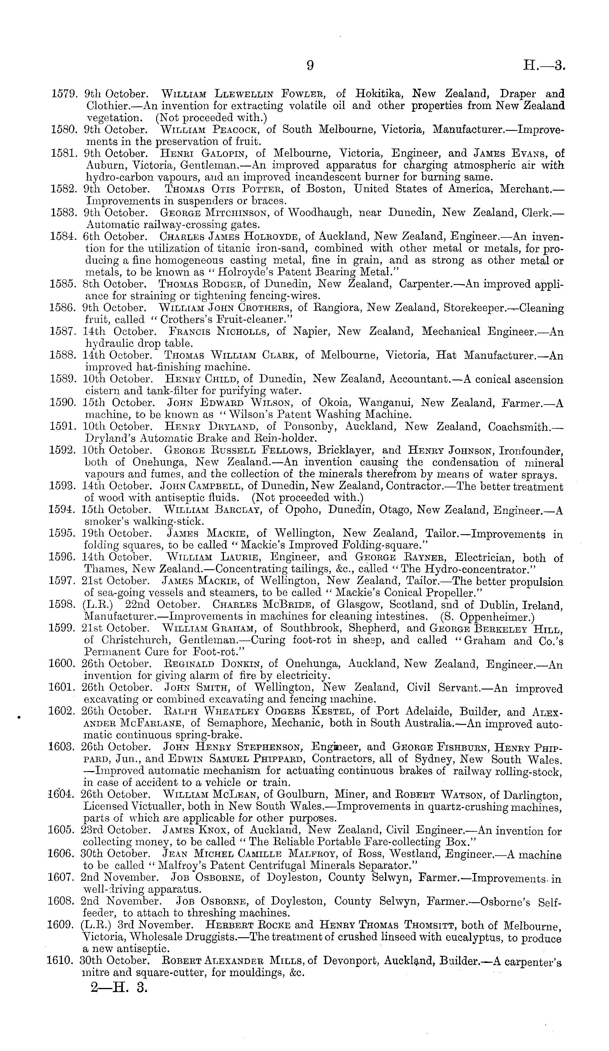 1579. 9th October. William Llewellin Fowlee, of Hokitika, New Zealand, Draper and Clothier.—An invention for extracting volatile oil and other properties from New Zealand vegetation. (Not proceeded with.) 1580. 9th October. William Peacock, of South Melbourne, Victoria, Manufacturer.—lmprovements in the preservation of fruit. 1581. 9th October. Henbi Galopin, of Melbourne, Victoria, Engineer, and James Evans, of Auburn, Victoria, Gentleman. —An improved apparatus for charging atmospheric air with hydro-carbon vapours, and an improved incandescent burner for burning same. 1582. 9th October. Thomas Otis Potter, of Boston, United States of America, Merchant.— Improvements in suspenders or braces. 1583. 9th October. Geobge Mitchinson, of Woodhaugh, near Dunedin, New Zealand, Clerk.— Automatic railway-crossing gates. 1584. 6th October. Charles James Holeoyde, of Auckland, New Zealand, Engineer.—An invention for the utilization of titanic iron-sand, combined with other metal or metals, for producing a fine homogeneous casting metal, fine in grain, and as strong as other metal or metals, to be known as " Holroyde's Patent Bearing Metal." 1585. Bth October. Thomas Eodgeb, of Dunedin, New Zealand, Carpenter.—An improved appliance for straining or tightening fencing-wires. 1586. 9th October. William John Cbothers, of Eangiora, New Zealand, Storekeeper.-^Cleaning fruit, called " Crothers's Fruit-cleaner." 1587. 14th October. Francis Nicholls, of Napier, New Zealand, Mechanical Engineer.—An hydraulic drop table. 1588. 14th October. Thomas William Clark, of Melbourne, Victoria, Hat Manufacturer.—An improved hat-finishing machine. 1589. 10th October. Henry Child, of Dunedin, New Zealand, Accountant.—A conical ascension cistern and tank-filter for purifying water. 1590. 15th October. John Edward Wilson, of Okoia, Wanganui, New Zealand, Farmer.—A machine, to be known as " Wilson's Patent Washing Machine. 1591. 10th October. Heney Deyland, of Ponsonby, Auckland, New Zealand, Coachsmith.— Drylands Automatic Brake and Bein-holder. 1592. 10th October. George Eussell Fellows, Bricklayer, and Heney Johnson, Ironfounder, both of Onehunga, New Zealand.—An invention causing the condensation of mineral vapours and fumes, and the collection of the minerals therefrom by means of water sprays. 1593. 14th October. John Campbell, of Dunedin, New Zealand, Contractor.—The better treatment of wood with antiseptic fluids. (Not proceeded with.) 1594. 15th October. William Barclay, of Opoho, Dunedin, Otago, New Zealand, Engineer.—A smoker's walking-stick. 1595. 19th October. James Mackie, of Wellington, New Zealand, Tailor.—lmprovements in folding squares, to be called " Mackie's Improved Folding-square." 1596. 14th October. William Laueie, Engineer, and George Eaynee, Electrician, both of Thames, New Zealand. —Concentrating tailings, &c, called "The Hydro-concentrator." 1597. 21st October. James Mackie, of Wellington, New Zealand, Tailor.—The better propulsion of sea-going vessels and steamers, to be called " Mackie's Conical Propeller." 1598. (L.E.) 22nd October. Charles Mcßeide, of Glasgow, Scotland, snd of Dublin, Ireland, Manufacturer.—lmprovements in machines for cleaning intestines. (S. Oppenheimer.) 1599. 21st October. William Graham, of Southbrook, Shepherd, and George Berkeley Hill, of Christchurch, Gentleman. —Curing foot-rot in shesp, and called "Graham and Co.'s Permanent Cure for Foot-rot." 1600. 26th October. Eeginald Donkin, of Onehunga, Auckland, New Zealand, Engineer.—An invention for giving alarm of fire by electricity. 1601. 26th October. John Smith, of Wellington, New Zealand, Civil Servant.—An improved excavating or combined excavating and fencing machine. 1602. 26th October. Ealph Wheatley Odgees Kestel, of Port Adelaide, Builder, and Alexandee McFaelane, of Semaphore, Mechanic, both in South Australia.—An improved automatic continuous spring-brake. 1603. 26th October. John Heney Stephenson, Engineer, and Geobge Fishbuen, Heney Phippard, Jun., and Edwin Samuel Phippard, Contractors, all of Sydney, New South Wales. —Improved automatic mechanism for actuating continuous brakes of railway rolling-stock, in case of accident to a vehicle or train. 1604. 26th October. William McLean, of Goulburn, Miner, and Eobeet Watson, of Darlington, Licensed Victualler, both in New South Wales. —Improvements in quartz-crushing machines, parts of which are applicable for other purposes. 1605. 23rd October. James Knox, of Auckland, New Zealand, Civil Engineer.—An invention for collecting money, to be called " The Eeliable Portable Fare-collecting Box." 1606. 30th October. Jean Michel Camille Malfeoy, of Eoss, Westland, Engineer.—A machine to bo called " Malfroy's Patent Centrifugal Minerals Separator." 1607. 2nd November. Job Osboene, of Doyleston, County Selwyn, Farmer.—lmprovements- in well-driving apparatus. 1608. 2nd November. Job Osboene, of Doyleston, County Selwyn, Farmer.—Osborne's Selffeeder, to attach to threshing machines. 1609. (L.E.) 3rd November. Herbert Eocke and Heney Thomas Thomsitt, both of Melbourne, Victoria, Wholesale Druggists.—The treatment of crushed linseed with eucalyptus, to produce a new antiseptic. 1610. 30th October. Eobeet Alexandee Mills, of Devonport, Auckland, Builder.—A carpenter's mitre and square-cutter, for mouldings, &c. 2—H. 3.