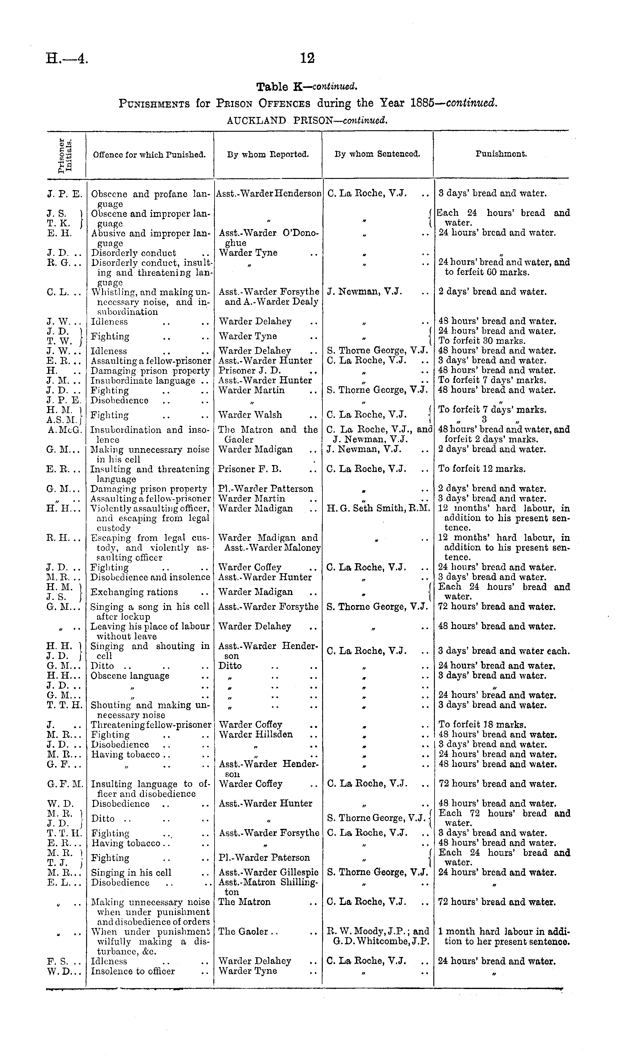 Offence for which Punished. By whom Reported. By whom Sentenced. Punishment. J. P. E. Obscene and profane lan-Asst.-Warder Henderson C. La Roche, V.J. .. 3 days' bread and water. r. s. i r. k. J E. H. r. d. .. B. G. .. guage Obscene and improper language Abusive and improper language Disorderly conduct Disorderly conduct, insulting and threatening language Whistling, and making unnecessary noise, and insubordination Idleness Asst.-Warder O'Donoghue Warder Tyne I Each 24 hours' bread and water. 24 hours' bread and water. 24 hours' bread and water, and to ferfeit 60 marks. 3. L. .. Asst.-Warder Forsythe and A.-Warder Dealy J. Newman, V.J. 2 days' bread and water. r. w... r.D. } r. W. j r. w... 3.R. .. Fighting Warder Delahey Warder Tyne "i I S. Thorne George, V.J. C. La Roche, V.J. .. 43 hours' bread and water. 24 hours' bread and water. To forfeit 30 marks. 48 hours' bread and water. 3 days' bread and water. 48 hours' bread and water. To forfeit 7 days' marks. 48 hours' bread and water. K. .. r. m. .. r. d. .. r, p. e. a. m. i i.S.M.j a.McG. Idleness Assaulting a fellow-prisoner Damaging prison property Insubordinate language .. Fighting Disobedience Warder Delahey Asst.-Warder Hunter Prisoner J. D. Asst.-Warder Hunter Warder Martin S. Thorne George, V.J. Fighting Insubordination and insolence Making unnecessary noise in his cell Insulting and threatening language Damaging prison property Assaulting a fellow -prisoner Violently assaulting officer, and escaping from legal custody Escaping from legal custody, and violently assaulting officer Fighting Disobedience and insolence Warder Walsh The Matron and the Gaoler Warder Madigan C. La Roche, V.J. j C. La Roche, V.J., and J. Newman, V.J. J. Newman, V.J. To forfeit 7 days' marks. 3 48 hours' bread and water, and forfeit 2 days' marks. 2 days' bread and water. }. M... 3. R. .. Prisoner F. B. C. La Roche, V.J. To forfeit 12 marks. J. M... Pl.-Warder Patterson Warder Martin Warder Madigan 2 days' bread and water. 3 days' bread and water. 12 months' hard labour, in addition to his present sentence. 12 months' hard labour, in addition to his present sentence. 24 hours' breaa ana water. 3 days' bread and water. Each 24 hours' bread anc water. 72 hours' bread and water. LH.'.'. H. G. Seth Smith, R.M. J. II. .. Warder Madigan and Asst.-Warder Moloney r. D. .. il.R. .. it. M. ) r.S. } J. M... Exchanging rations Warder Coffey Asst.-Warder Hunter Warder Madigan C. La Roche, V.J. 1 S. Thorne George, V.J. 3.H, ) r.D. j J. M... a.H... r. d. .. i. M... V. T. H. Singing a song in his cell after lockup Leaving his place of labour without leave Singing and shouting in cell Ditto .. Obscene language Asst.-Warder Forsythe Warder Delahey Asst.-Warder HenderC. La Roche, V.J. .. 48 hours' bread ana water. 3 aays' bread and water each. son Ditto 24 hours' breaa ana water. 3 days' bread and water. Shouting and making unnecessary noise Threatening fellow-prisoner Fighting Disobedienco Having tobacco 24 hours' bread and water. 3 days' bread and water. r. a. r. .. r.D. .. M. R... 4. F. .. Warder Coffey Warder Hillsden To forfeit 18 marks. 48 hours' bread and water. 3 days' bread and water. 24 hours' bread and water. 48 hours' bread and water. Asst.-Warder Henderson Warder Coffey G F. M. Insulting language to officer and disobedience Disobedience C. La Roche, V.J. .. 72 hours' bread and water. W. D. M. R. ) l.D. r.T. h. E. R. .. M. R. ) LJ. j M. R... E. L. .. Ditto .. Fighting Having tobacco Asst.-Warder Hunter Asst.-Warder Forsythe S. Thorne George, V.J. j C. La Roche, V.J. .. I S. Thorne George, V.J. 48 hours' breaa ana water. Each 72 hours' bread anc water. 3 days' bread and water. 48 hours' bread and water. Each 24 hours' bread and water. 24 hours' bread and water. Fighting Pl.-Warder Paterson Singing in his cell Disobedience Asst.-Warder Gillespie Asst.-Matron Shillington The Matron Making unnecessary noise when under punishment and disobedienco of orders When under punishment wilfully making a disturbance, &c. Idleness ... Insolence to officer The Gaoler C. La Roche, V.J. R.W. Moody, J.P.; ana G.D.Whitcombe.J.P. 72 hours' bread ana water. 1 month hard labour in addition to her present sentence. '. s... Warder Delahey Warder Tyne C. La Roche, V.J. 24 hours' bread and water.