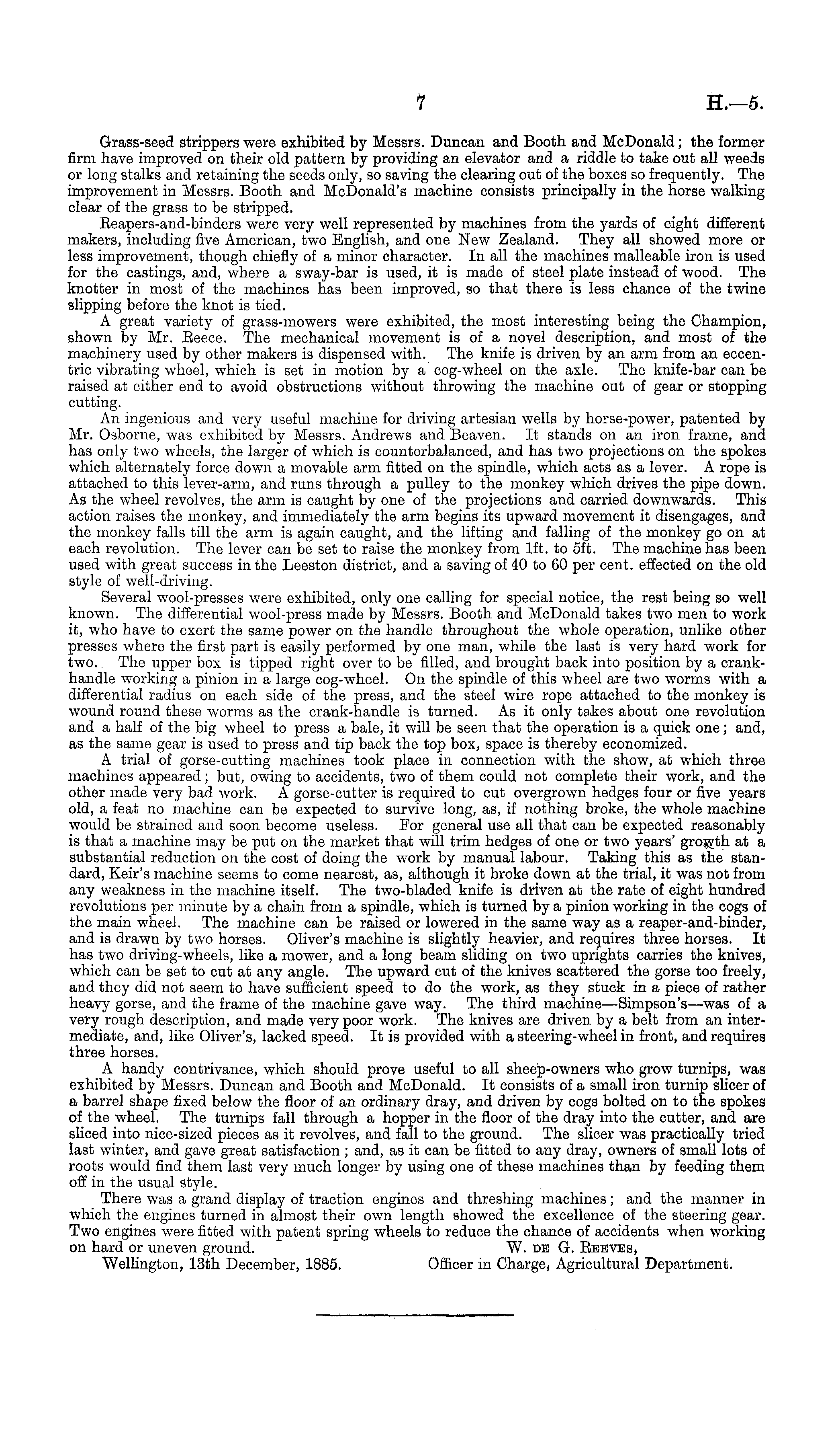 Grass-seed strippers were exhibited by Messrs. Duncan and Booth and McDonald; the former firm have improved on their old pattern by providing an elevator and a riddle to take out all weeds or long stalks and retaining the seeds only, so saving the clearing out of the boxes so frequently. The improvement in Messrs. Booth and McDonald's machine consists principally in the horse walking clear of the grass to be stripped. Reapers-and-binders were very well represented by machines from the yards of eight different makers, including five American, two English, and one New Zealand. They all showed more or less improvement, though chiefly of a minor character. In all the machines malleable iron is used for the castings, and, where a sway-bar is used, it is made of steel plate instead of wood. The knotter in most of the machines has been improved, so that there is less chance of the twine slipping before the knot is tied. A great variety of grass-mowers were exhibited, the most interesting being the Champion, shown by Mr. Recce. The mechanical movement is of a novel description, and most of the machinery used by other makers is dispensed with. The knife is driven by an arm from an eccentric vibrating wheel, which is set in motion by a cog-wheel on the axle. The knife-bar can be raised at either end to avoid obstructions without throwing the machine out of gear or stopping cutting. An ingenious and very useful machine for driving artesian wells by horse-power, patented by Mr. Osborne, was exhibited by Messrs. Andrews and Beaven. It stands on an iron frame, and has only two wheels, the larger of which is counterbalanced, and has two projections on the spokes which alternately force down a movable arm fitted on the spindle, which acts as a lever. A rope is attached to this lever-arm, and runs through a pulley to the monkey which drives the pipe down. As the wheel revolves, the arm is caught by one of the projections and carried downwards. This action raises the monkey, and immediately the arm begins its upward movement it disengages, and the monkey falls till the arm is again caught, and the lifting and falling of the monkey go on at each revolution. The lever can be set to raise the monkey from Ift. to sft. The machine has been used with great success in the Leeston district, and a saving of 40 to 60 per cent, effected on the old style of well-driving. Several wool-presses were exhibited, only one calling for special notice, the rest being so well known. The differential wool-press made by Messrs. Booth and McDonald takes two men to work it, who have to exert the same power on the handle throughout the whole operation, unlike other presses where the first part is easily performed by one man, while the last is very hard work for two.. The upper box is tipped right over to be filled, and brought back into position by a crankhandle working a pinion in a large cog-wheel. On the spindle of this wheel are two worms with a differential radius on each side of the press, and the steel wire rope attached to the monkey is wound round these worms as the crank-handle is turned. As it only takes about one revolution and a half of the big wheel to press a bale, it will be seen that the operation is a quick one; and, as the same gear is used to press and tip back the top box, space is thereby economized. A trial of gorse-cutting machines took place in connection with the show, at which three machines appeared; but, owing to accidents, two of them could not complete their work, and the other made very bad work. A gorse-cutter is required to cut overgrown hedges four or five years old, a feat no machine can be expected to survive long, as, if nothing broke, the whole machine would be strained and soon become useless. For general use all that can be expected reasonably is that a machine may be put on the market that will trim hedges of one or two years' growth at a substantial reduction on the cost of doing the work by manual labour. Taking this as the standard, Keir's machine seems to come nearest, as, although it broke down at the trial, it was not from any weakness in the machine itself. The two-bladed knife is driven at the rate of eight hundred revolutions per minute by a chain from a spindle, which is turned by a pinion working in the cogs of the main wheel. The machine can be raised or lowered in the same way as a reaper-and-binder, and is drawn by two horses. Oliver's machine is slightly heavier, and requires three horses. It has two driving-wheels, like a mower, and a long beam sliding on two uprights carries the knives, which can be set to cut at any angle. The upward cut of the knives scattered the gorse too freely, and they did not seem to have sufficient speed to do the work, as they stuck in a piece of rather heavy gorse, and the frame of the machine gave way. The third machine—Simpson's—was of a very rough description, and made very poor work. The knives are driven by a belt from an intermediate, and, like Oliver's, lacked speed. It is provided with a steering-wheel in front, and requires three horses. A handy contrivance, which should prove useful to all sheep-owners who grow turnips, was exhibited by Messrs. Duncan and Booth and McDonald. It consists of a small iron turnip slicer of a barrel shape fixed below the floor of an ordinary dray, and driven by cogs bolted on to the spokes of the wheel. The turnips fall through a hopper in the floor of the dray into the cutter, and are sliced into nice-sized pieces as it revolves, and fall to the ground. The slicer was practically tried last winter, and gave great satisfaction ; and, as it can be fitted to any dray, owners of small lots of roots would find them last very much longer by using one of these machines than by feeding them off in the usual style. There was a grand display of traction engines and threshing machines; and the manner in which the engines turned in almost their own length showed the excellence of the steering gear. Two engines were