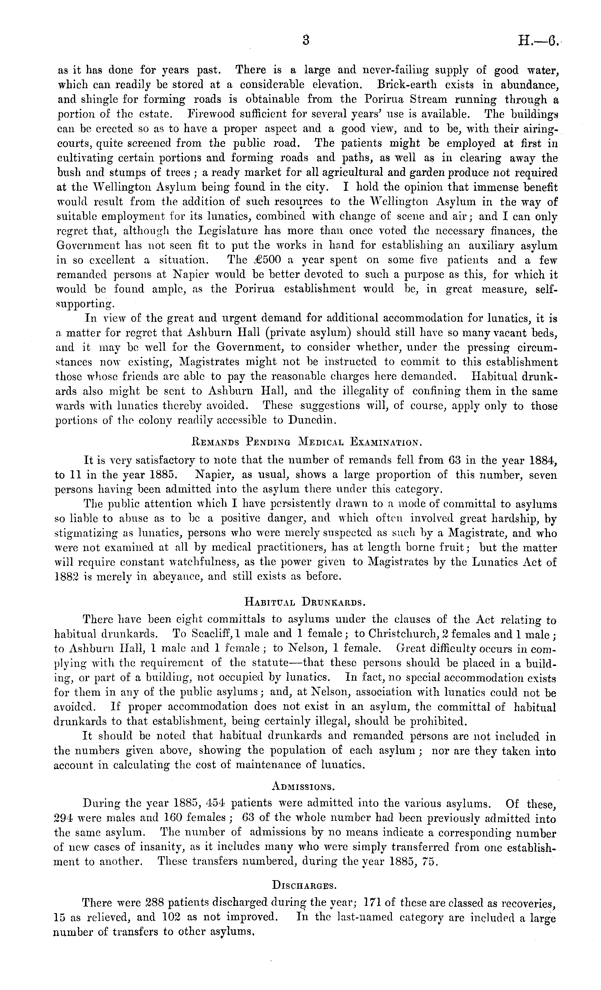 as it has done for years past. There is a large and never-failing supply of good water, which can readily be stored at a considerable elevation. Brick-earth exists in abundance, and shingle for forming roads is obtainable from the Porirua Stream running through a portion of the estate. Firewood sufficient for several years' use is available. The buildings can be erected so as to have a proper aspect and a good view, and to be, with their airingcourts, quite screened from the public road. The patients might be employed at first in cultivating certain portions and forming roads and paths, as well as in clearing away the bush and stumps of trees; a ready market for all agricultural and garden produce not required at the Wellington Asylum being found in the city. I hold the opinion that immense benefit would result from the addition of such resources to the Wellington Asylum in the way of suitable employment for its lunatics, combined with change of scene and air; and I can only regret that, although the Legislature has more than once voted the necessary finances, the Government has not seen fit to put the works in hand for establishing an auxiliary asylum in so excellent a situation. The .€SOO a year spent on some five patients and a few remanded persons at Napier would be better devoted to such a purpose as this, for which it would be found ample, as the Porirua establishment would be, in great measure, selfsupporting. In view of the great and urgent demand for additional accommodation for lunatics, it is a matter for regret that Ashburn Hall (private asylum) should still have so many vacant beds, and it may be well for the Government, to consider whether, under the pi'essing circumstances now existing, Magistrates might not be instructed to commit to this establishment those whose friends arc able to pay the reasonable charges here demanded. Habitual drunkards also might be sent to Ashburn Hall, and the illegality of confining them in the same wards with lunatics thereby avoided. These suggestions will, of course, apply only to those portions of the colony readily accessible to Duncdin. Hemands Pending Medical Examination. It is very satisfactory to note that the number of remands fell from G3 in the year 1884, to 11 in the year 1885. Napier, as usual, shows a large proportion of this number, seven persons having been admitted into the asylum there under this category. The public attention which I have persistently drawn to a mode of committal to asylums so liable to abuse as to be a positive danger, and which often involved great hardship, by stigmatizing as lunatics, persons who were merely suspected as such by a Magistrate, and who were not examined at all by medical practitioners, has at length borne fruit ; but the matter will require constant watchfulness, as the power given to Magistrates by the Lunatics Act of 1882 is merely in abeyance, and still exists as before. Habitual Drunkards. There have been eight committals to asylums under the clauses of the Act relating to habitual drunkards. To Seaeliff, 1 male and 1 female ;to Christchurch, 2 females and 1 male ; to Ashburn Hall, 1 male and 1 female ;to Nelson, 1 female. Great difficulty occurs in complying with the requirement of the statute —that these persons should be placed in a building, or part of a building, not occupied by lunatics. In fact, no special accommodation exists for them in any of the public asylums; and, at Nelson, association with lunatics could not be avoided. If proper accommodation does not exist in an asylum, the committal of habitual drunkards to that establishment, being certainly illegal, should be prohibited. It should be noted that habitual drunkards and remanded persons are not included in the numbers given above, showing the population of each asylum j nor are they taken into account in calculating the cost of maintenance of luuatics. Admissions. During the year 1885, 454 patients were admitted into the various asylums. Of these, 294 were males and 160 females ; 63 of the whole number had been previously admitted into the same asylum. The number of admissions by no means indicate a corresponding number of new cases of insanity, as it includes many who were simply transferred from one establishment to another. These transfers numbered, during the year 1885, 75. Discharges. There were 288 patients discharged during the year; 171 of these are classed as recoveries, 15 as relieved, and 102 as not improved. In the last-named category are included a large number of transfers to other asylums.