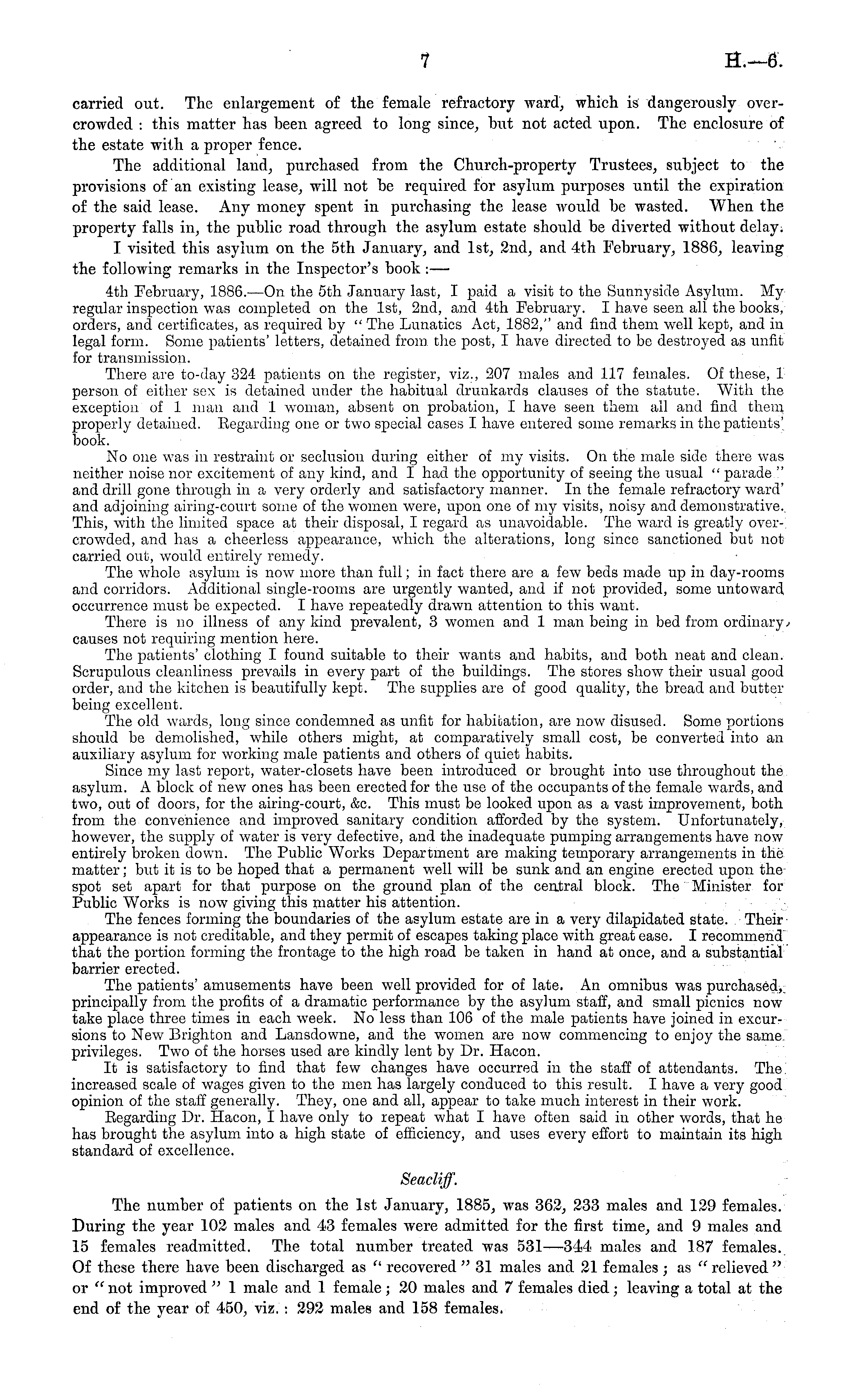 carried out. The enlargement of the female refractory ward, which is dangerously overcrowded : this matter has been agreed to long since, hut not acted upon. The enclosure of the estate with a proper fence. The additional land, purchased from the Church-property Trustees, subject to the provisions of an existing lease, will not be required for asylum purposes until the expiration of the said lease. Any money spent in purchasing the lease would be wasted. When the property falls in, the public road through the asylum estate should be diverted without delay. I visited this asylum on the sth January, and Ist, 2nd, and 4th February, 1886, leaving the following remarks in the Inspector's book : — 4th February, 1886.—0n the sth January last, I paid a visit to the Bunnyside Asylum. My regular inspection was completed on the Ist, 2nd, and 4th February. I have seen all the books, orders, and certificates, as required by " The Lunatics Act, 1882," and find them well kept, and in legal form. Some patients' letters, detained from the post, I have directed to be destroyed as unfit for transmission. There are to-day 324 patients on the register, viz., 207 males and 117 females. Of these, 1 person of either sex is detained under the habitual drunkards clauses of the statute. With the exception of 1 man and 1 woman, absent on probation, I have seen them all and find them properly detained. Eegarding one or two special cases I have entered some remarks in the patients'. book. No one was in restraint or seclusion during either of my visits. On the male side there was neither noise nor excitement of any kind, and I had the opportunity of seeing the usual " parade " and drill gone through in a very orderly and satisfactory manner. In the female refractory ward' and adjoining airing-court some of the women were, upon one of my visits, noisy and demonstrative.. This, with the limited space at their disposal, I regard as unavoidable. The ward is greatly overcrowded, and has a cheerless appearance, which the alterations, long since sanctioned but not carried out, would entirely remedy. The whole asylum is now more than full; in fact there are a few beds made up in day-rooms and corridors. Additional single-rooms are urgently wanted, and if not provided, some untoward occurrence must be expected. I have repeatedly drawn attention to this want. There is no illness of any kind prevalent, 3 women and 1 man being in bed from ordinarycauses not requiring mention here. The patients' clothing I found suitable to their wants and habits, and both neat and clean. Scrupulous cleanliness prevails in every part of the buildings. The stores show their usual good order, and the kitchen is beautifully kept. The supplies are of good quality, the bread and butter being excellent. The old wards, long since condemned as unfit for habitation, are now disused. Some portions should be demolished, while others might, at comparatively small cost, be converted into an auxiliary asylum for working male patients and others of quiet habits. Since my last report, water-closets have been introduced or brought into use throughout the asylum. A block of new ones has been erected for the use of the occupants of the female wards, and two, out of doors, for the airing-court, &c. This must be looked upon as a vast improvement, both from the convenience and improved sanitary condition afforded by the system. Unfortunately, however, the supply of water is very defective, and the inadequate pumping arrangements have now entirely broken down. The Public Works Department are making temporary arrangements in the matter; but it is to be hoped that a permanent well will be sunk and an engine erected upon the spot set apart for that purpose on the ground plan of the central block. The Minister for Public Works is now giving this matter his attention. The fences forming the boundaries of the asylum estate are in a very dilapidated state. Their appearance is not creditable, and they permit of escapes taking place with great ease. I recommend that the portion forming the frontage to the high road be taken in hand at once, and a substantial barrier erected. The patients' amusements have been well provided for of late. An omnibus was purchased, principally from the profits of a dramatic performance by the asylum staff, and small picnics now take place three times in each week. No less than 106 of the male patients have joined in excursions to New Brighton and Lansdowne, and the women are now commencing to enjoy the same privileges. Two of the horses used are kindly lent by Dr. Hacon. It is satisfactory to find that few changes have occurred in the staff of attendants. The increased scale of wages given to the men has largely conduced to this result. I have a very good opinion of the staff generally. They, one and all, appear to take much interest in their work. Regarding Dr. Hacon, I have only to repeat what I have often said in other words, that he has brought the asylum into a high state of efficiency, and uses every effort to maintain its high standard of excellence. Seacliff. The number of patients on the Ist January, 1885, was 362, 233 males and 129 females. During the year 102 males and 43 females were admitted for the first time, and 9 males and 15 females readmitted. The total number treated was 531 —344 males and 187 females. Of these there have been discharged as " recovered " 31 males and 21 females ; as " relieved " or " not improved " 1 male and 1 female; 20 males and 7 females died; leaving a total at the end of the year of 450, viz. i 292 males and 158 females.