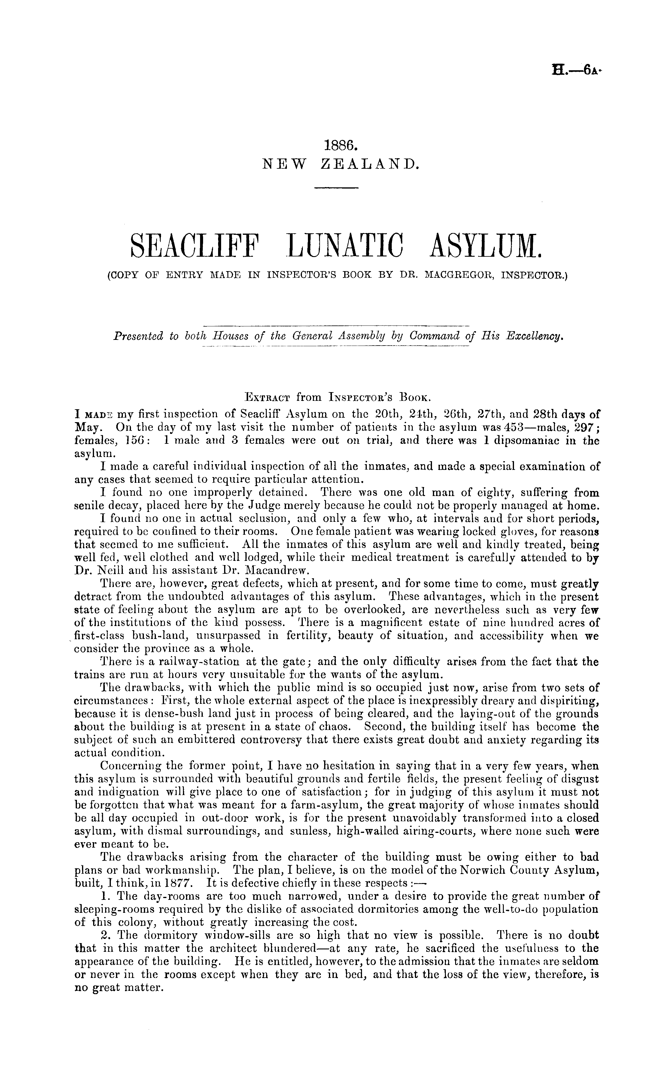 SEACLIFF LUNATIC ASYLUM. (COPY OF ENTRY MADE IN INSPECTOR'S BOOK BY DR. MACGREGOR, INSPECTOR.)