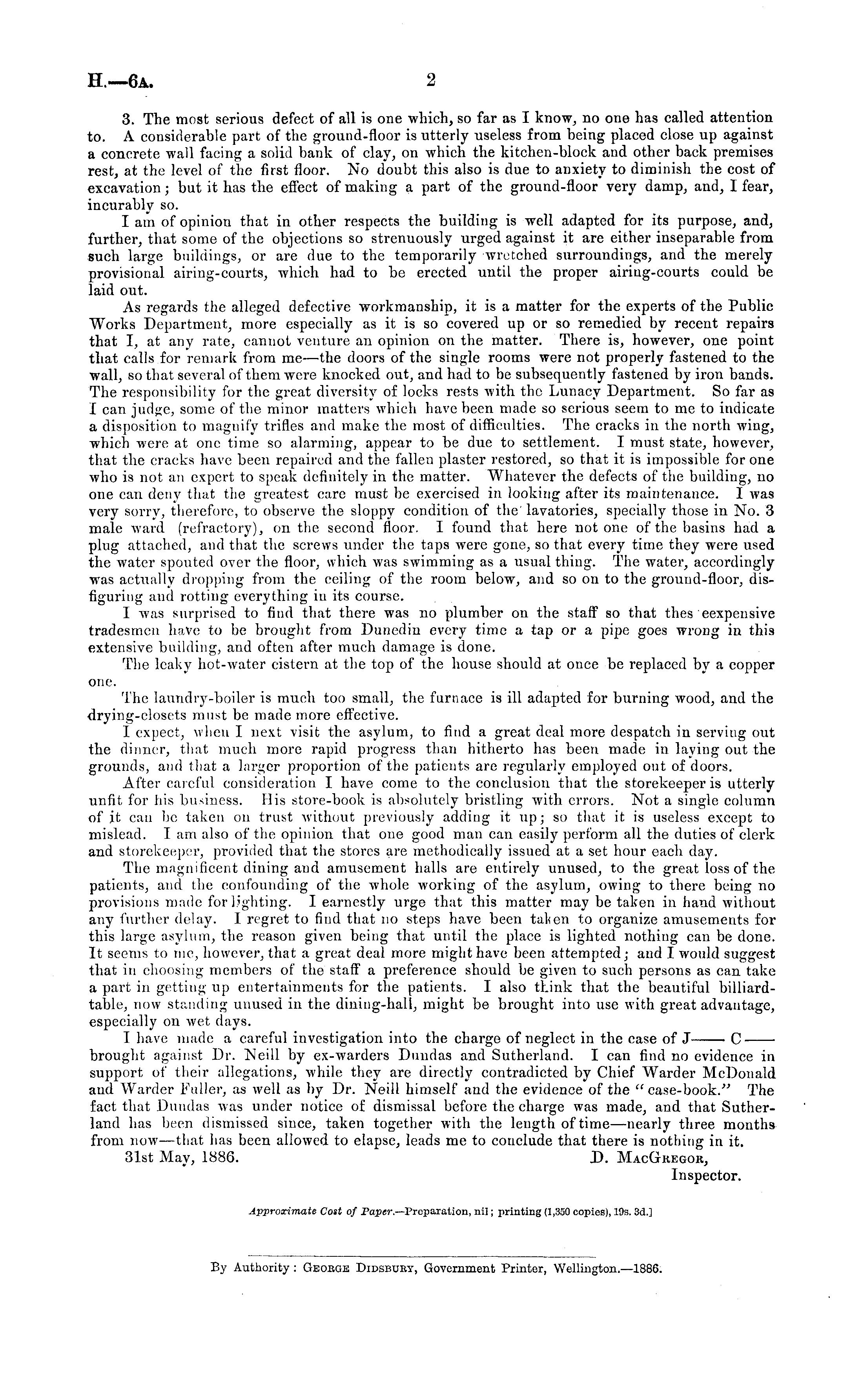 3. The most serious defect of all is one which, so far as I know, no one has called attention to. A considerable part of the ground-floor is utterly useless from being placed close up against a concrete wall facing a solid bank of clay, on which the kitchen-block and other back premises rest, at the level of the first floor. No doubt this also is due to anxiety to diminish the cost of excavation; but it has the effect of making a part of the ground-floor very damp, and, I fear, incurably so. I am of opinion that in other respects the building is well adapted for its purpose, and, further, that some of the objections so strenuously urged against it are either inseparable from such large buildings, or are due to the temporarily wretched surroundings, and the merely provisional airing-courts, which had to be erected until the proper airiug-courts could be laid out. As regards the alleged defective workmanship, it is a matter for the experts of the Public Works Department, more especially as it is so covered up or so remedied by recent repairs that I, at any rate, cannot venture an opinion on the matter. There is, however, one point that calls for remark from me—the doors of the single rooms were not properly fastened to the wall, so that several of them were knocked out, and had to be subsequently fastened by iron bands. The responsibility for the great diversity of locks rests with the Lunacy Department. So far as I can judge, some of the minor matters which have been made so serious seem to me to indicate a disposition to magnify trifles and make the most of difficulties. The cracks in the north wing, which were at one time so alarming, appear to be due to settlement. I must state, however, that the cracks have been repaired and the fallen plaster restored, so that it is impossible for one who is not an expert to speak definitely in the matter. Whatever the defects of the building, no one can deny that the greatest care must be exercised in looking after its maintenance. I was very sorry, therefore, to observe the sloppy condition of the lavatories, specially those in No. 3 male ward (refractory), on the second floor. I found that here not one of the basins had a plug attached, and that the screws under the taps were gone, so that every time they were used the water spouted over the floor, which was swimming as a usual thing. The water, accordingly was actually dropping from the ceiling of the room below, and so on to the ground-floor, disfiguring and rotting everything in its course. I was surprised to find that there was no plumber on the staff so that thes eexpensive tradesmen have to be brought from Dunedin every time a tap or a pipe goes wrong in this extensive building, and often after much damage is done. The leaky hot-water cistern at the top of the house should at once be replaced by a copper one. The laundry-boiler is much too small, the furnace is ill adapted for burning wood, and the drying-closets must be made more effective. I expect, when I next visit the asylum, to find a great deal more despatch in serving out the dinner, that much more rapid progress than hitherto has been made in laying out the grounds, and that a larger proportion of the patients are regularly employed out of doors. After careful consideration I have come to the conclusion that the storekeeper is utterly unfit for his business. His store-book is absolutely bristling with errors. Not a single column of it can be taken on trust without previously adding it up; so that it is useless except to mislead. lam also of the opinion that one good man can easily perform all the duties of clerk and storekeeper, provided that the stores are methodically issued at a set hour each day. The magnificent dining and amusement halls are entirely unused, to the great loss of the patients, and the confounding of the whole working of the asylum, owing to there being no provisions made for lighting. I earnestly urge that this matter may be taken in hand without any further delay. I regret to find that no steps have been tali en to organize amusements for this large asylum, the reason given being that until the place is lighted nothing can be done. It seems to me, however, that a great deal more might have been attempted; and I would suggest that in choosing members of the staff a preference should be given to such persons as can take a part in getting up entertainments for the patients. I also think that the beautiful billiardtable, now standing unused in the dining-hall, might be brought into use with great advantage, especially on wet days. I have made a careful investigation into the charge of neglect in the case of J C brought against Dr. Ncill by ex-warders Dundas and Sutherland. I can find no evidence in support of their allegations, while they are directly contradicted by Chief Warder McDonald and Warder Fuller, as well as by Dr. Neill himself and the evidence of the "case-book." The fact that Duudas was under notice of dismissal before the charge was made, and that Sutherland has been dismissed since, taken together with the length of time —nearly three months from now —that has been allowed to elapse, leads me to conclude that there is nothing in it. 31st May, 1886. D. MacGkegor, Inspector. Approximate Cost of Paper.— Preparation, nil; printing (1,350 copies), 193. 3d.]