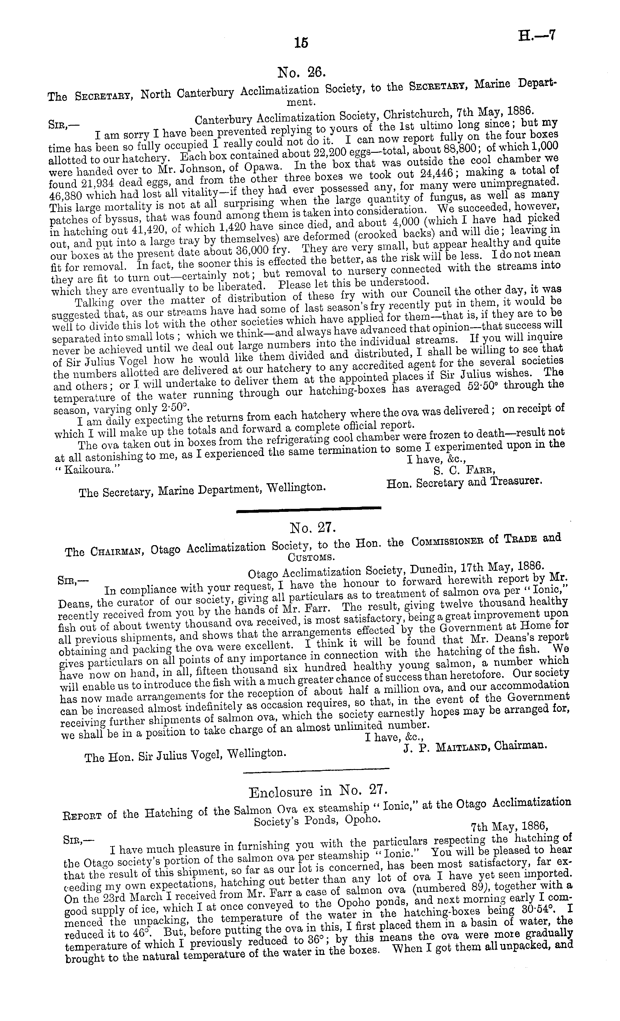 No. 27. The Chmkman, Otago Acclimatization Bock***. Hon. the Comm^ohbb of Tbabk and Otago Acclimatization Society, Dunedm, 17th May, 1886. SIE'- In compliance with your re.uesf, I J^^*^±££jP SS Deans, the curator of our socxety giving 1^; twelve thousand healthy recently received from you by the hands of Mr. Fair iesul*. g^ S i vement upon fish out of about twenty thousand ovarece^M^J"efected S« Government at Home for all previous shipments, and shows that th a^ &nf^\^% e Lmd that Mr. Deans's report obtaining and packing the ova were t™^*^™^ with the hatching of the fish. We gives particulars on aU points of any mipoiUncenconne & number which Lve now on hand, in all, fifteen heretofore. Our society will enable us to introduce the fish with amuchgrea™ia accommodation has now made arrangements for the JJ^SnU^B^iLttatho e'vent of the Government The Hon. Sir Julius Vogel. Wellington. 'I- P- Mn^ Chairman.